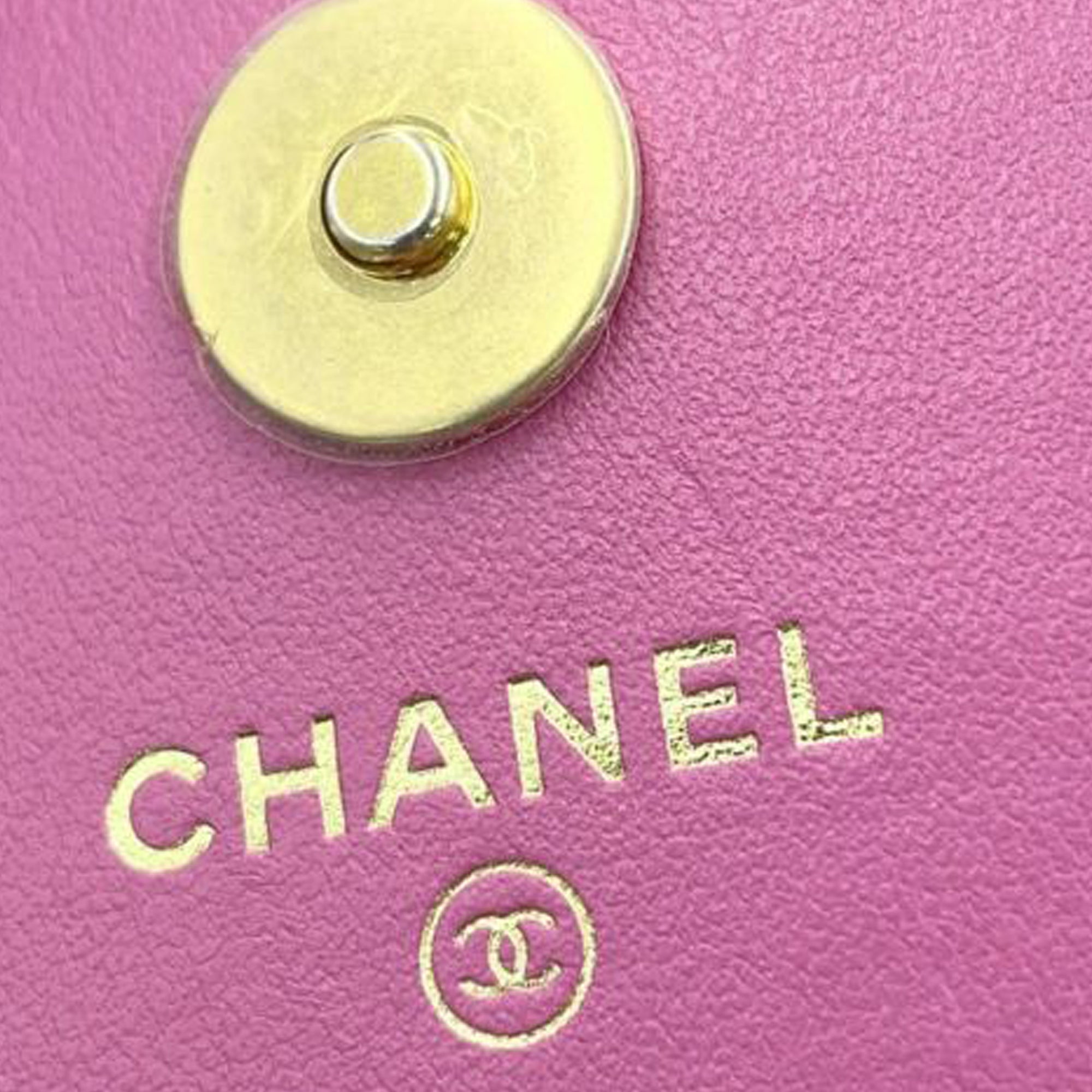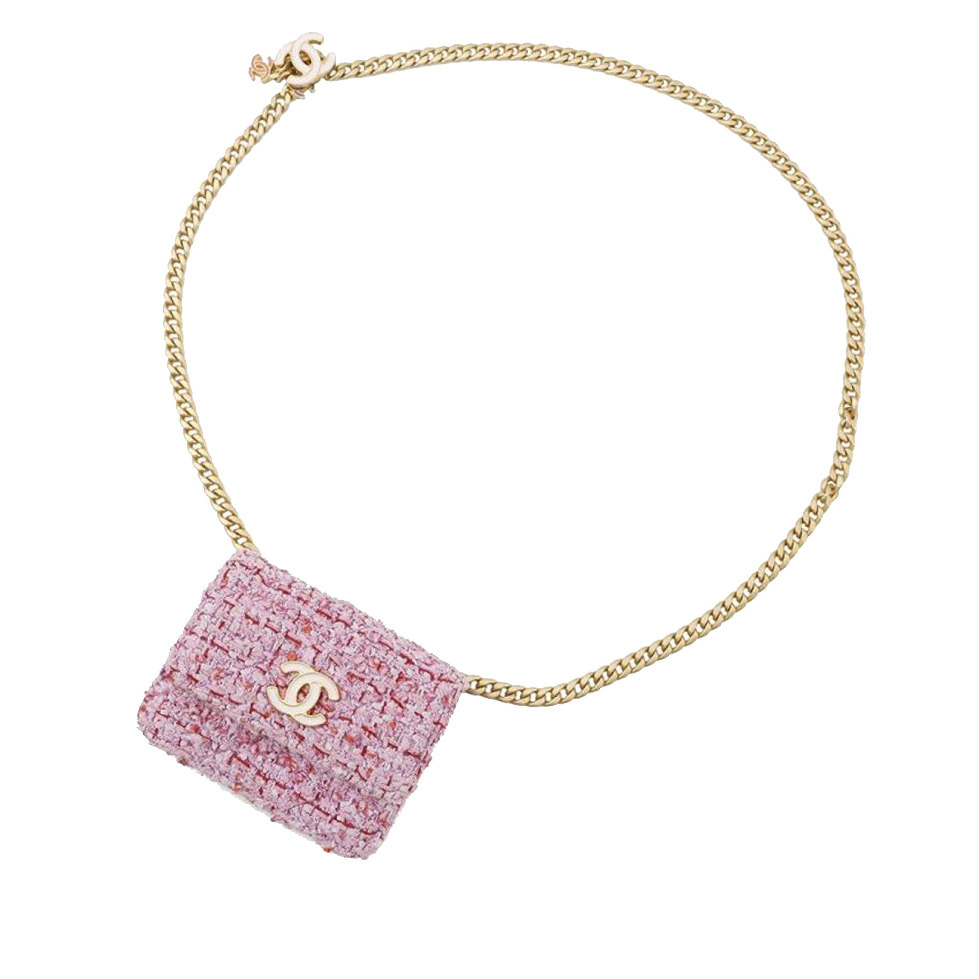 Product Details: Pink Chanel CC Quilted Tweed Flap Chain Belt Bag. This belt bag features a quilted tweed body, gold-tone chain link waist strap, and a front flap with turn lock closure. 3.9" L x 4.9" W x 1.6" D.