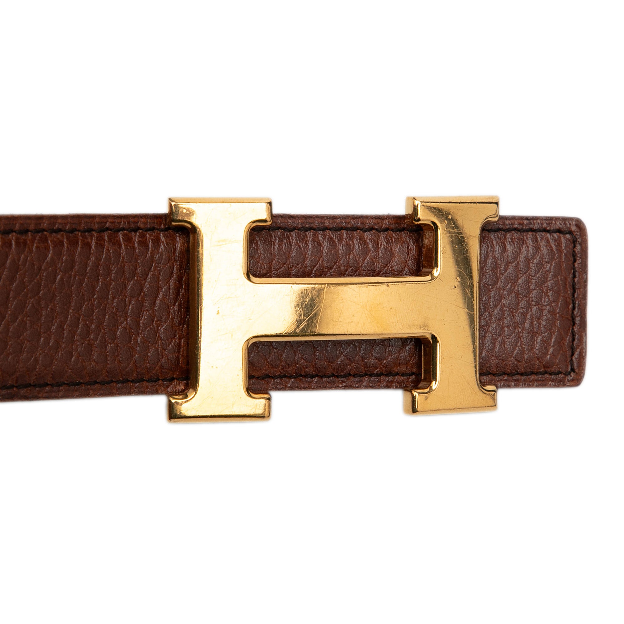 Product Details: Brown Hermès Togo Constance H Reversible Belt. This belt features a leather body, a gold-tone H buckle, and a peg in hole closure. 33.3" L x 1.2" W x 0" D. Serial number 〇Y.