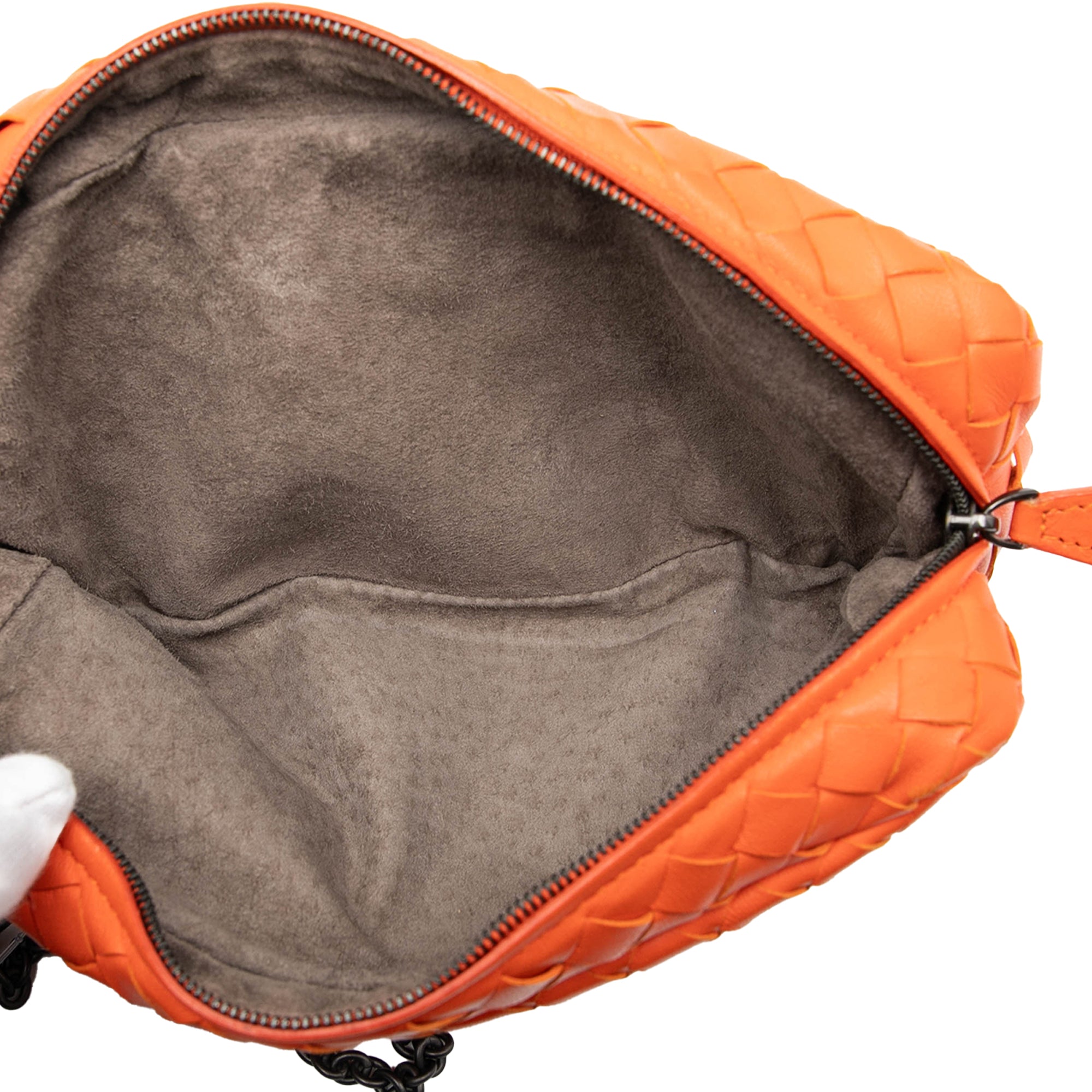 Please note this is a pre-owned item that may display signs of wear consistent with the condition listed above and shown in photos. Designer Revival guarantees this is an authentic Orange Bottega Veneta Mini Nappa Intrecciato Expandable Chain Flap Crossbody or 100% of your money back. Learn more about our authentication process.