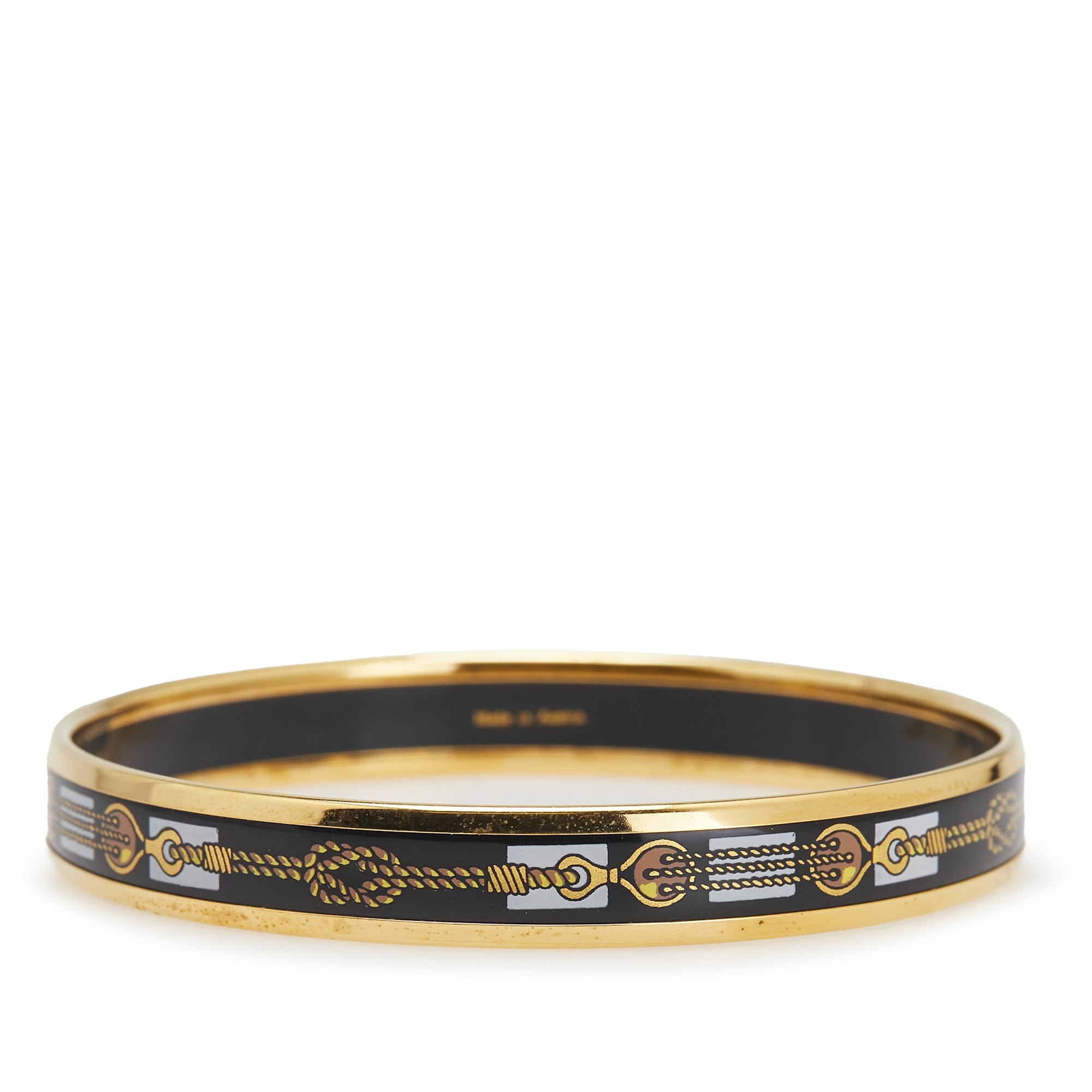 Product Details: Blue Hermès Narrow Enamel Rope Design Bangle 65 Costume Bracelet. This bracelet features a print on enamel and a gold-plated body. 7.6" L x 2.5" W x 0" D.