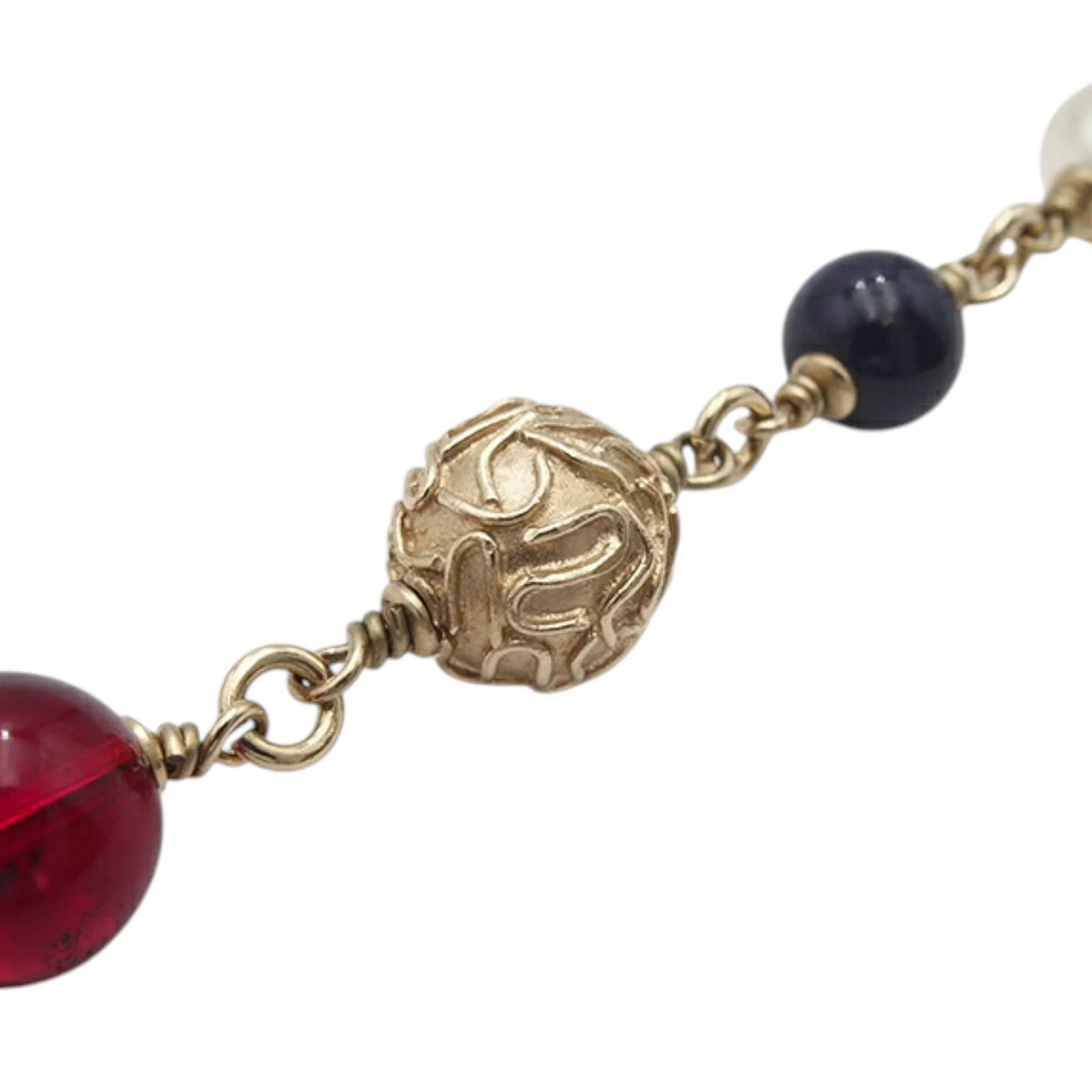 Product Details: Gold Chanel CC Gold Plated Faux Pearl Beaded Bracelet. This bracelet features a gold-tone metal body with faux pearl and beads details, and a lobster clasp closure. 8.5" L x 1.3" W x 0" D. Serial number B14S.