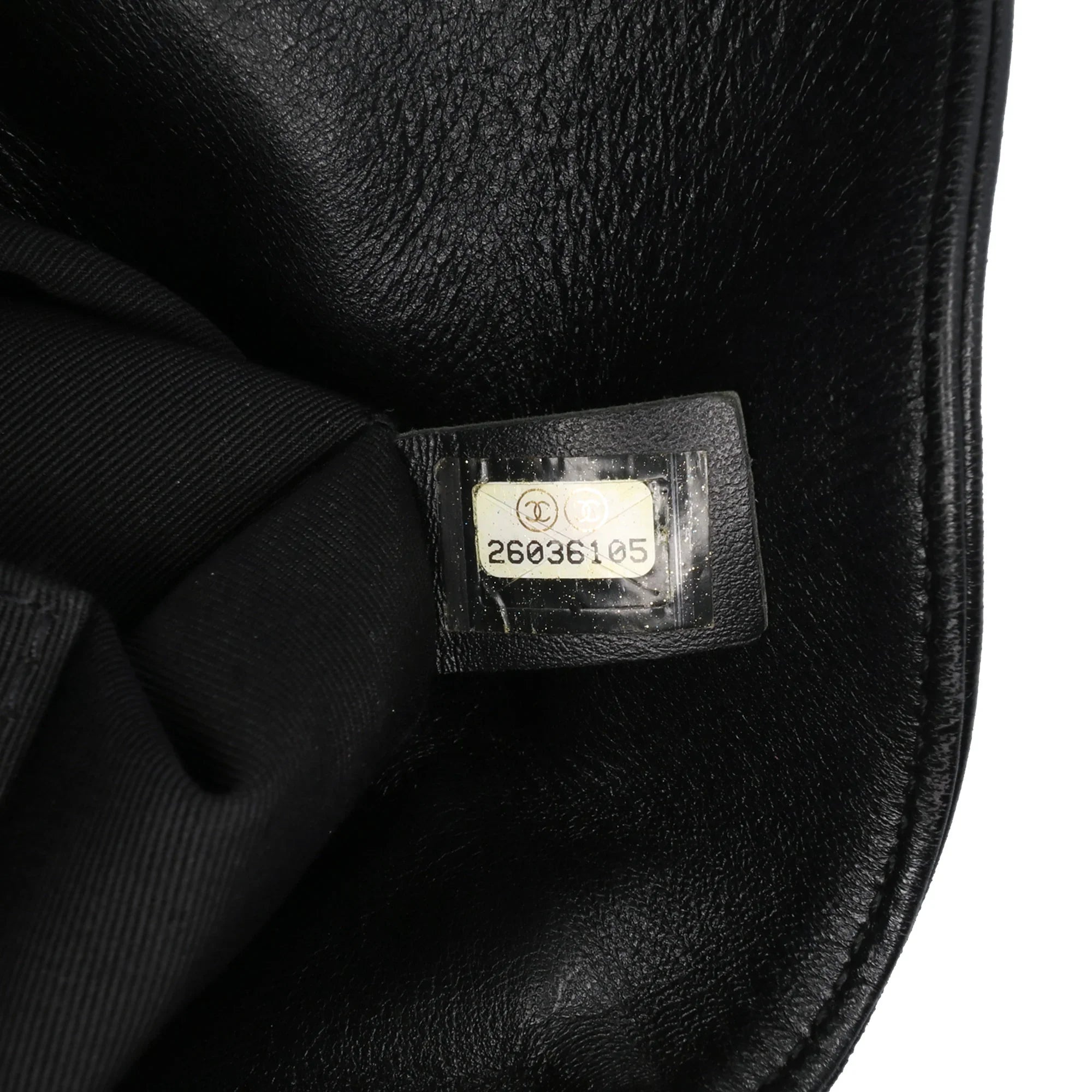 Product Details: Black Chanel Quilted Chevron Lambskin Handle with Chic Bucket Bag. This bucket bag features a quilted lambskin leather body, resin top handle, leather woven chain strap with flat leather shoulder guard, a top fold over flap with magnetic snap button closure, and an interior slip pocket. 5.5" L x 6.1" W x 4.3" D, 5.1" drop. Serial number 26036105.