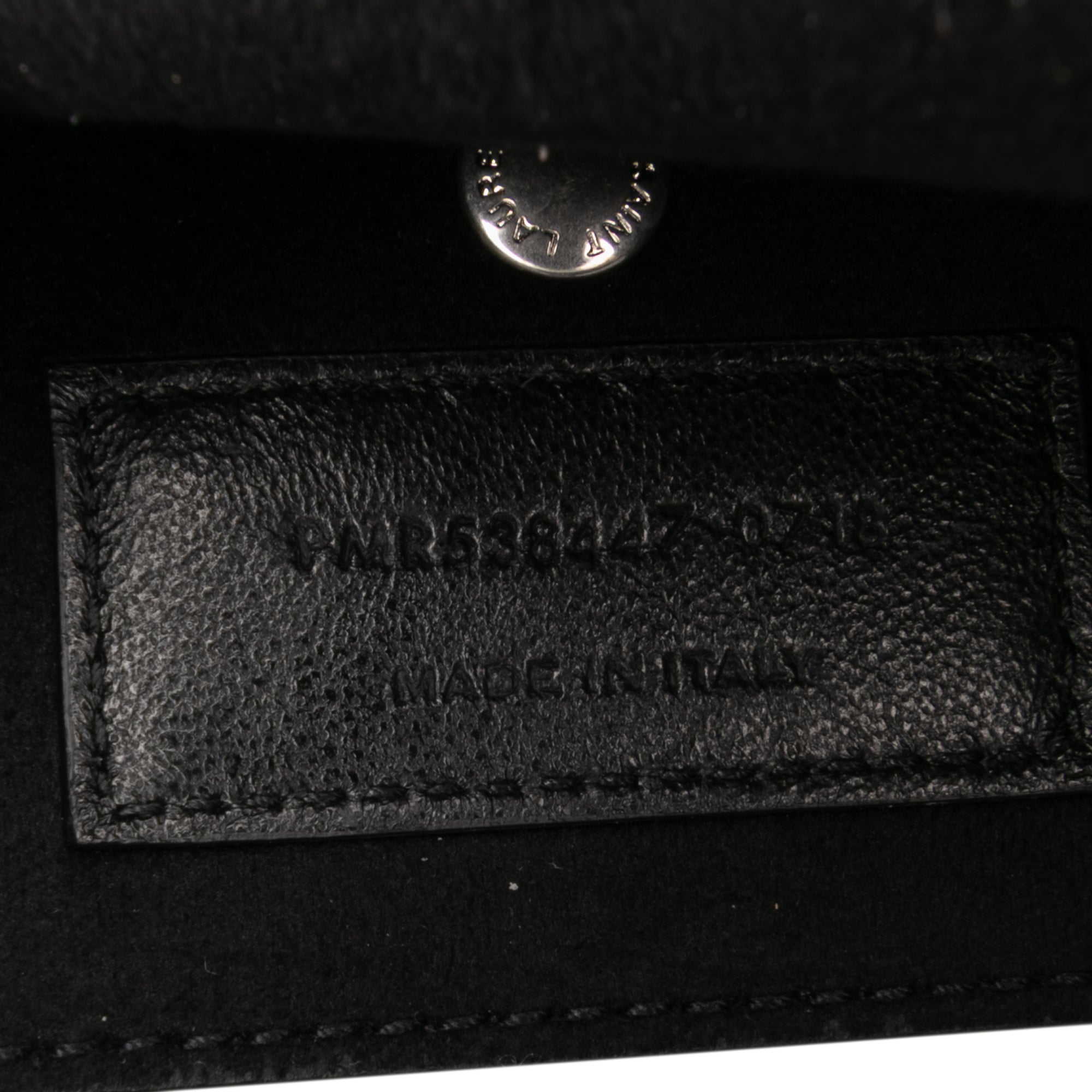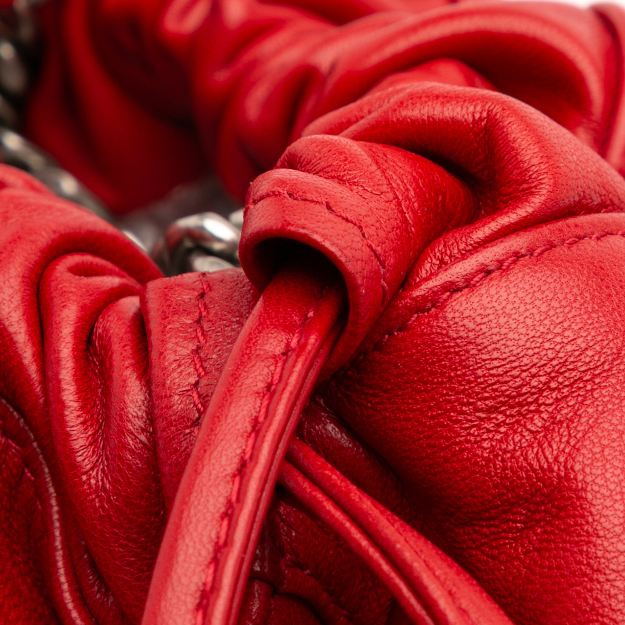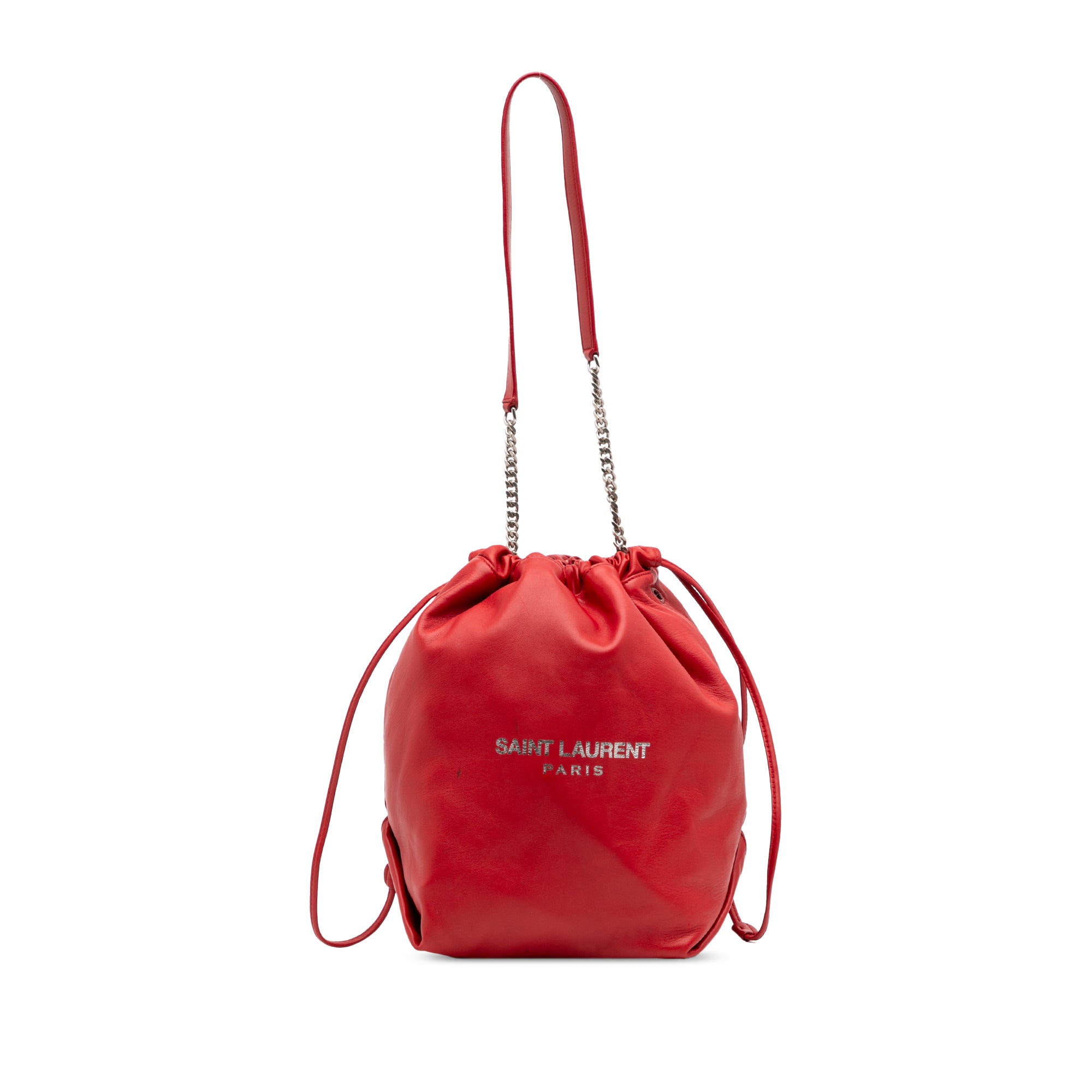 Product Details: Red Saint Laurent Lambskin Teddy Drawstring Bucket Bag. This bucket bag features a leather body, a silver-tone chain strap with leather guard, and an open top with a drawstring closure. 13" L x 7" W x 6" D. Serial number PMR538447 0718.