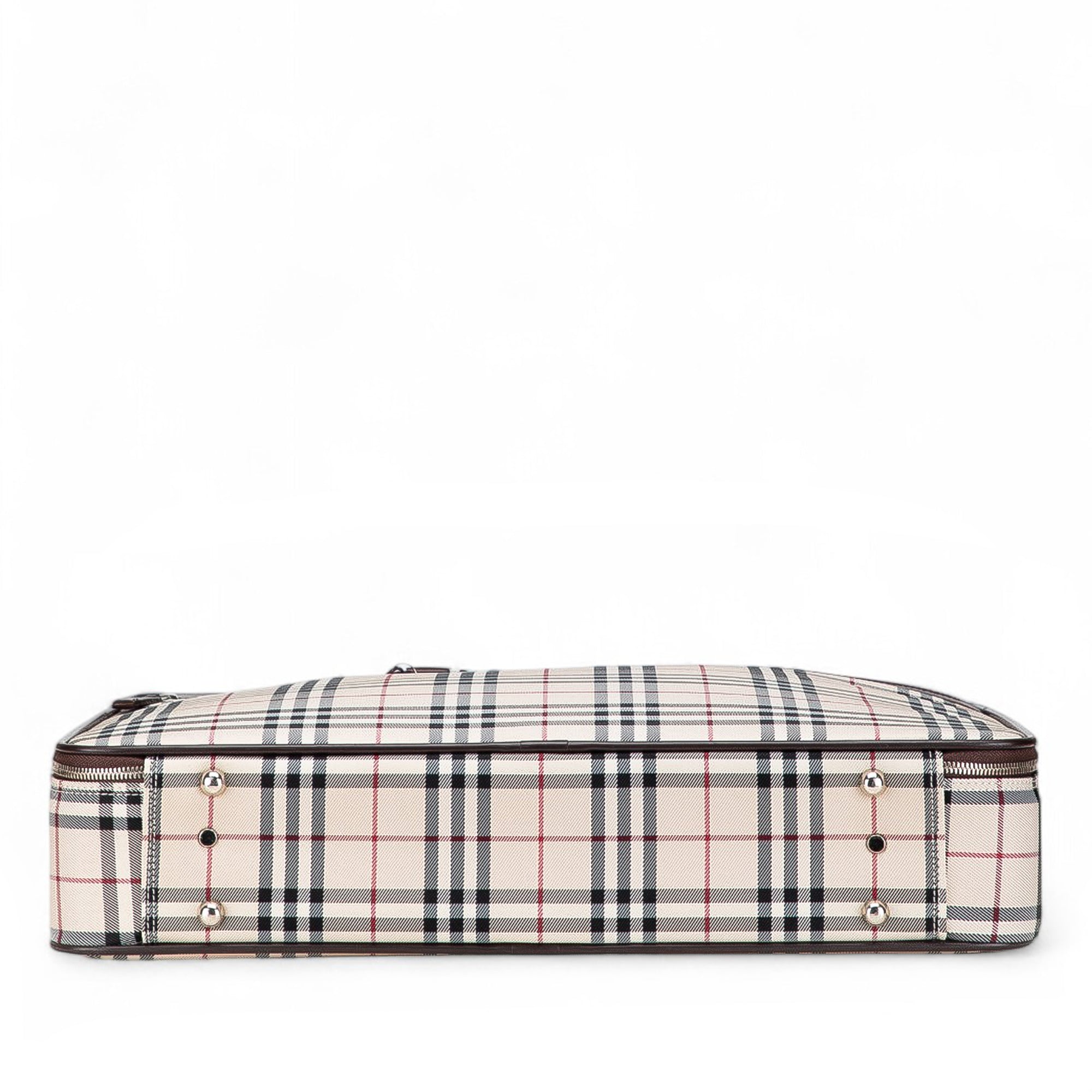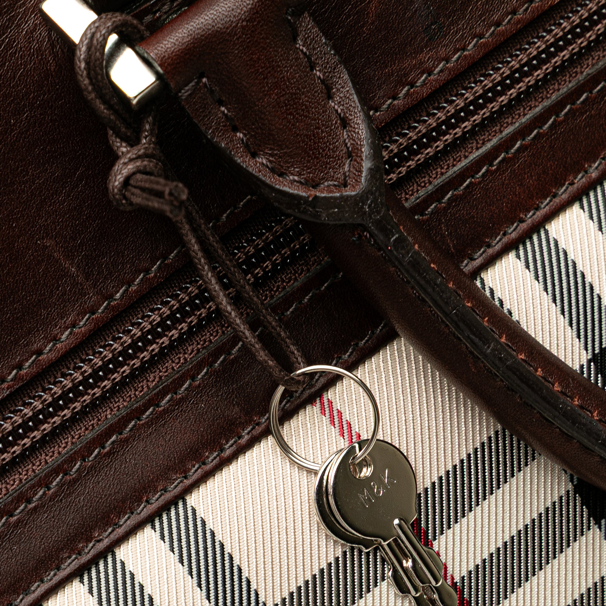 Product Details: Brown Burberry House Check Canvas Travel Bag. This travel bag features a house check canvas body with leather trim, rolled leather handles, dual zip-around closure, and exterior front and back zip pockets. 13.4" L x 19.7" W x 4.3" D, 3.9" drop.