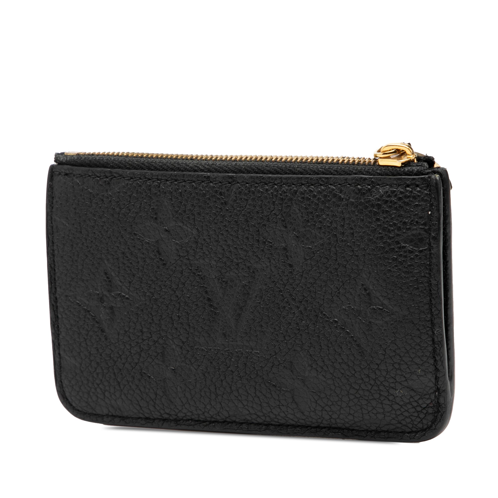 Product Details: Black Louis Vuitton Monogram Empreinte Romy Card Holder. The Romy card holder features a monogram empreinte leather body, a top zip closure, exterior card slots 3" L x 4.7" W x 0.4" D.