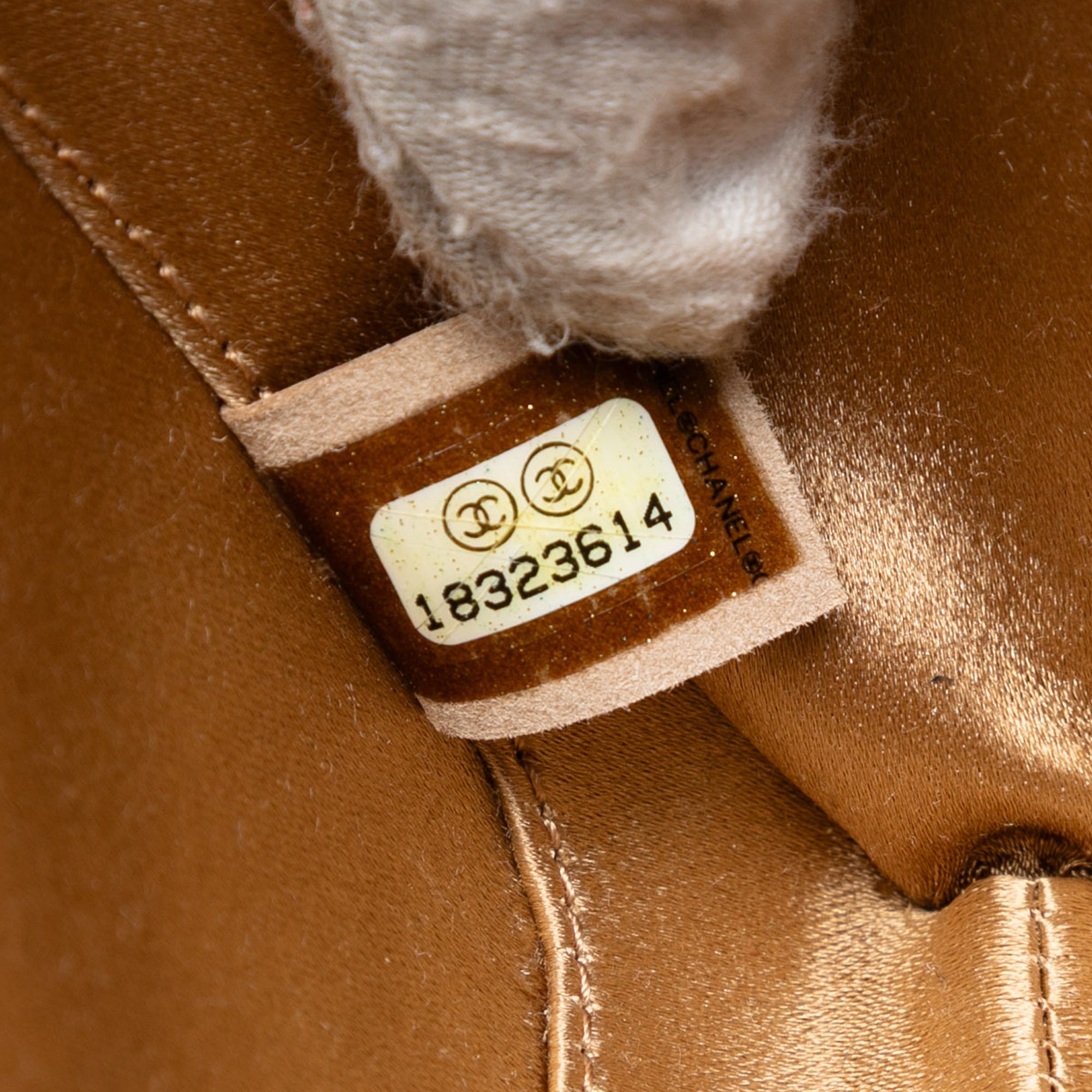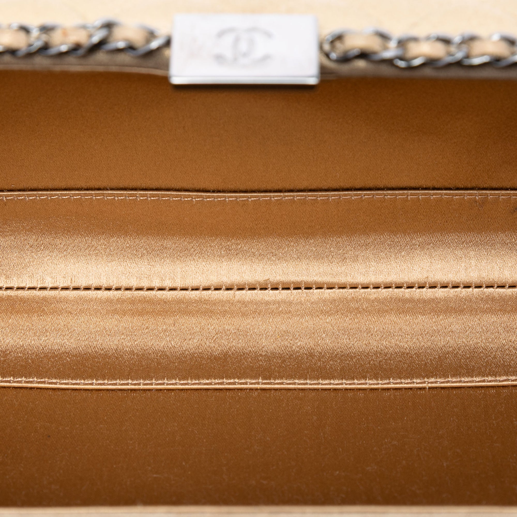 Product Details: Gold Chanel Quilted Metallic Suede Chain Around Evening Clutch on Chain Crossbody Bag. This crossbody bag features a quilted metallic suede leather body, a leather woven chain shoulder strap, and a kiss lock closure. 4.3" L x 8.7" W x 0.6" D. Serial number 18323614.