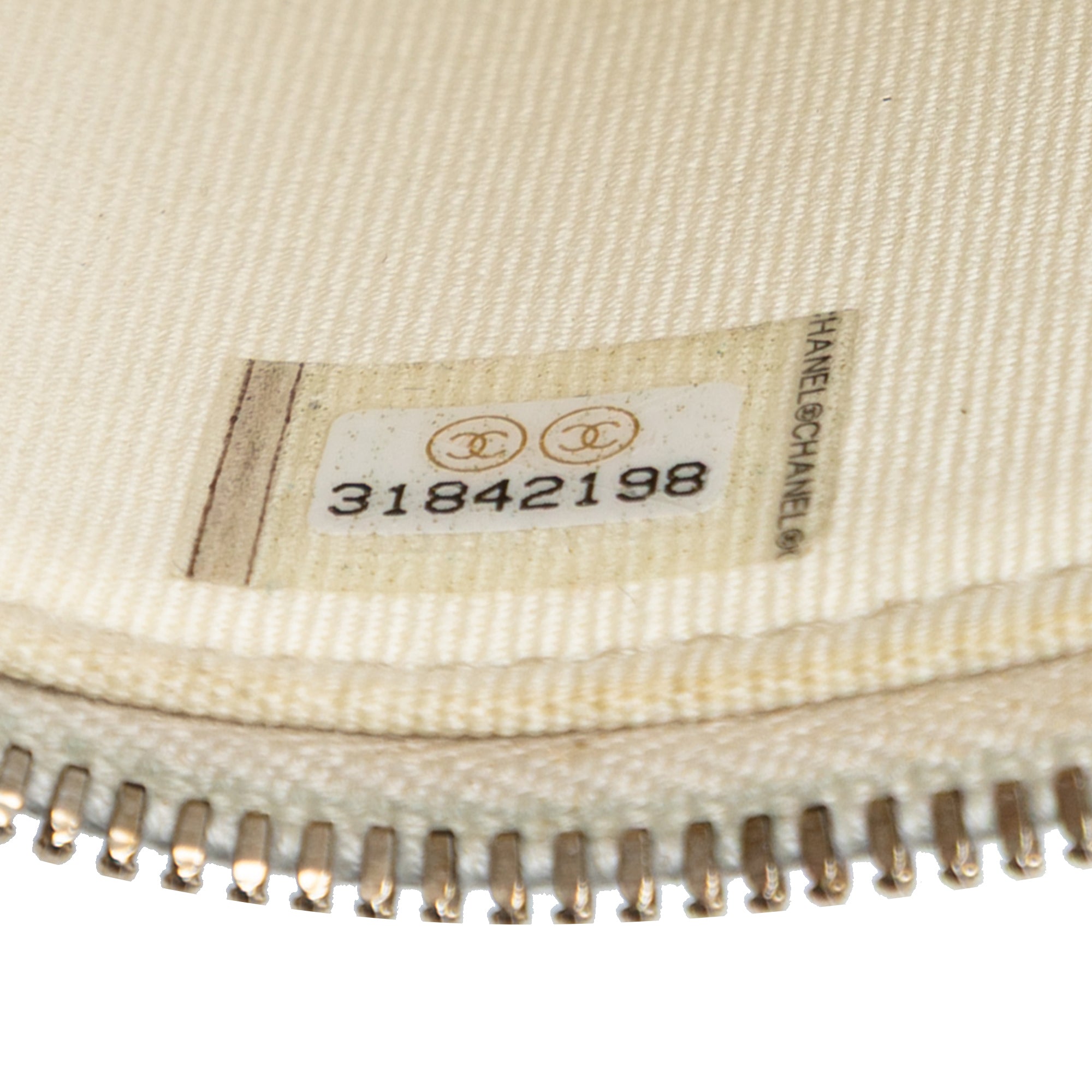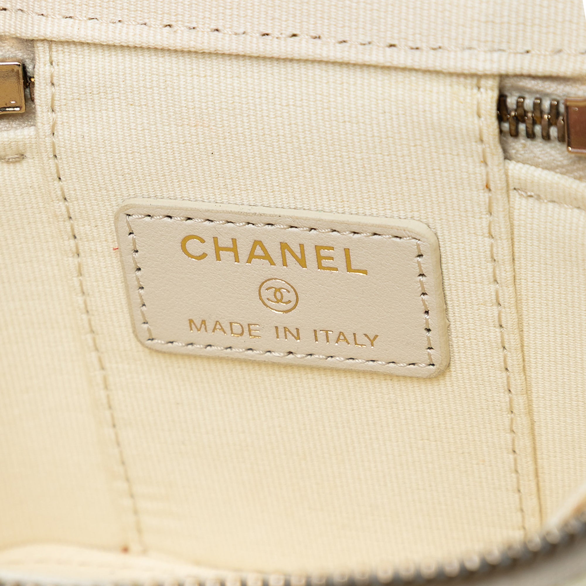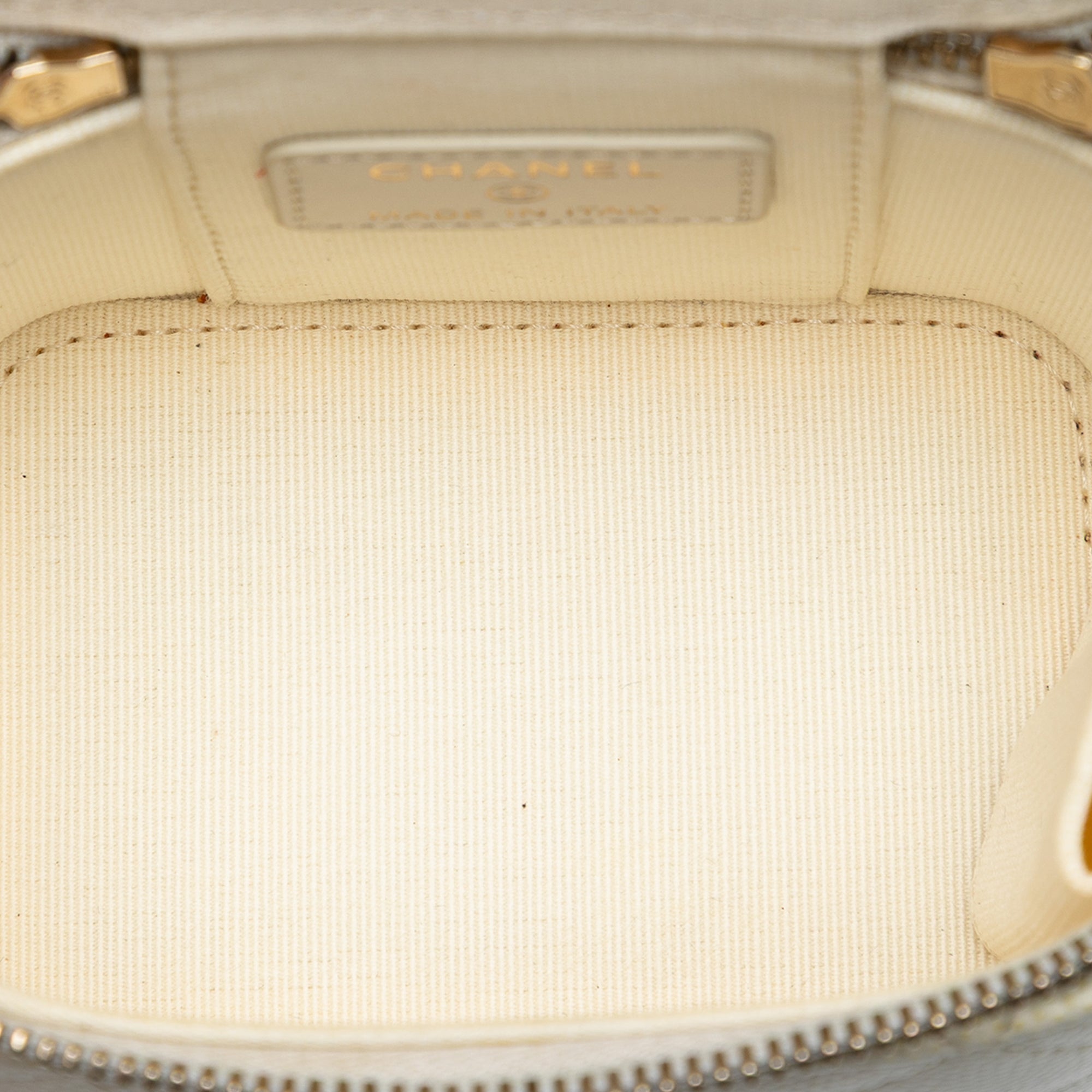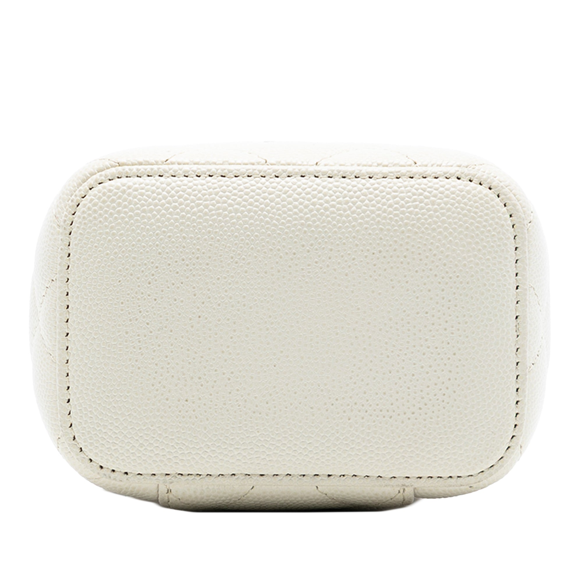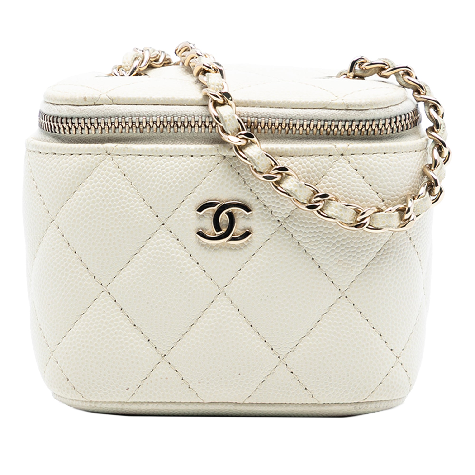 Product Details: White Chanel Mini CC Quilted Caviar Vanity Case with Chain Crossbody Bag. This crossbody bag features a quilted caviar leather body, a leather woven chain strap, a zip-around closure, and interior slip pockets. 3.5" L x 4.1" W x 2.8" D. Serial number 31842198.