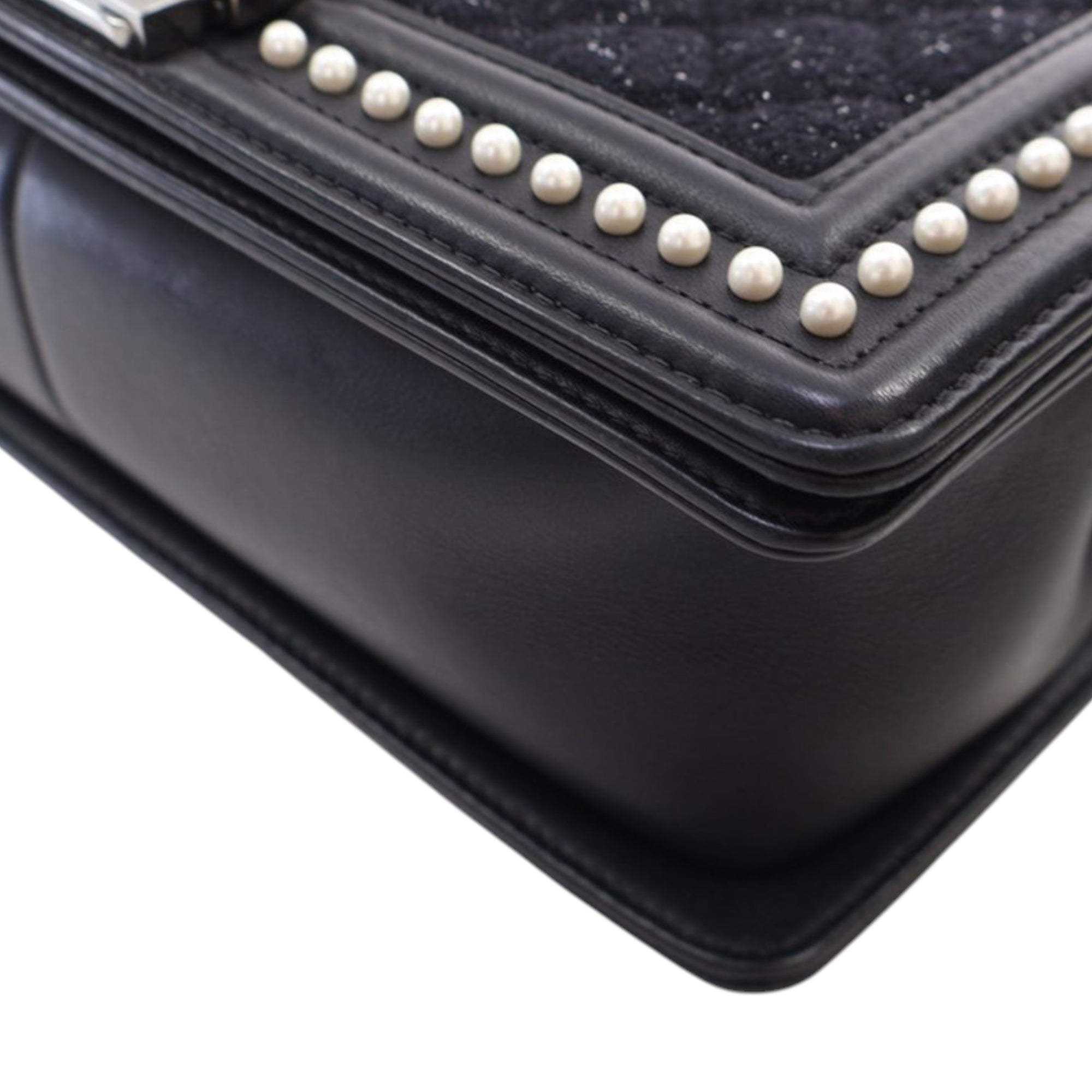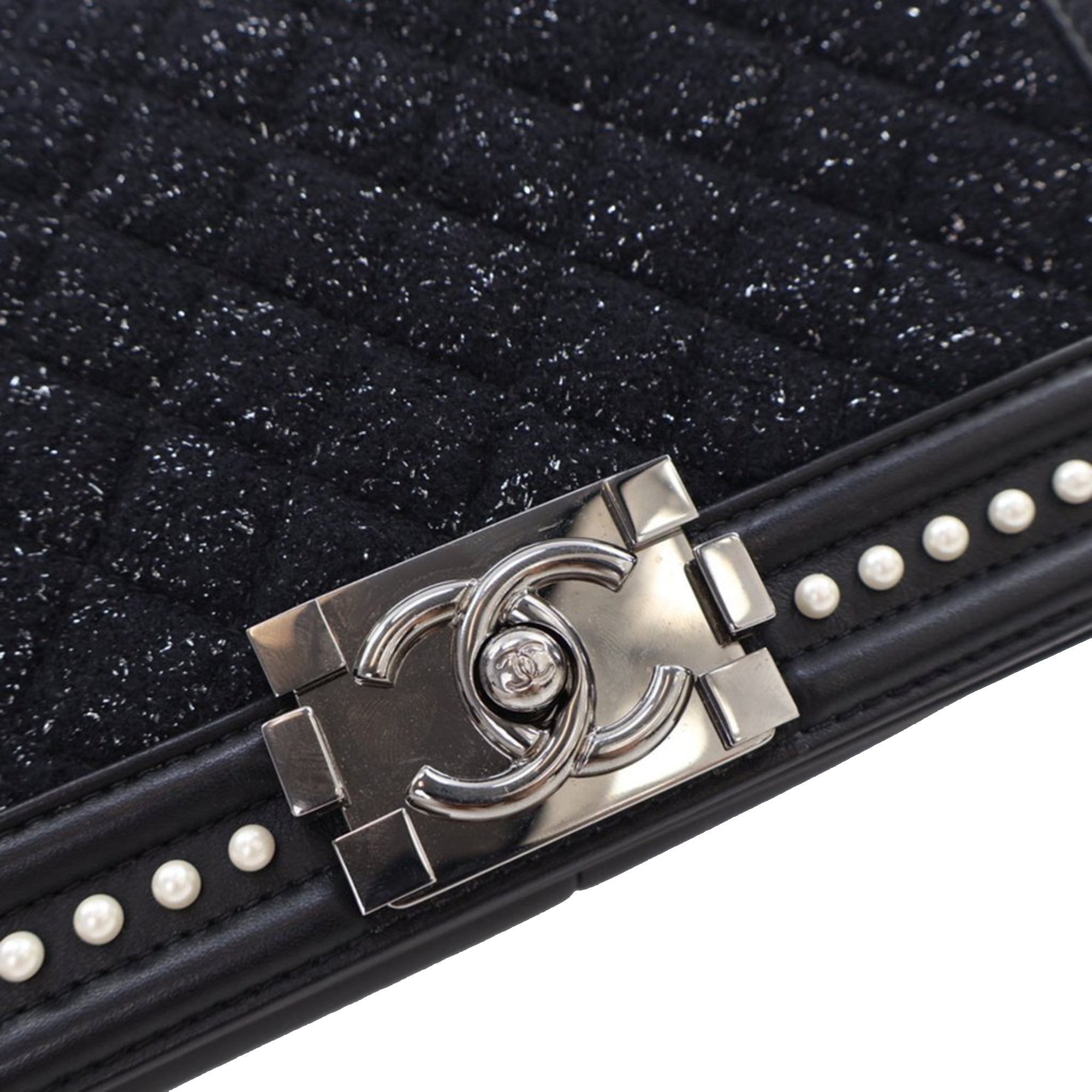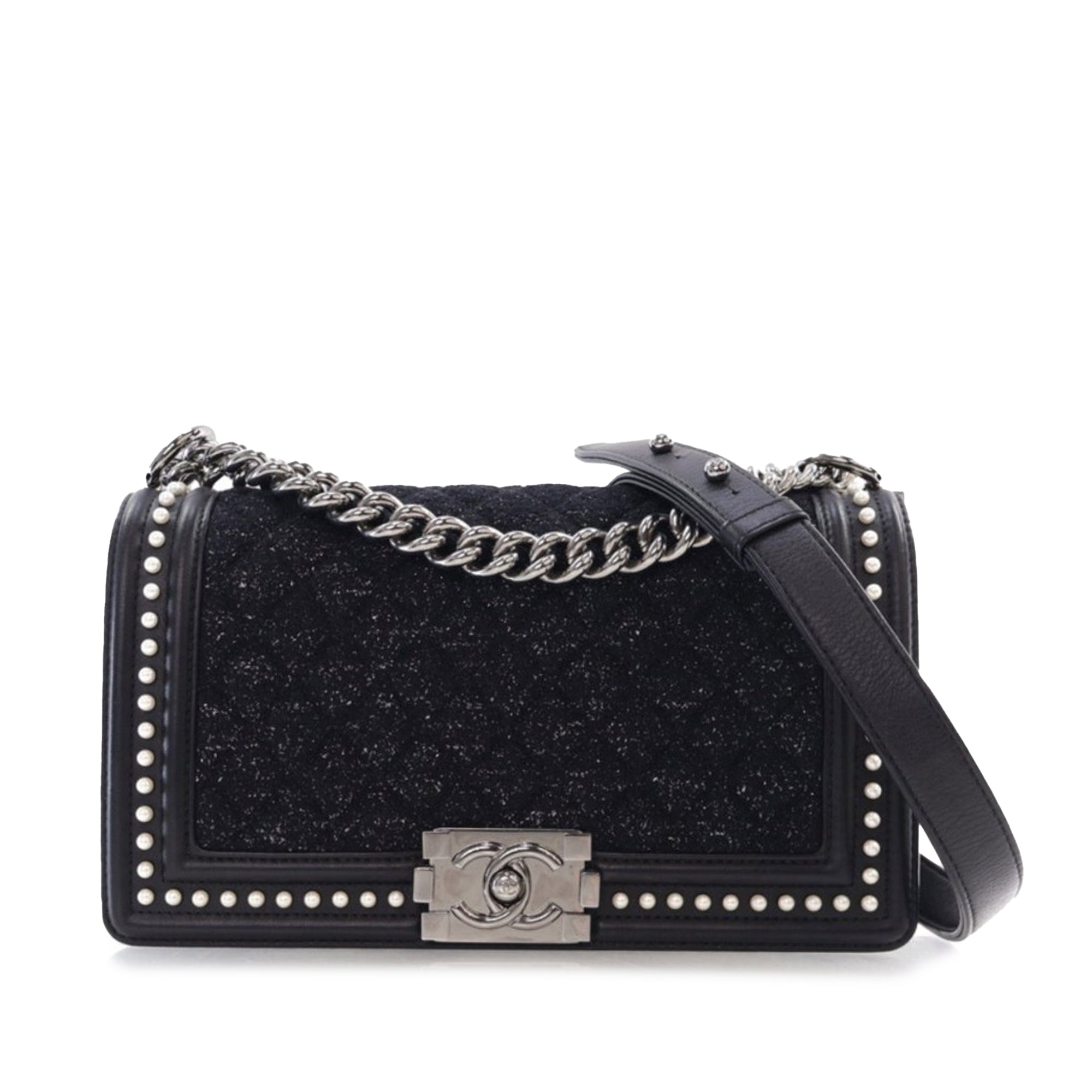 Black Chanel Old Medium Quilted Tweed and Calfskin Pearl Boy Flap Crossbody Bag