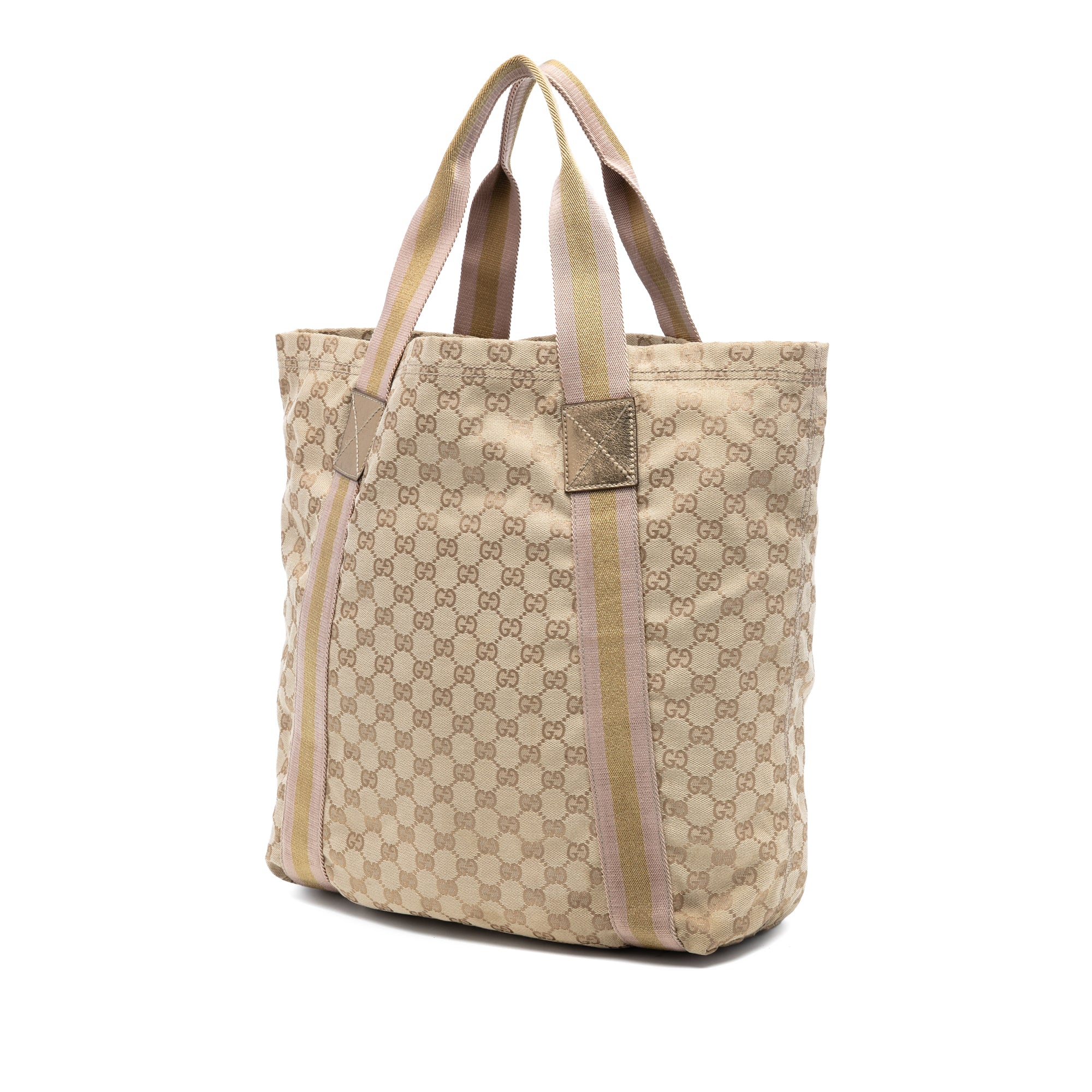 Product Details: Brown Gucci GG Canvas Web Tote. This tote bag features a canvas body, flat straps, an open top, and interior slip pockets. 14.6" L x 13.2" W x 4.7" D, 6.9" drop. Serial number 189669 467891.