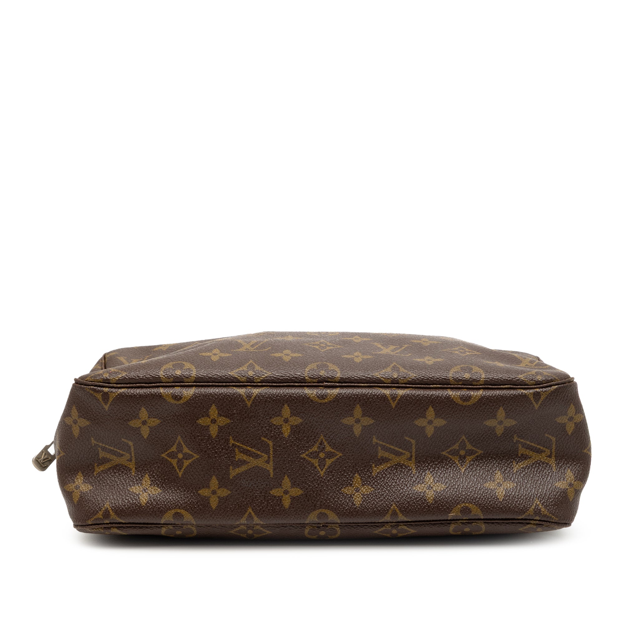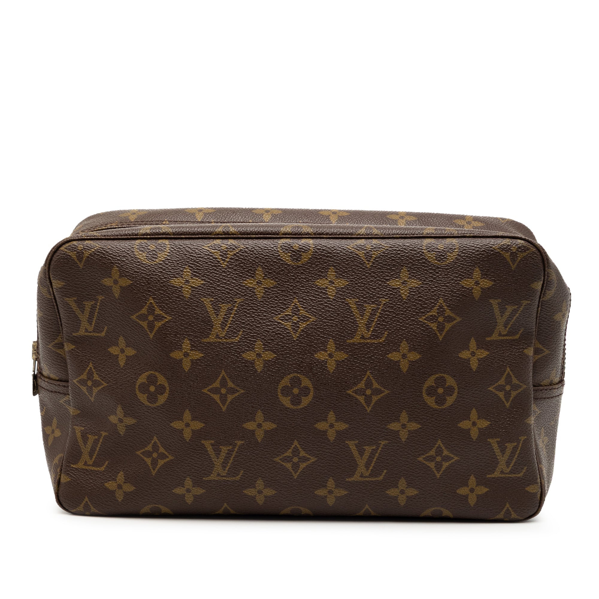 Product Details: Brown Louis Vuitton Monogram Trousse Toilette 28 Clutch Bag. The Trousse Toilette 28 features a monogram canvas body, a top zip closure, and an interior slip pocket. 6.7" L x 11" W x 3.3" D.