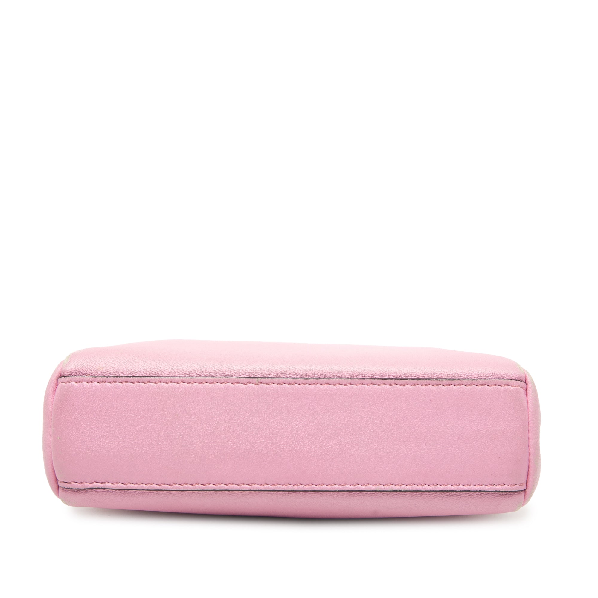 Product Details: Pink Fendi Micro Leather Peekaboo Satchel. The Micro Peekaboo features a leather body, a flat leather handle, a detachable and adjustable flat leather strap, a twist lock closure, and an interior slip pocket. 4.3" L x 5.9" W x 1.8" D, 2.4" drop. Serial number 8M0855 K47 159 053.