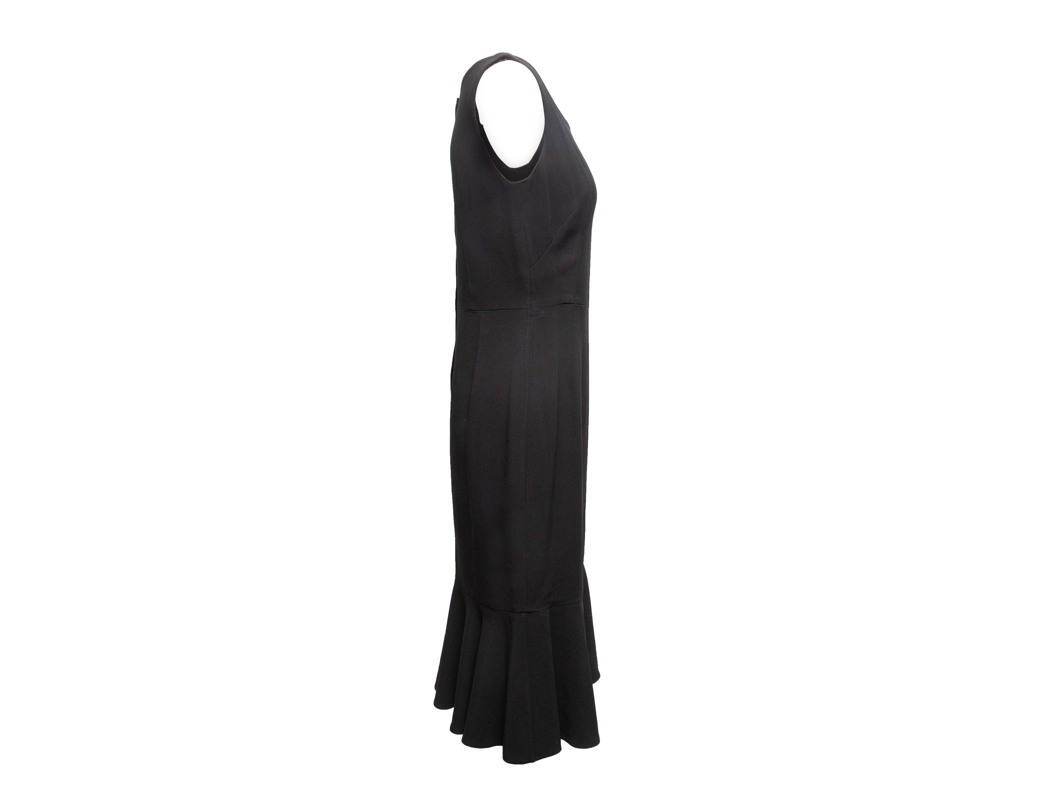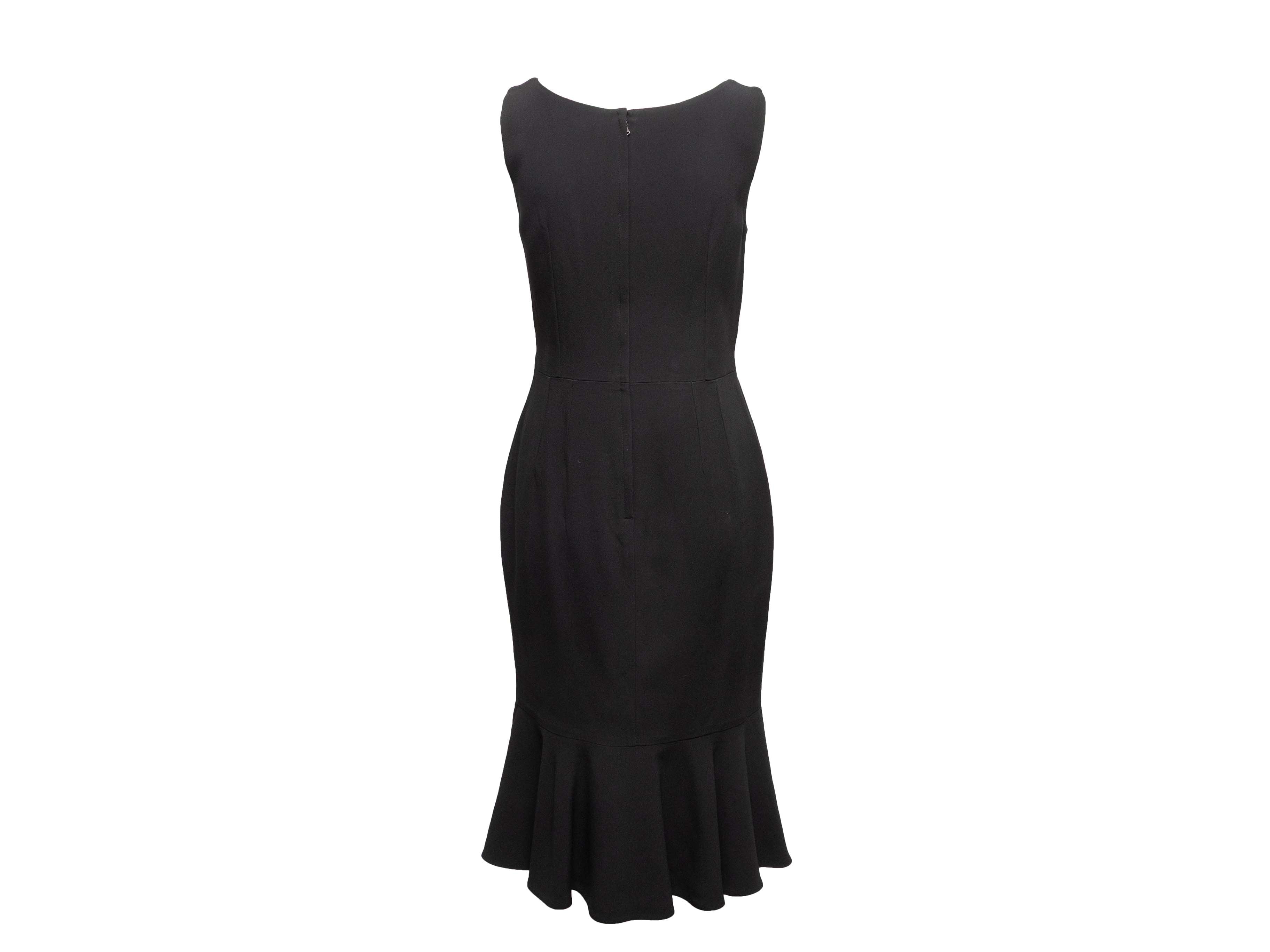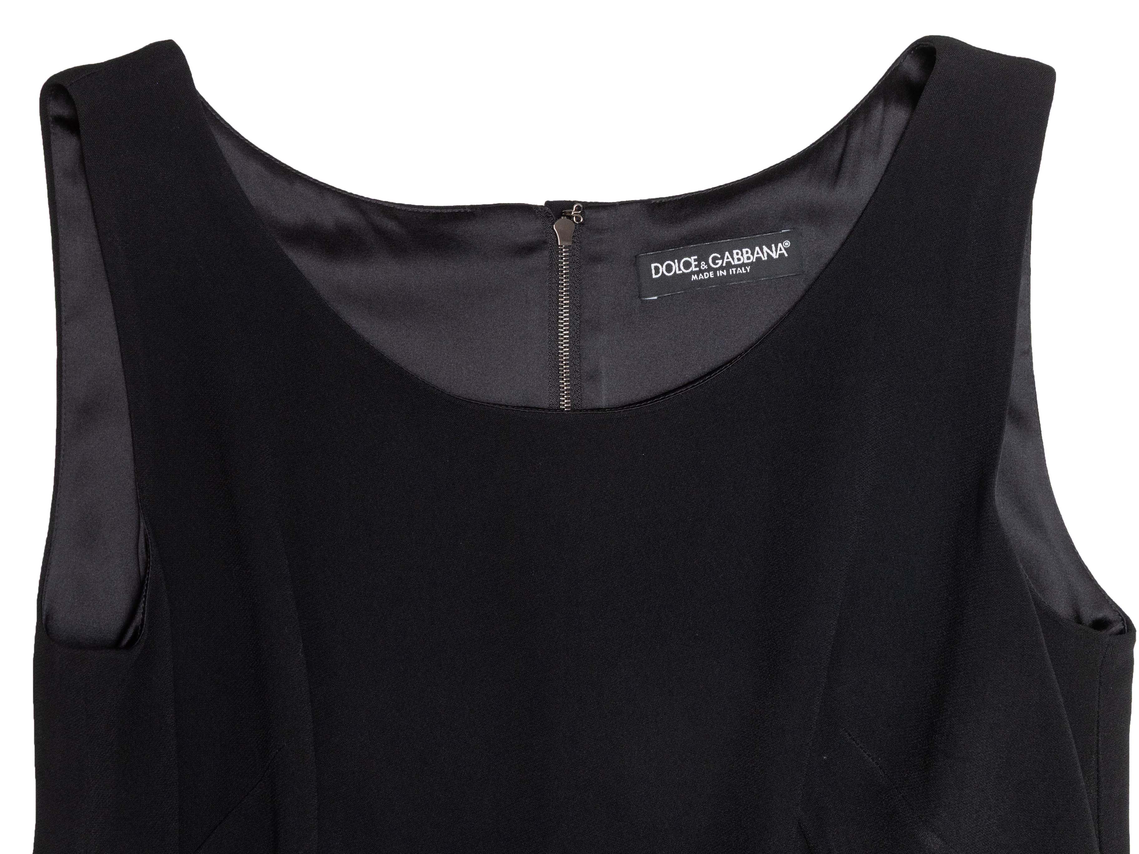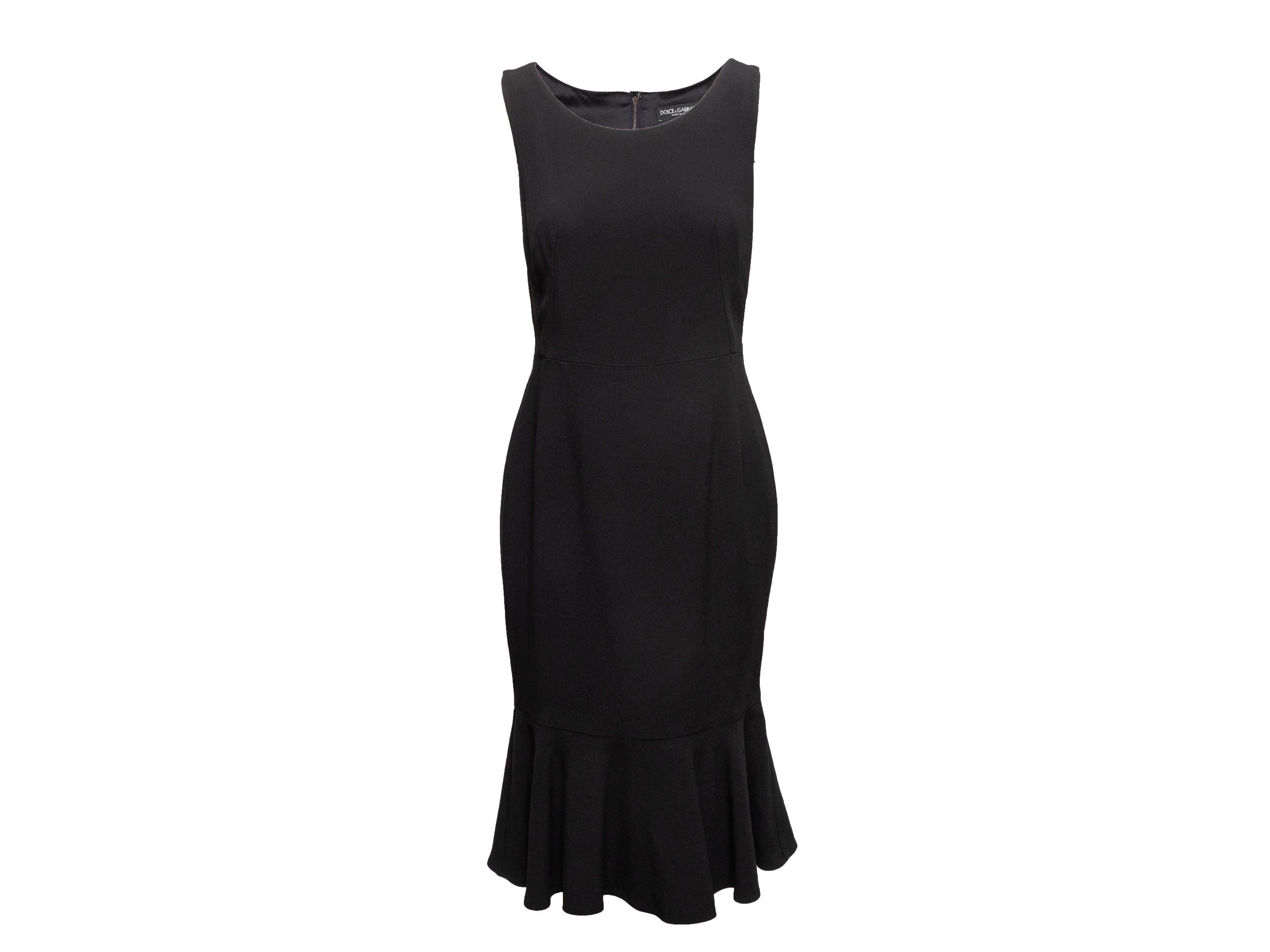 Product Details: Black sleeveless fitted flounce hem dress by Dolce & Gabbana. Crew neck. Zip closure at back. 30" bust, 30" waist, 42.5" length, 12" shoulder width.