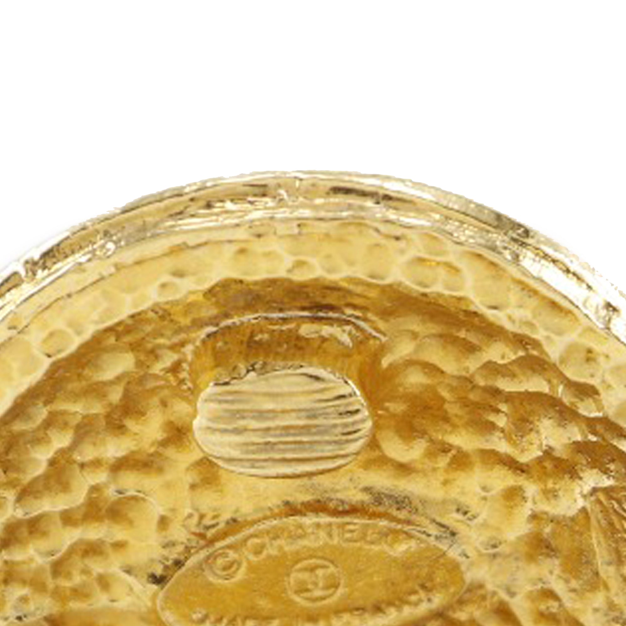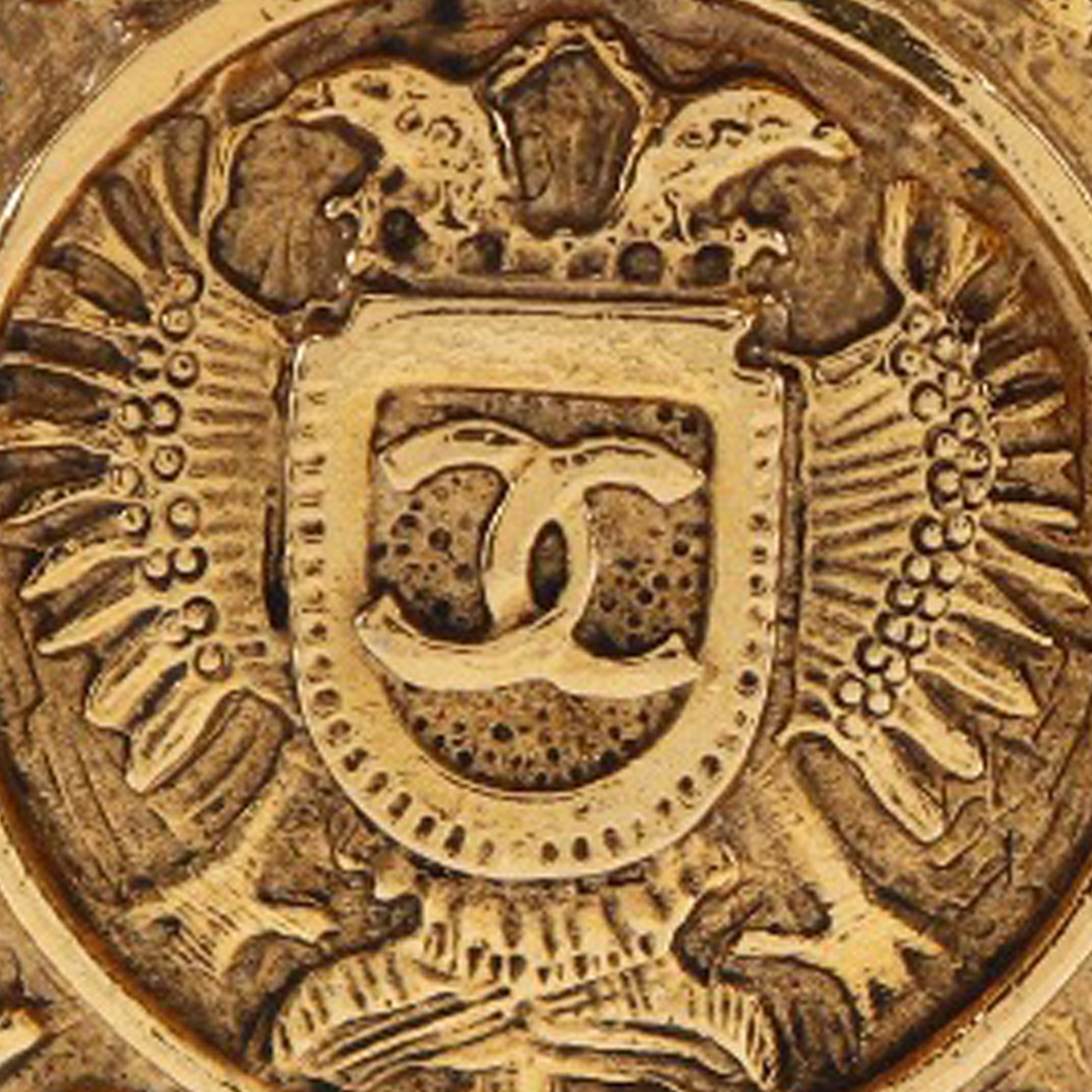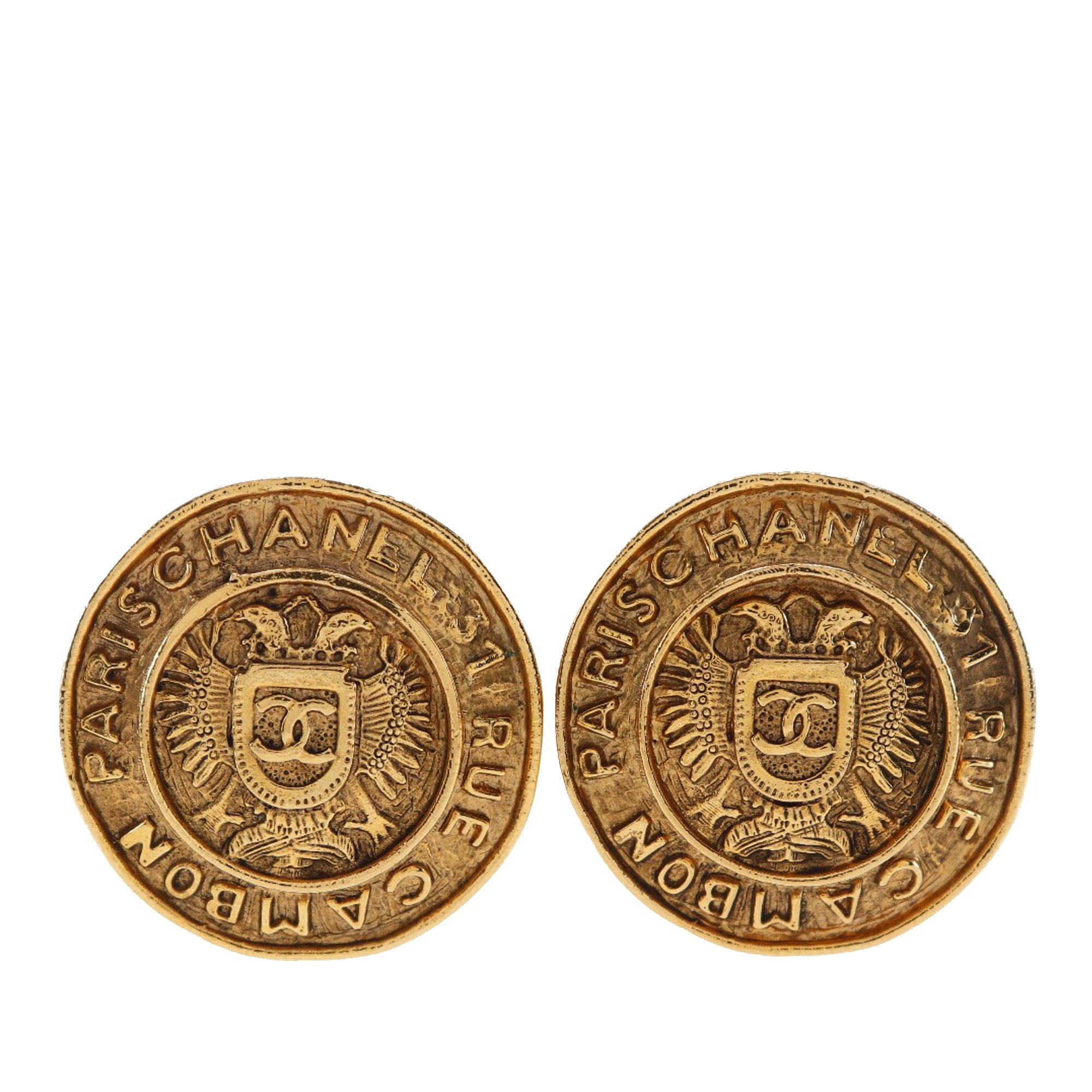 Product Details: Gold Chanel Gold Plated Rue Cambon Crest Clip On Earrings. These earrings feature gold plated bodies and back clip on closures. 1.3" L x 1.3" W x 0" D.