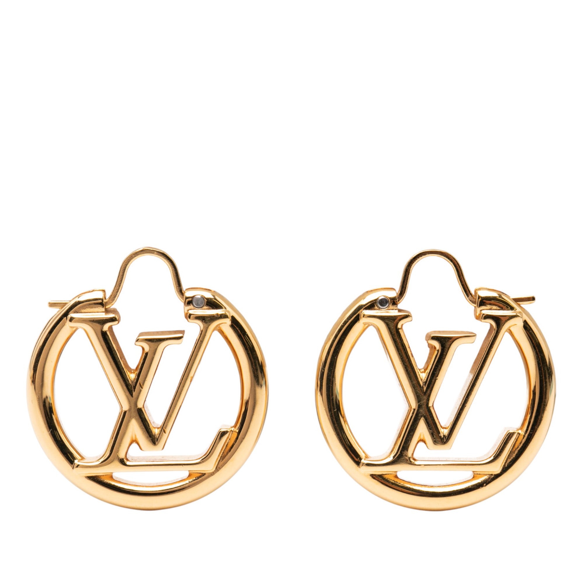 Product Details: Gold Louis Vuitton Gold Plated Louise Hoop Earrings PM. These earrings feature a gold-tone body and a latch back closures. 1.1" L x 1" W x 0" D. Serial number LE1211.