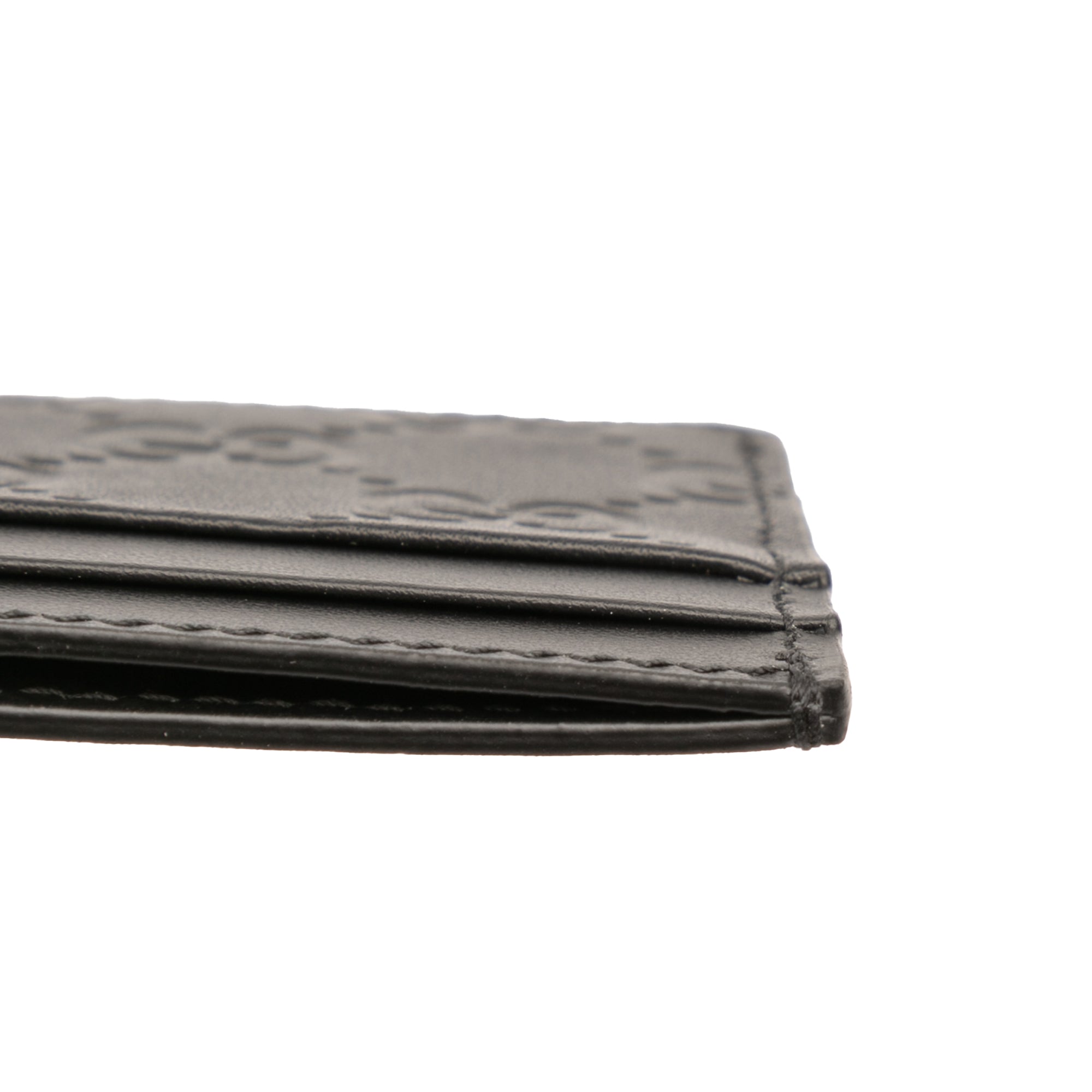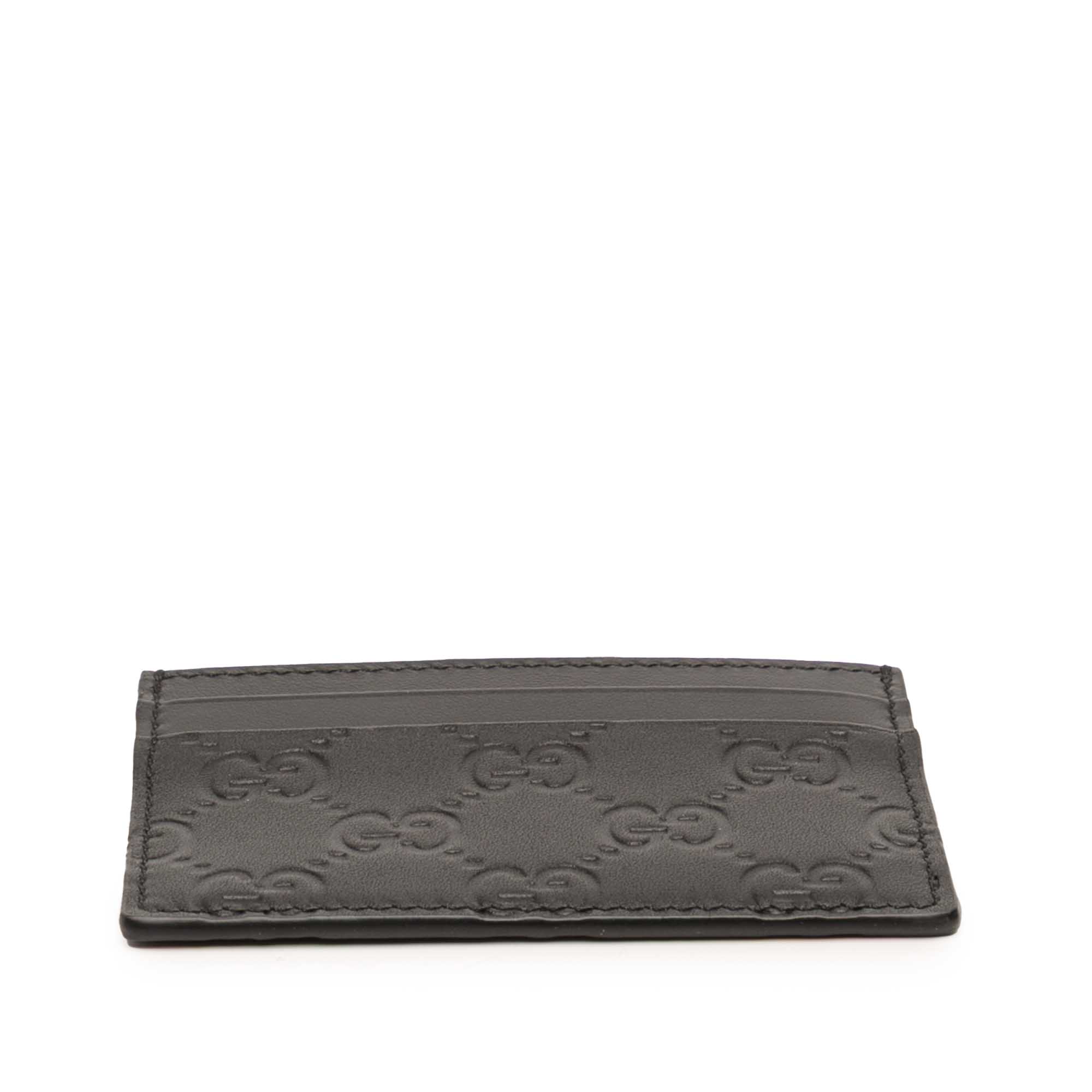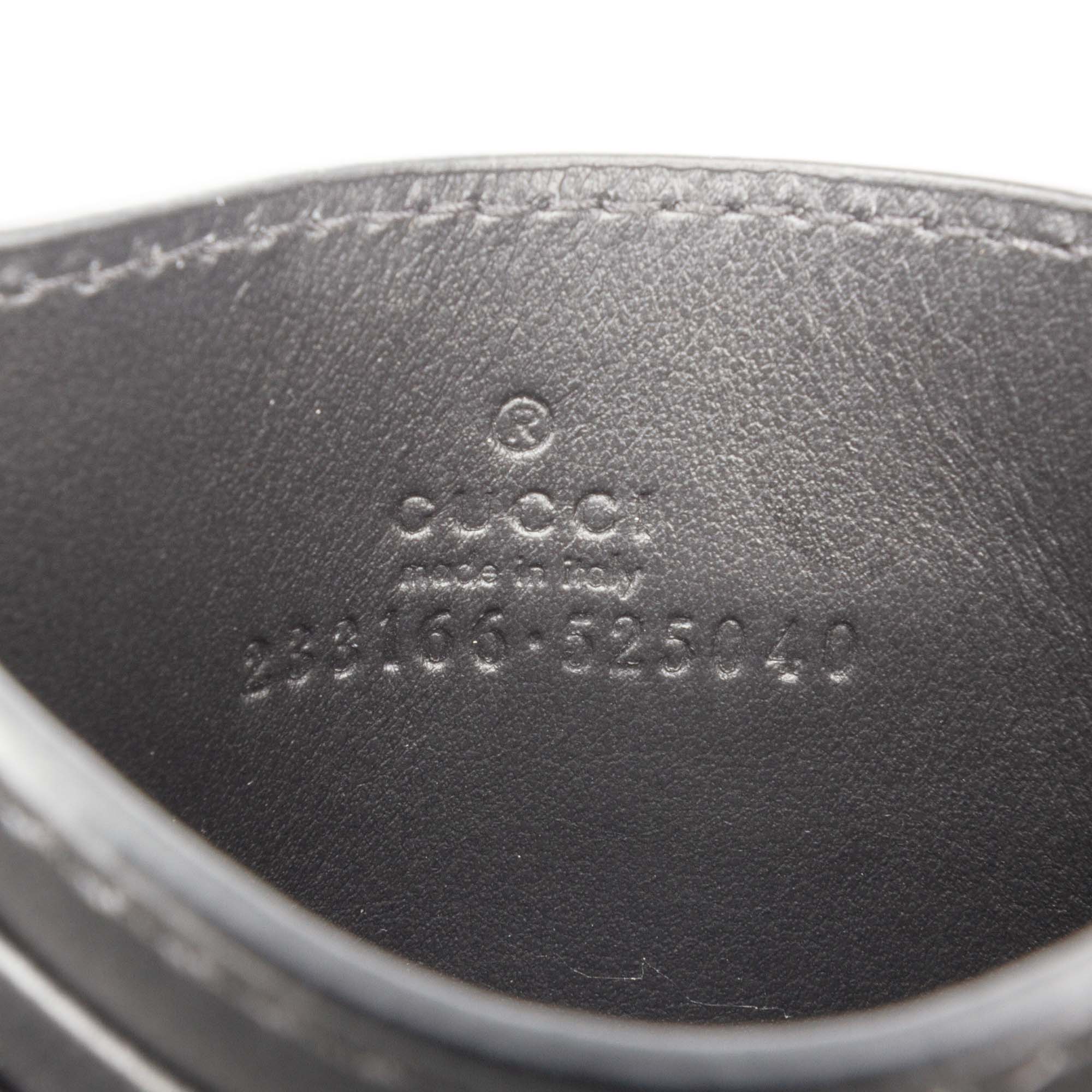 Product Details: Black Gucci Guccissima Card Holder. This card holder features an embossed leather body, and card slots. 2.8" L x 3.9" W x 0.1" D. Serial number 233166 525040.