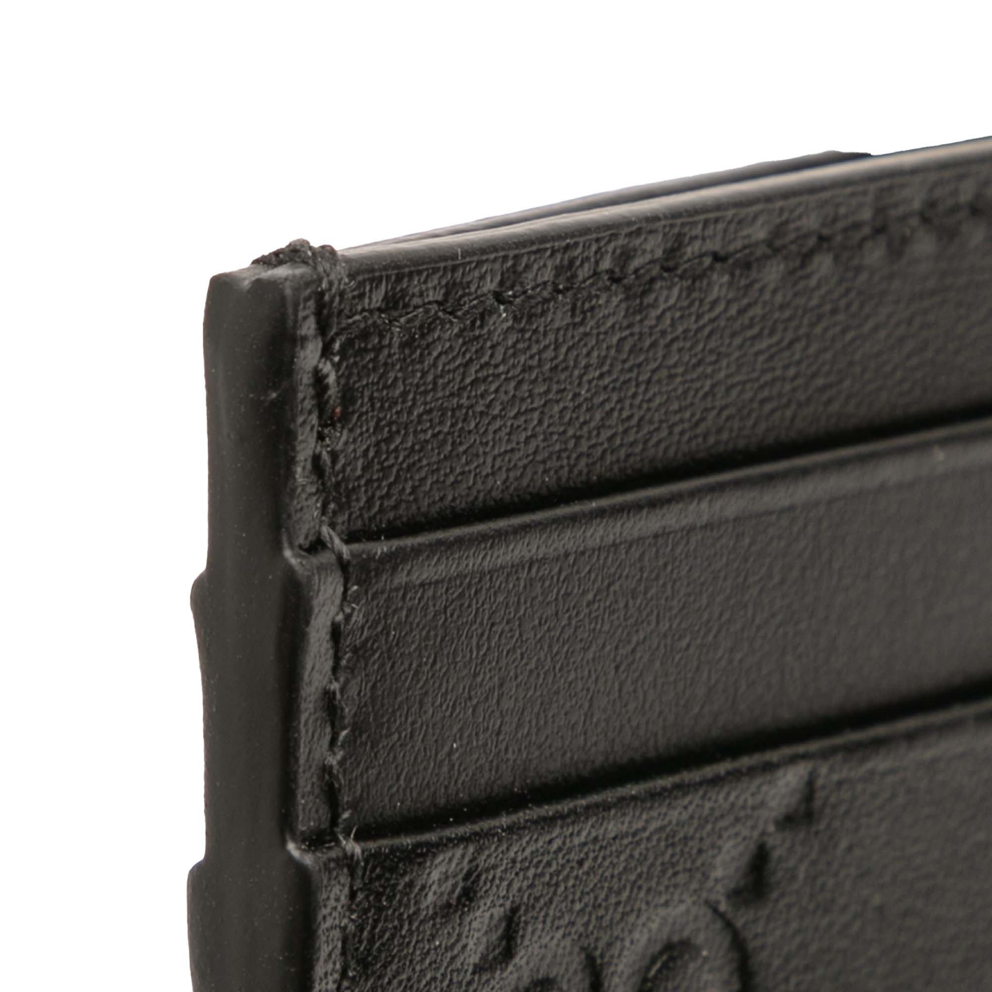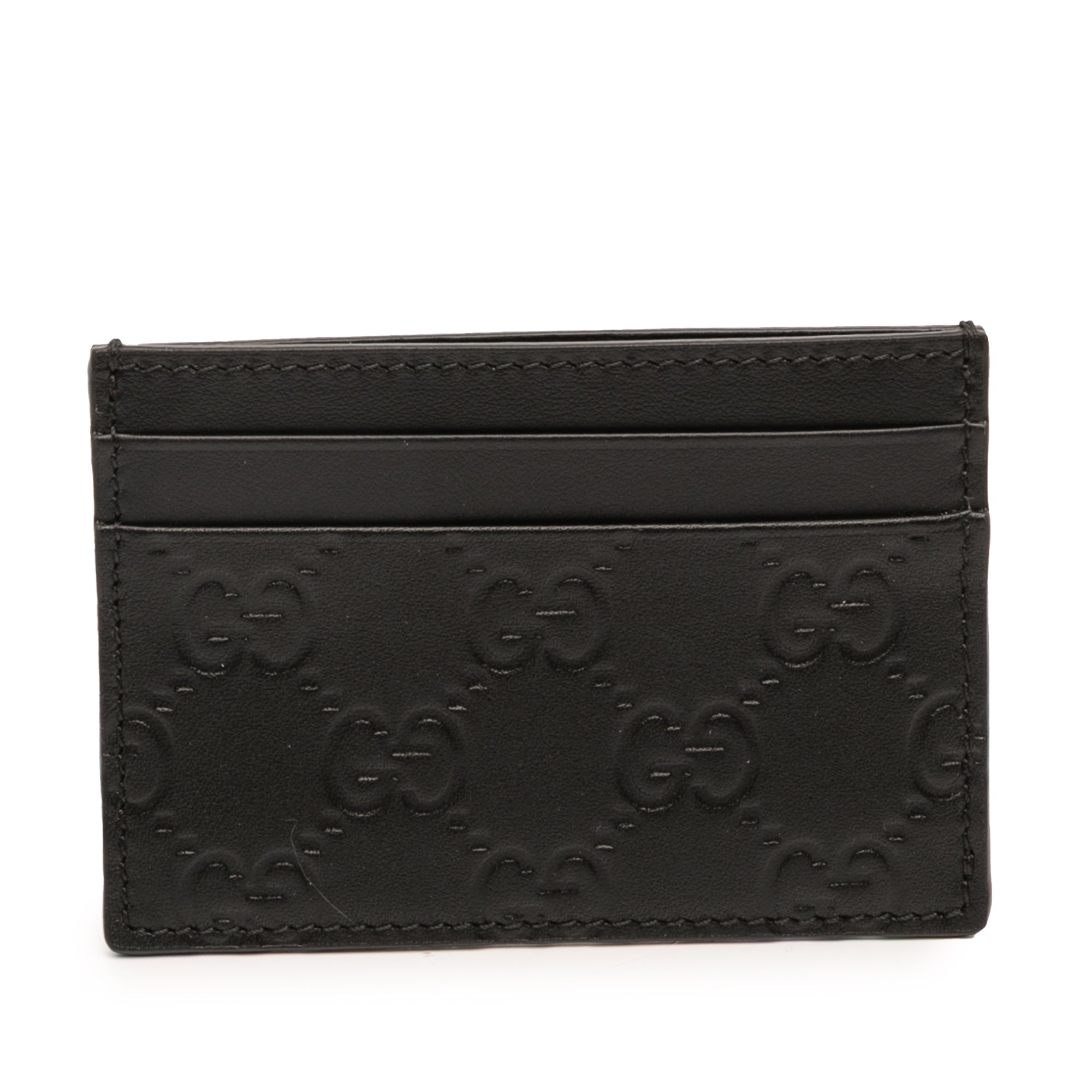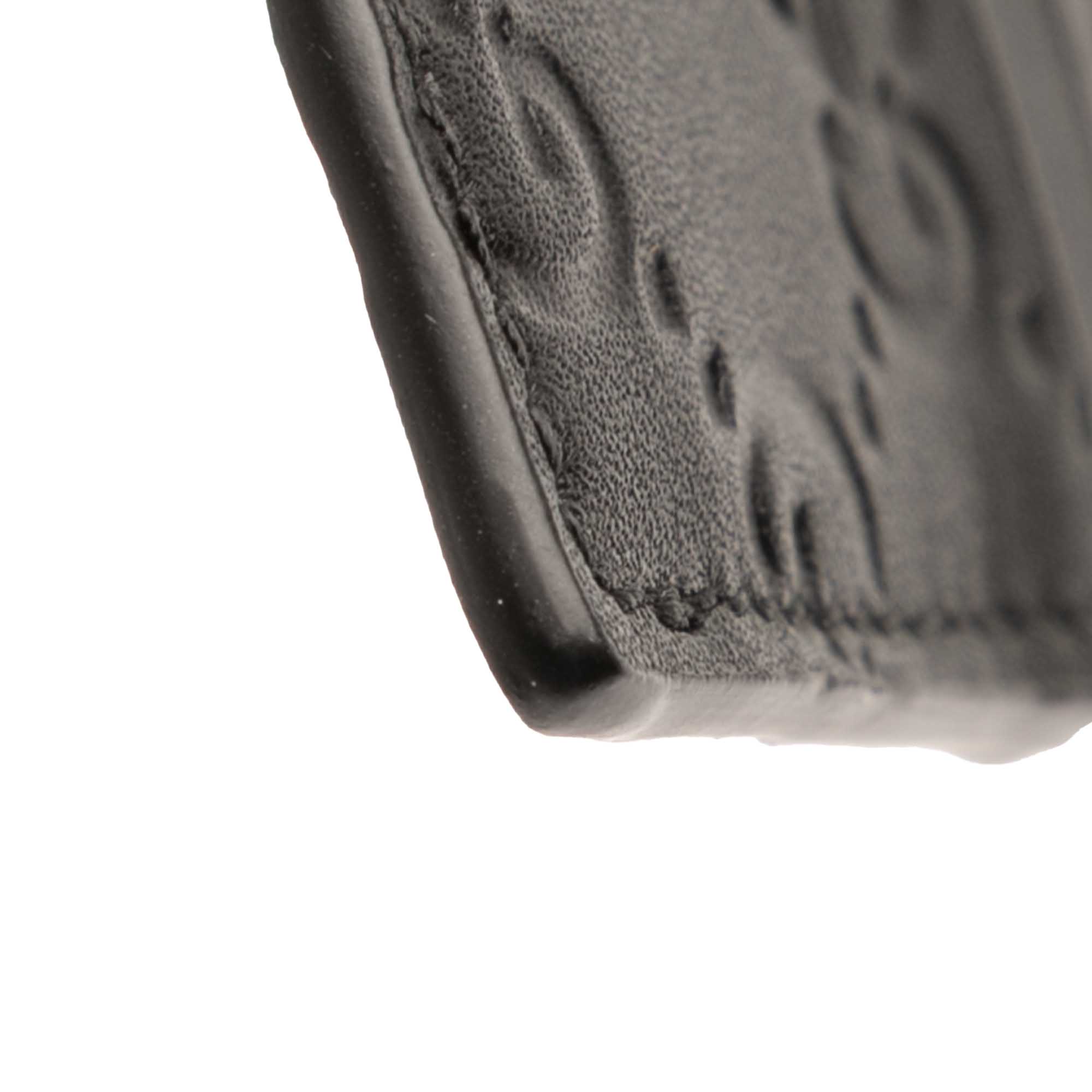Product Details: Black Gucci Guccissima Card Holder. This card holder features an embossed leather body, and card slots. 2.8" L x 3.9" W x 0.1" D. Serial number 233166 525040.