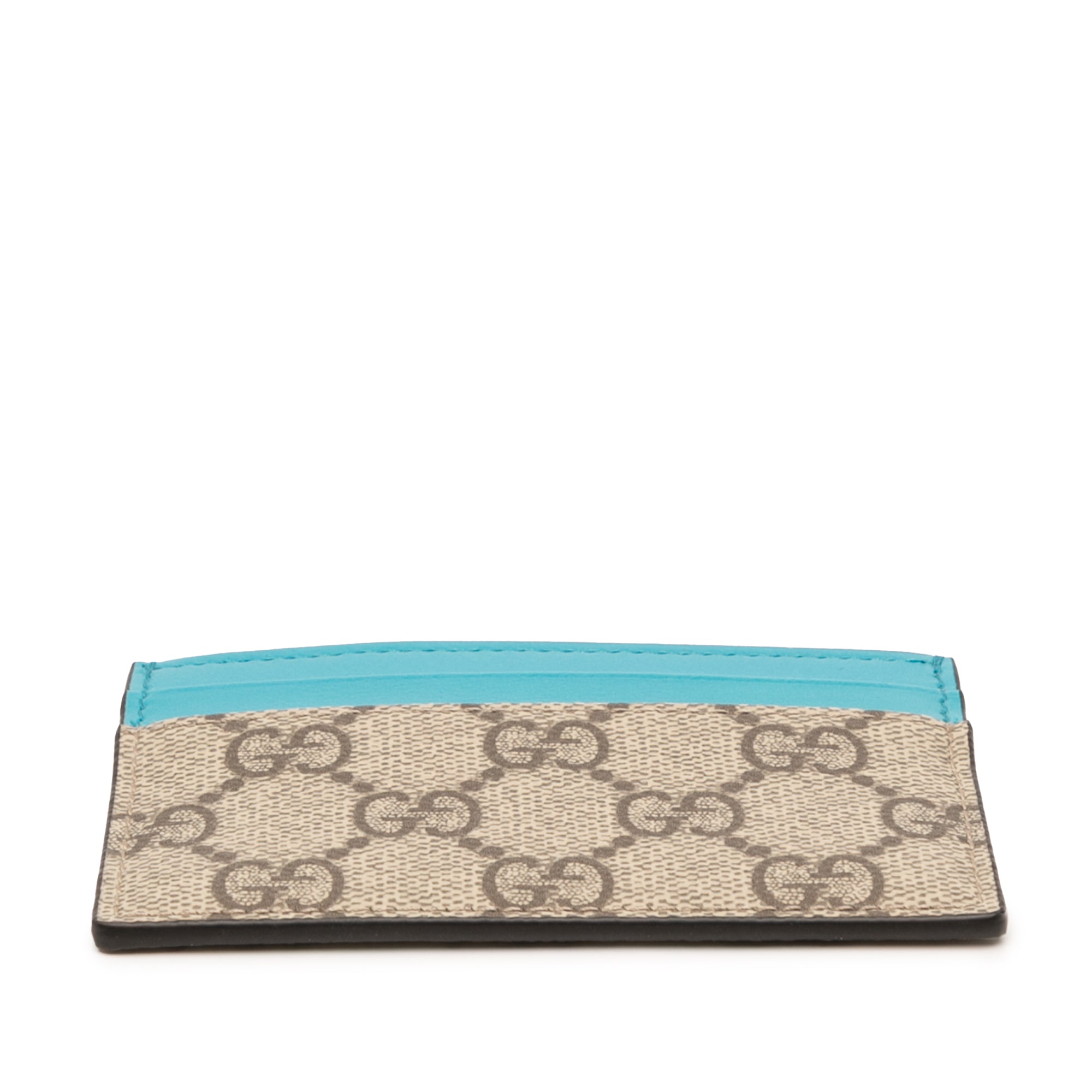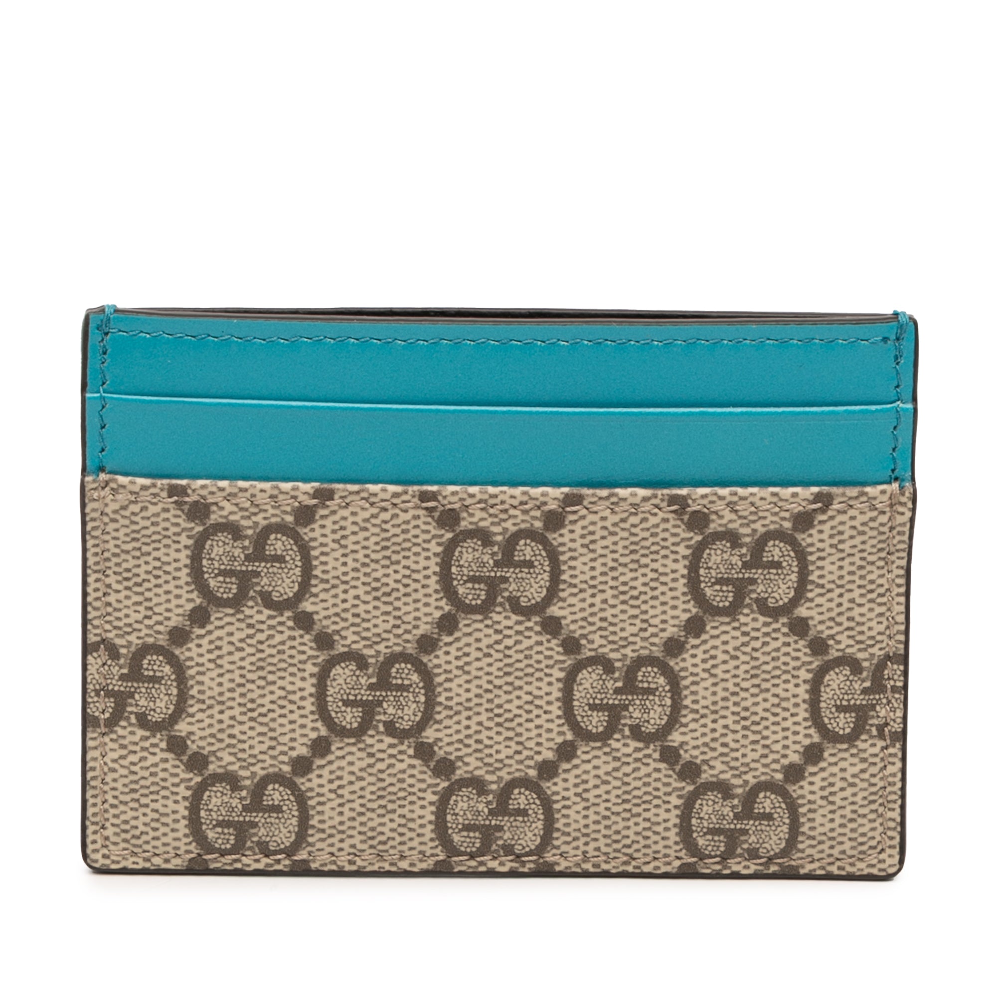 Product Details: Brown Gucci GG Supreme Card Holder. This card holder features a coated canvas body and slip compartments. 2.8" L x 3.9" W x 0.1" D. Serial number 233166 525040.