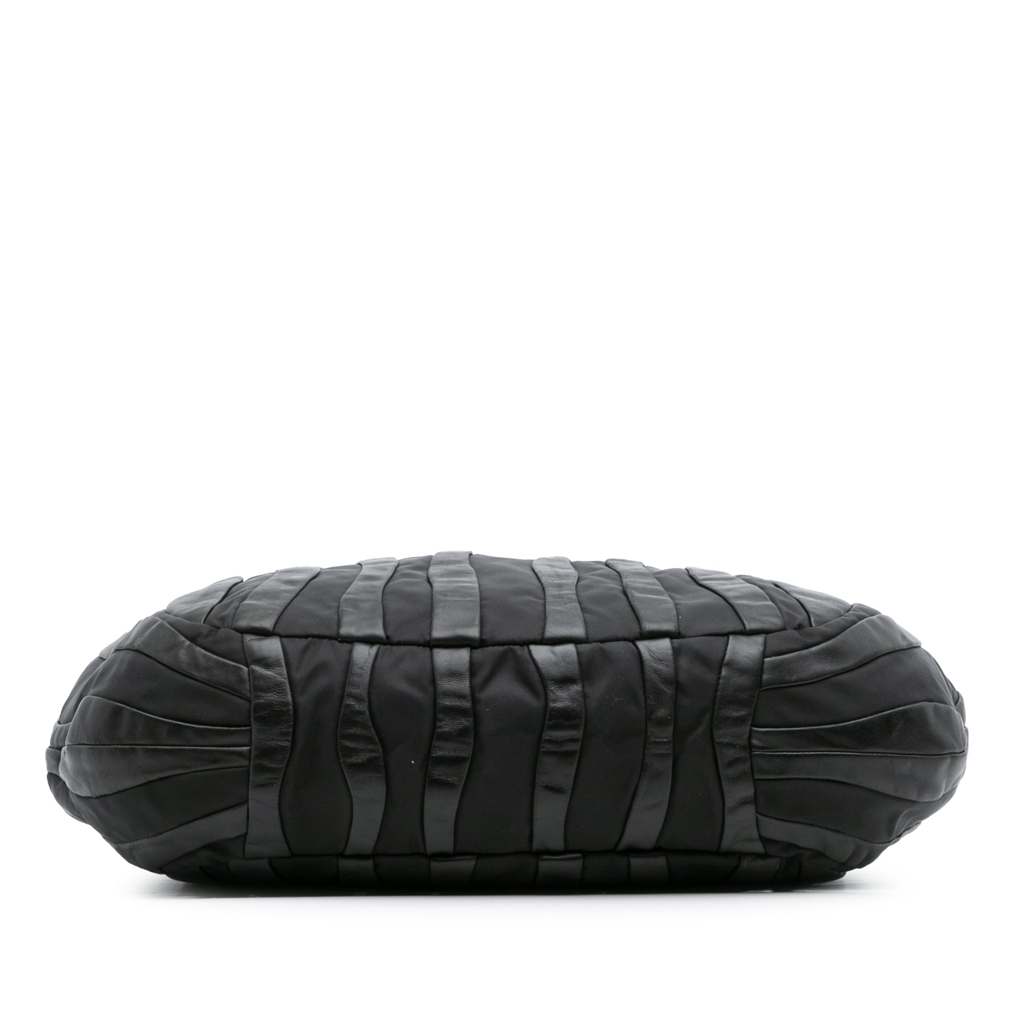Product Details: Black Prada Tessuto Nappa Waves Tote. This tote bag features a nylon and nappa leather body, rolled leather handles, an open top with magnetic closure, and interior zip and slip pockets. 11" L x 12.2" W x 4.1" D.