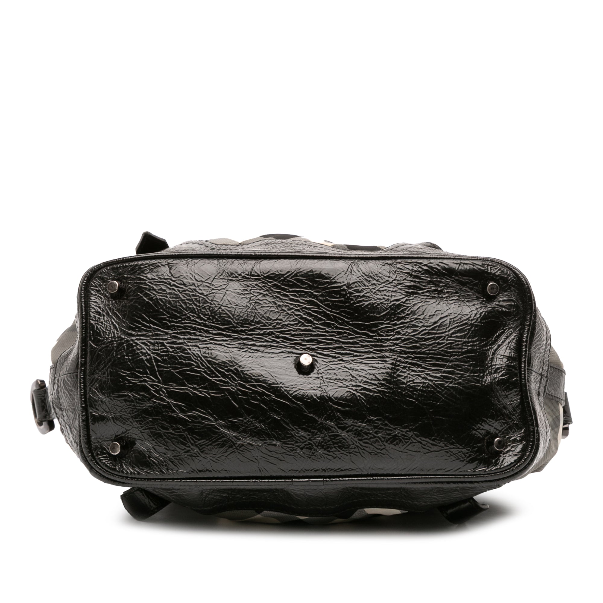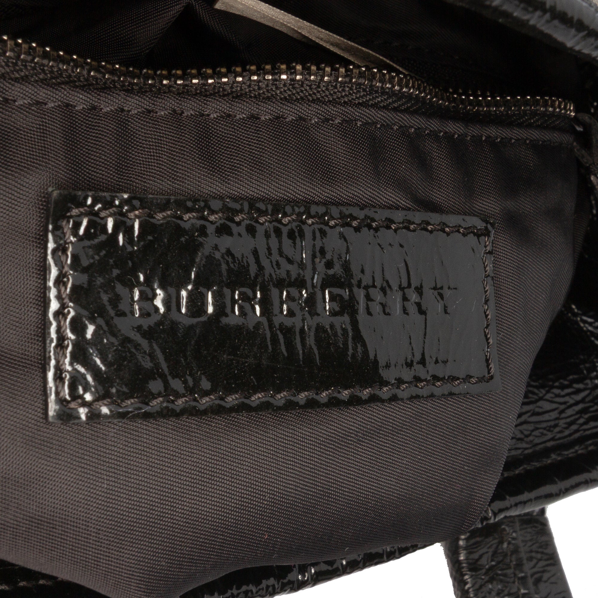 Product Details: Gray Burberry Beat Check Nylon Lowry Satchel. This satchel features a nylon body with patent leather trim, flat patent leather top handles, a detachable and adjustable patent leather shoulder strap with leather guard, a top zip closure, and interior zip and slip pockets. 9.1" L x 10.2" W x 5.1" D, 8.3" drop. Serial number ITTREGRO44SCA.