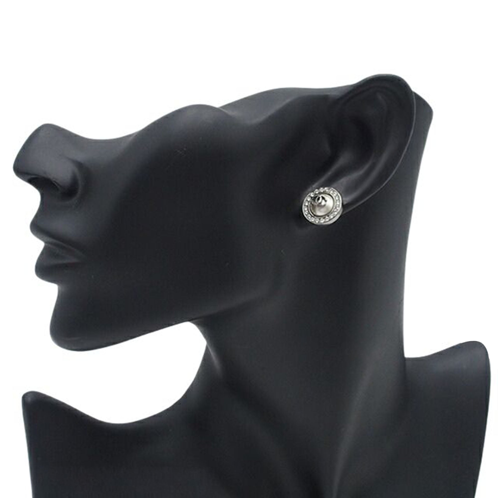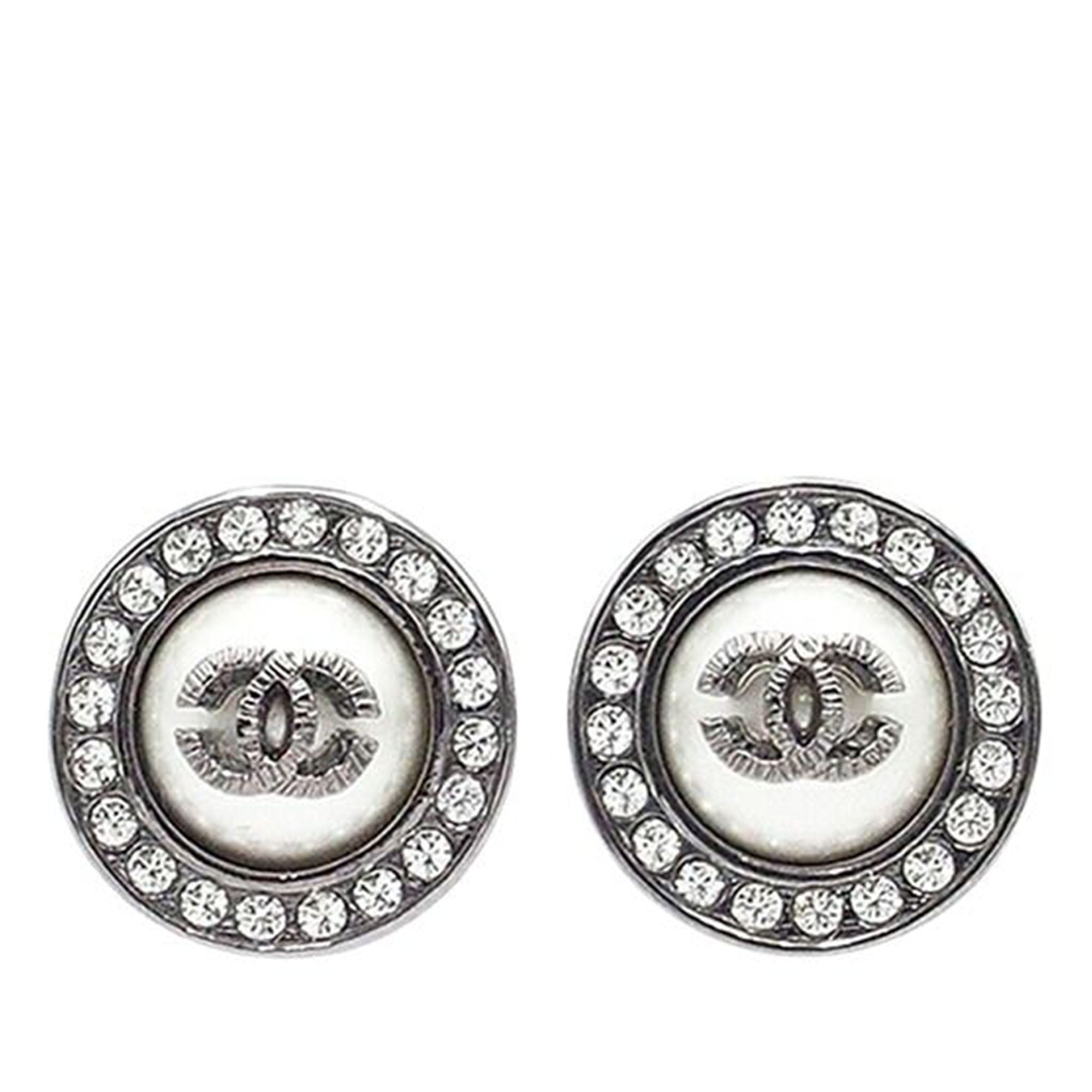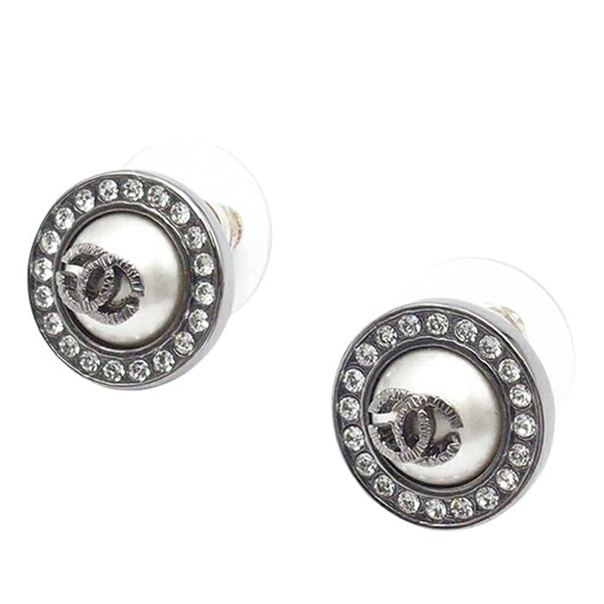 Silver Chanel Gunmetal Plated CC Faux Pearl and Crystal Round Push Back Earrings