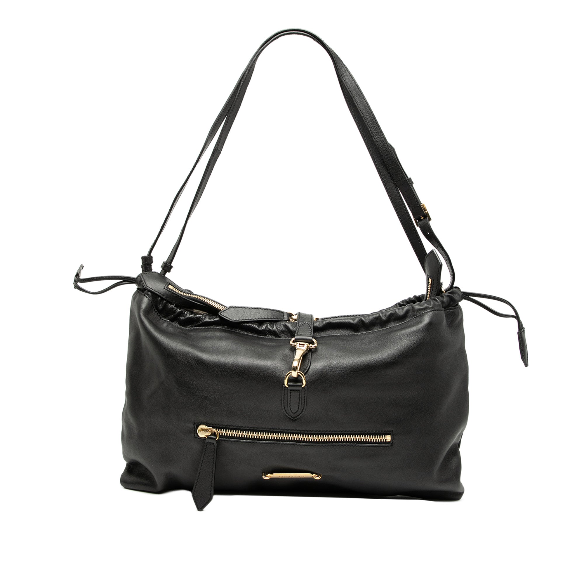 Product Details: Black Burberry Leather Big Crush Shoulder Bag. The Big Crush shoulder bag features a leather body, adjustable flat leather straps, a top zip closure, a drawstring closure, a flap tab with a clasp closure, an exterior front zip pocket, and interior zip and slip pockets. 11.8" L x 16.5" W x 0.4" D. Serial number ITCF&10SCA.