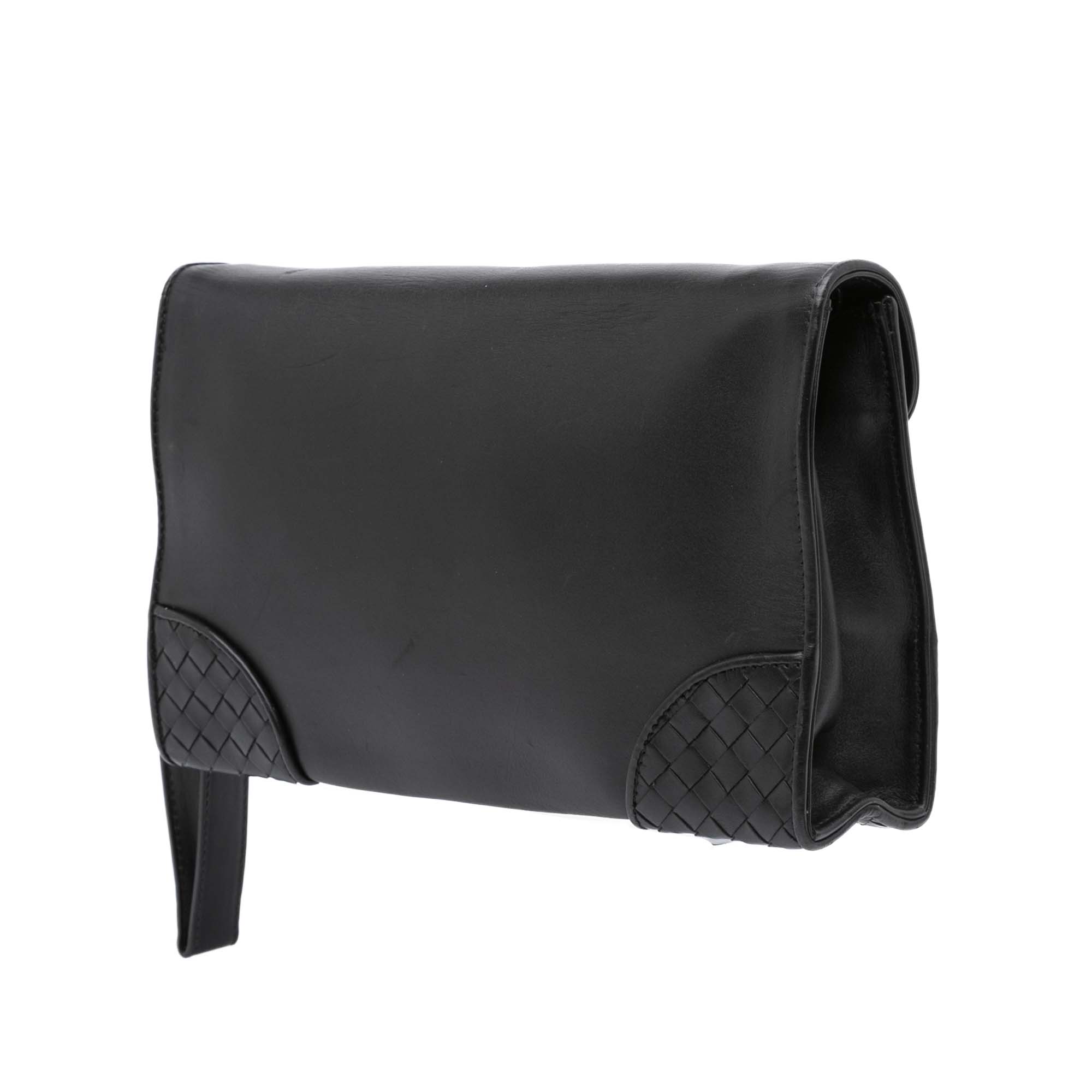 Product Details: Black Bottega Veneta Intrecciato Trimmed Nappa Slide Lock Clutch. This clutch bag features a leather body with woven details, and a front flap with a push lock closure. 6.3" L x 9.6" W x 2.4" D, 8.7" drop. Serial number B00294552Z.