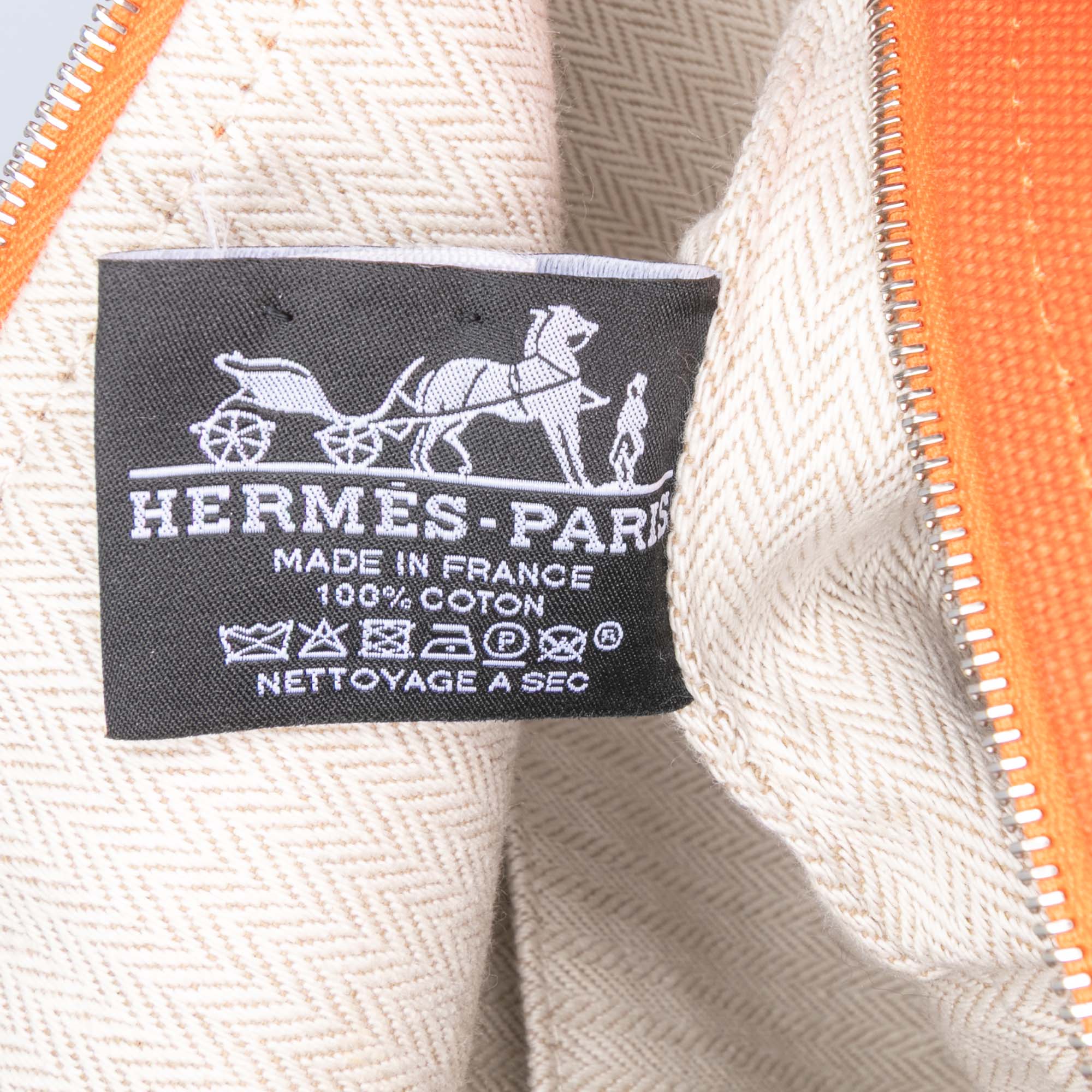 Product Details: Orange Hermès Large Toile Bride A Brac. The Bride-A-Brac Travel Case features a canvas body, a flat handle, a top zip closure, and interior slip pockets. 5.1" L x 10" W x 4.9" D. Serial number H103223M 05.
