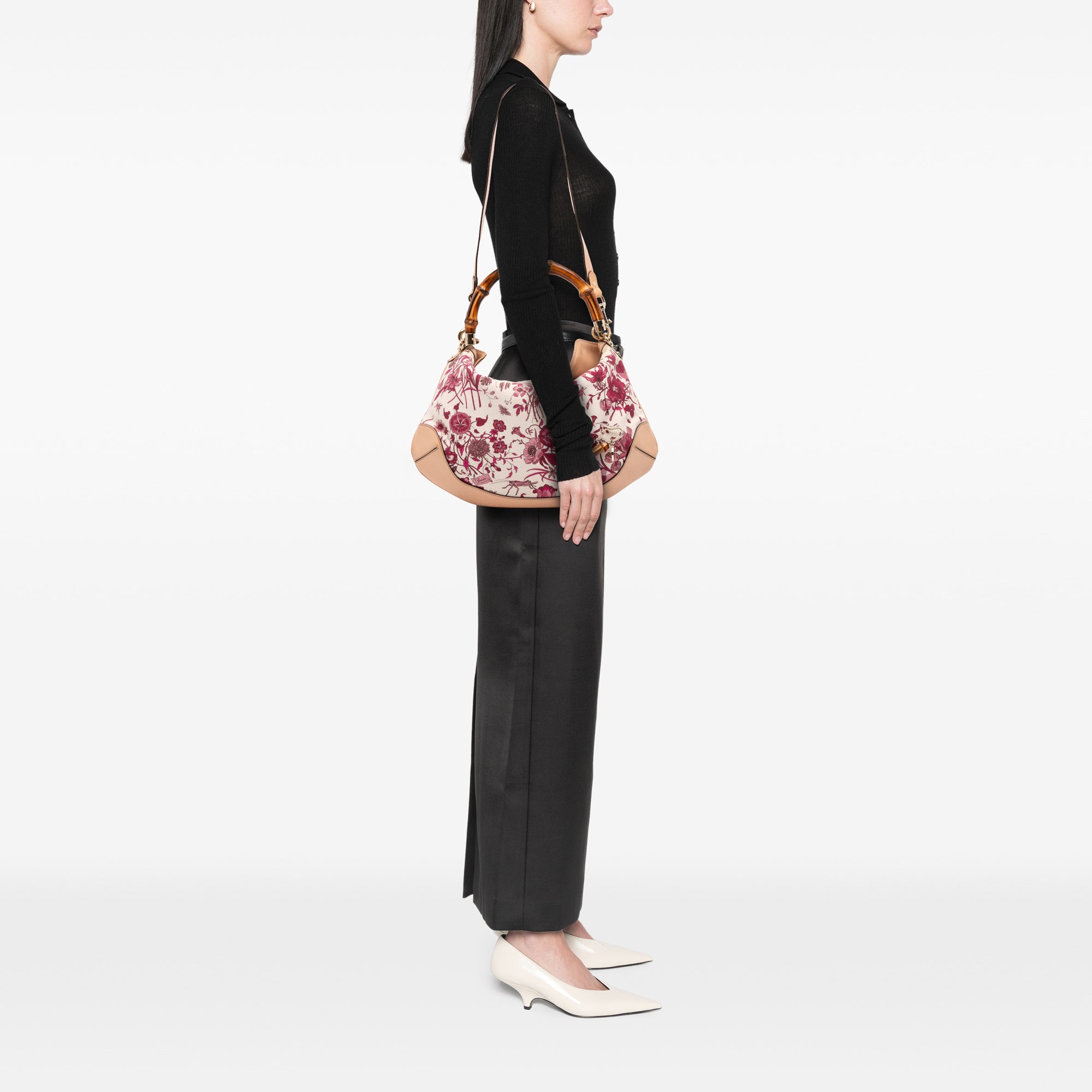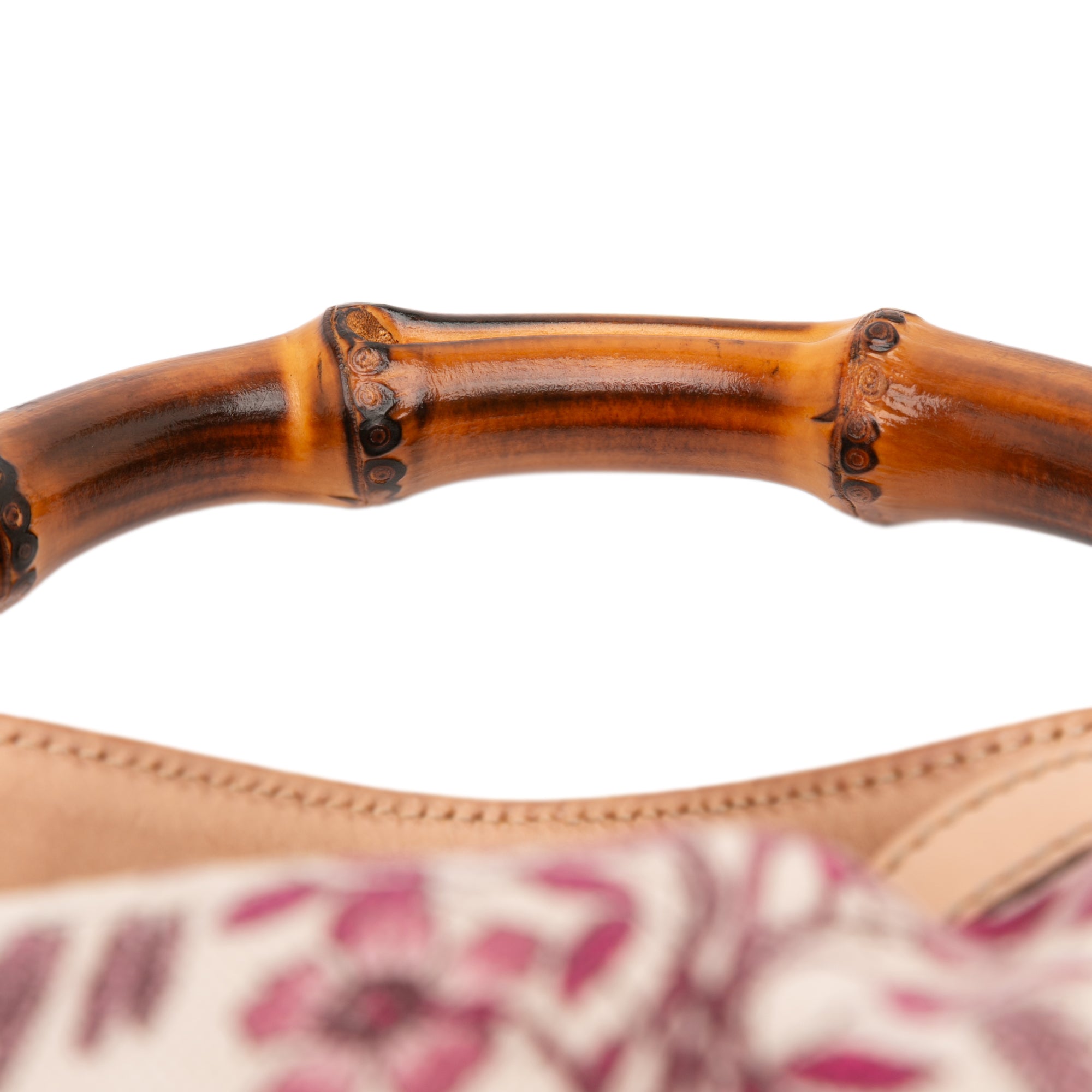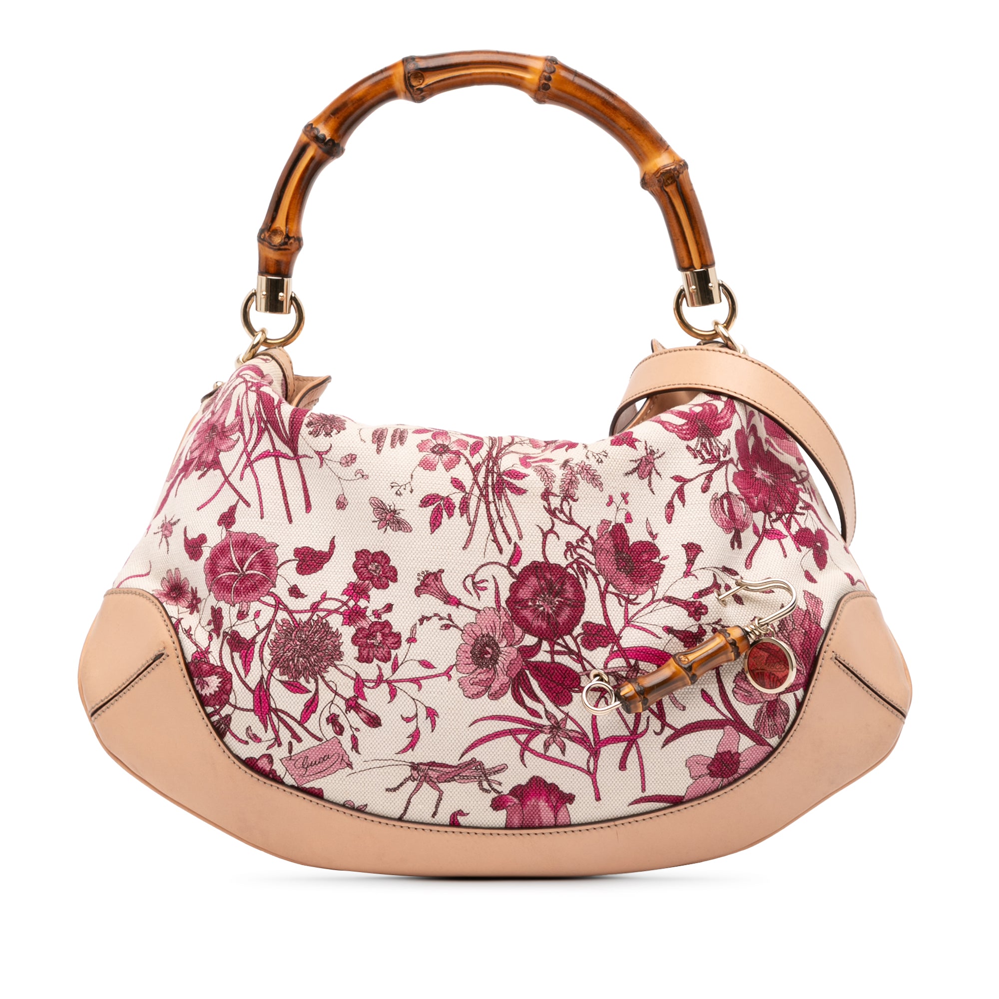 Product Details: Brown Gucci GG Canvas Flora Peggy Satchel. The Peggy satchel features a printed canvas body with leather trim, a top bamboo handle, a detachable flat leather strap, an open top, and interior zip and slip pockets. 12.6" L x 15.7" W x 0.2" D, 2.8" drop. Serial number 169961 467891.
