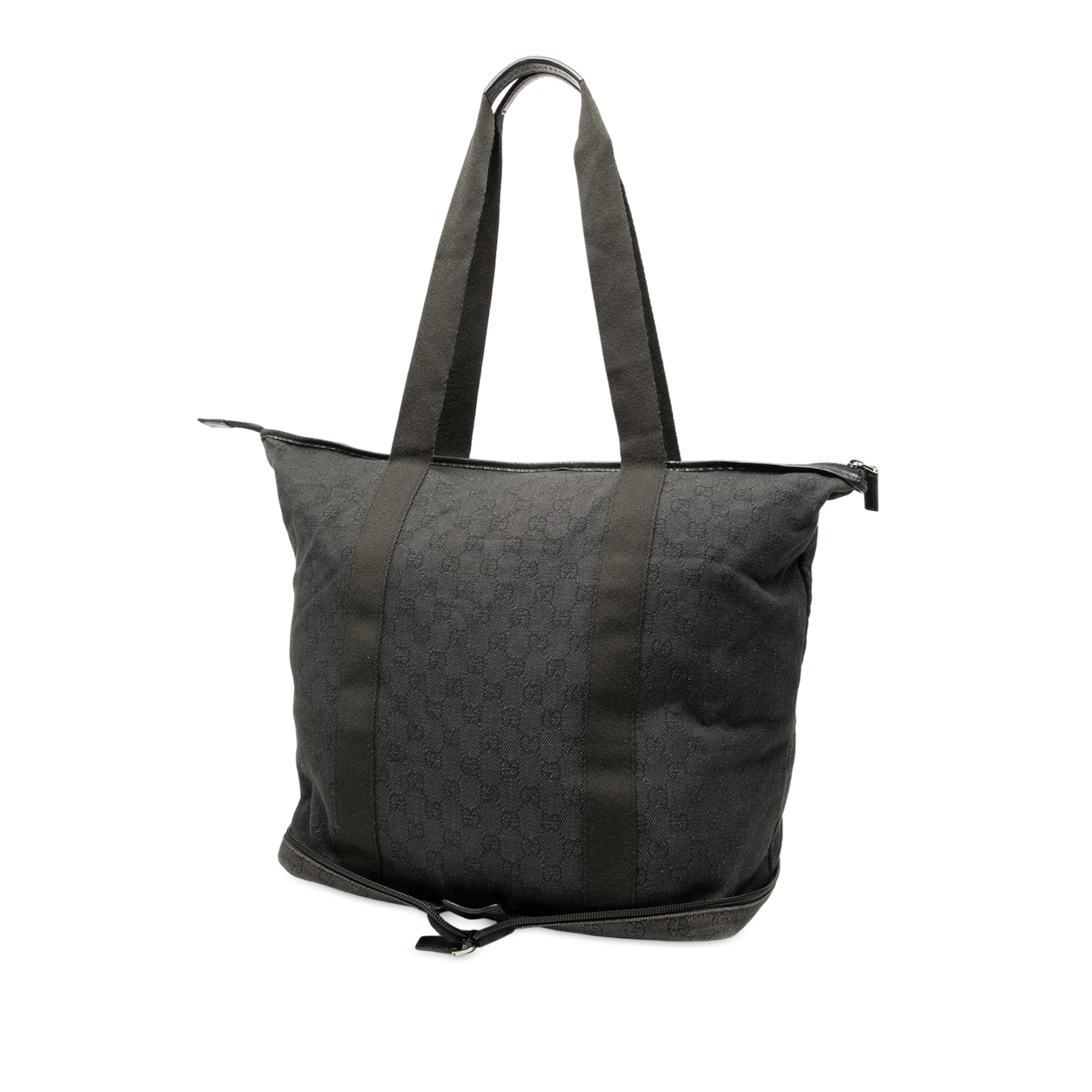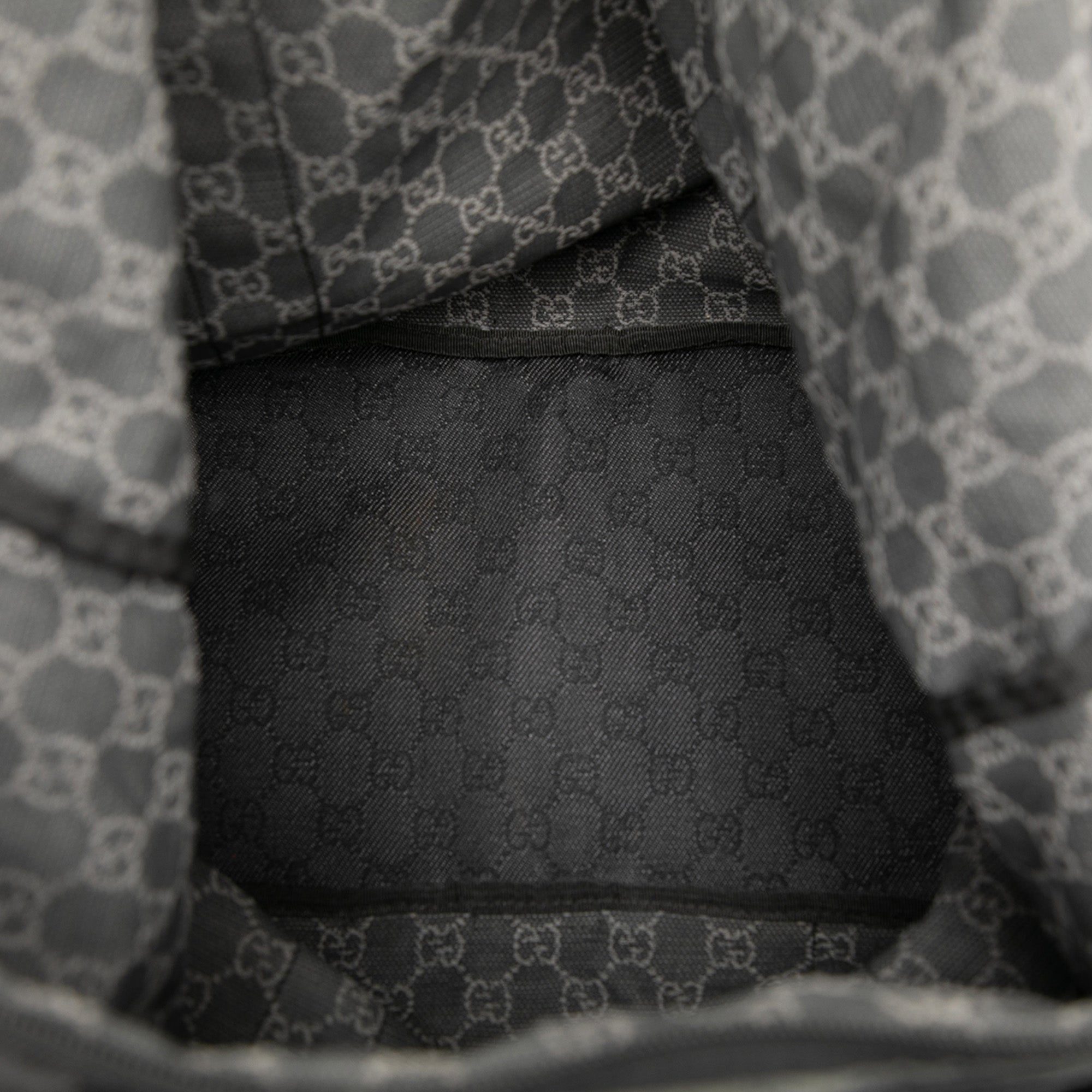 Product Details: Gray Gucci GG Denim Tote. This tote bag features a denim body, flat straps, a top zip closure, and an exterior front zip pocket. 15" L x 13.8" W x 7.5" D, 10.6" drop. Serial number 152232 002058.