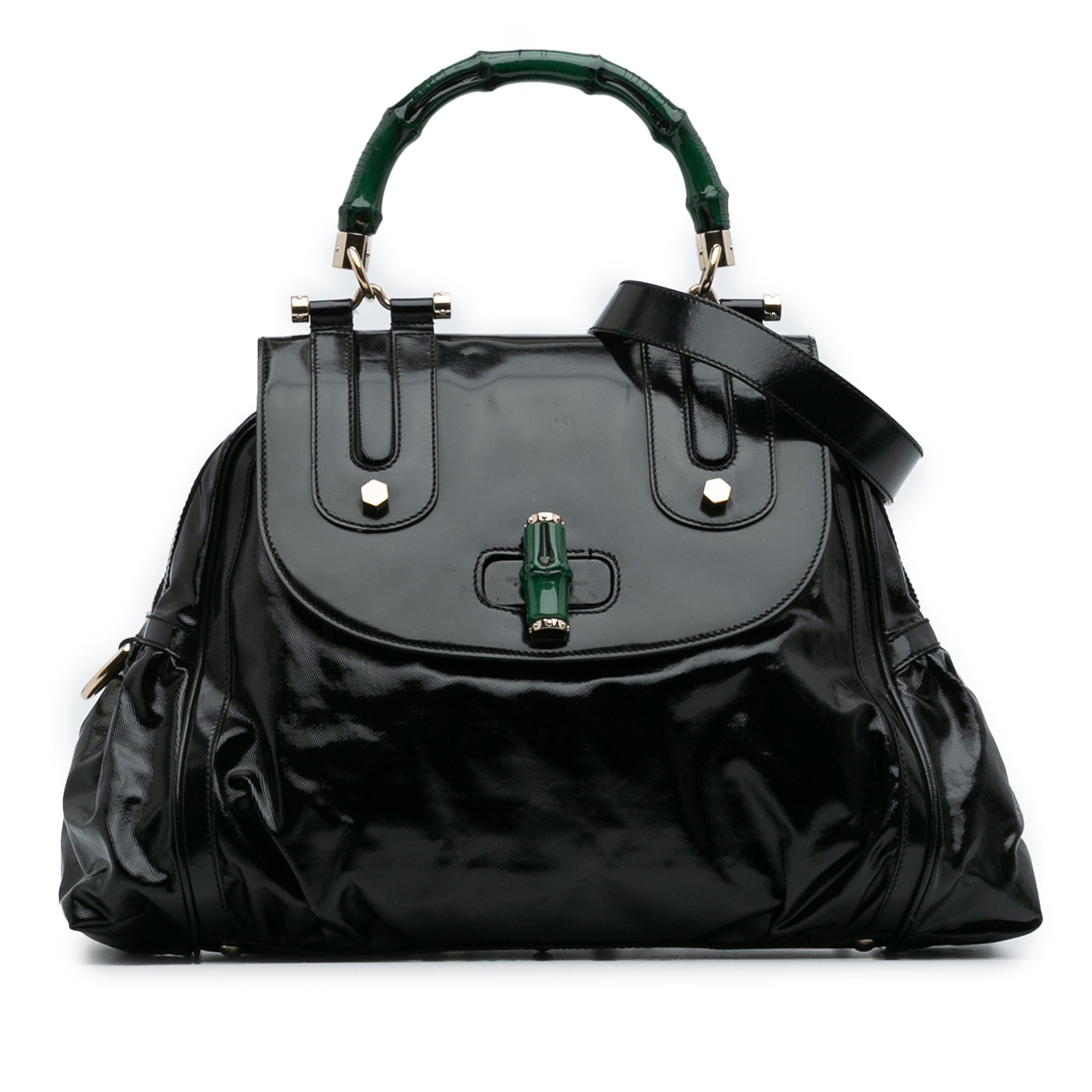 Product Details: Green Gucci Dialux Pop Coated Canvas Bamboo Top Handle Bag Satchel. This satchel features a coated canvas body, a bamboo top handle, a detachable leather shoulder strap, a top flap with bamboo bullet closure, a top zip closure, and an interior zip and slip pockets. 13" L x 13" W x 3.9" D, 5.1" drop. Serial number 189871 213048.