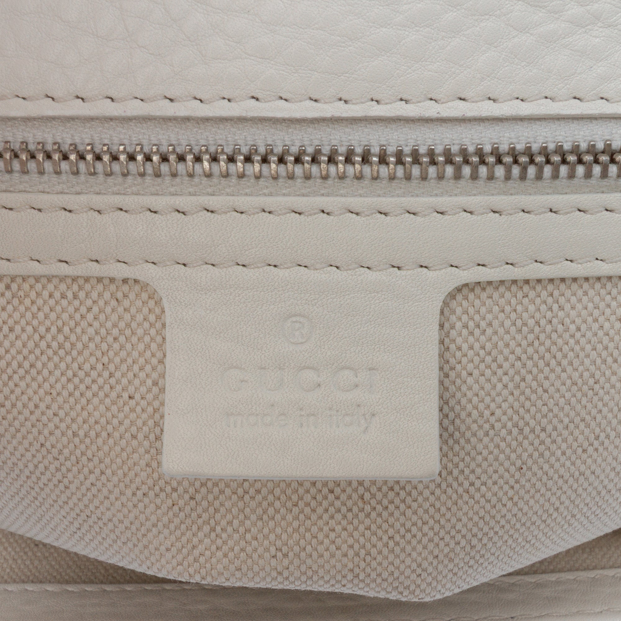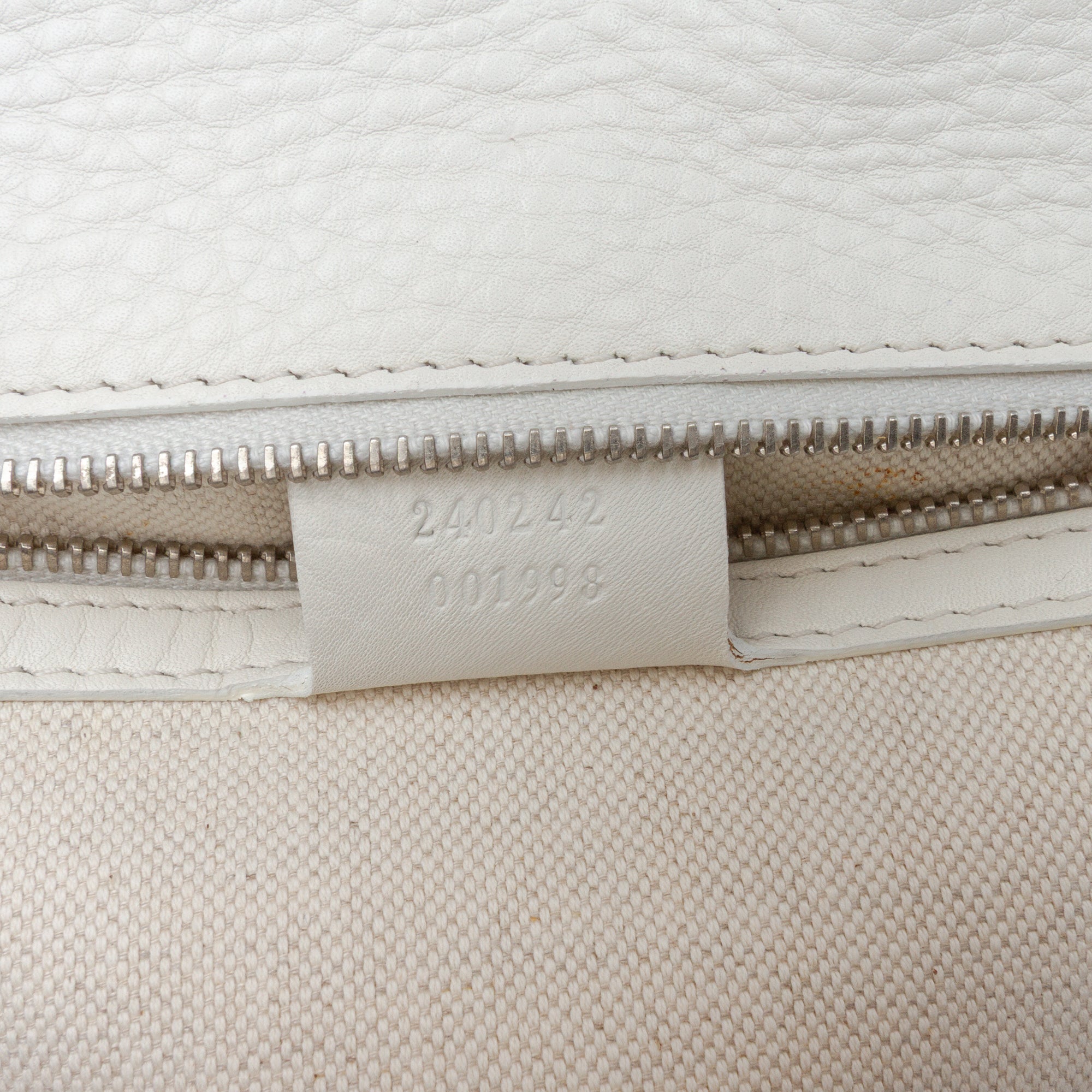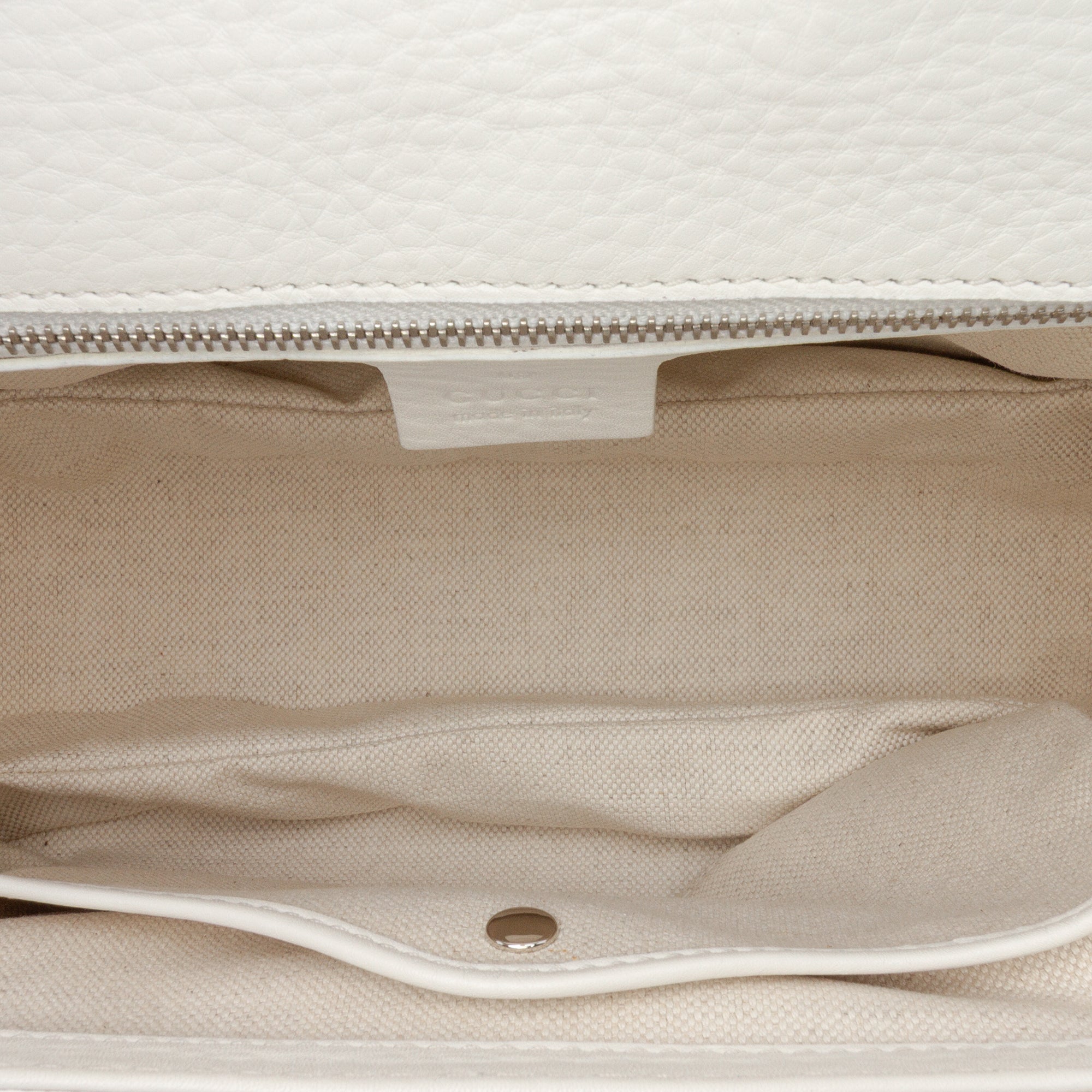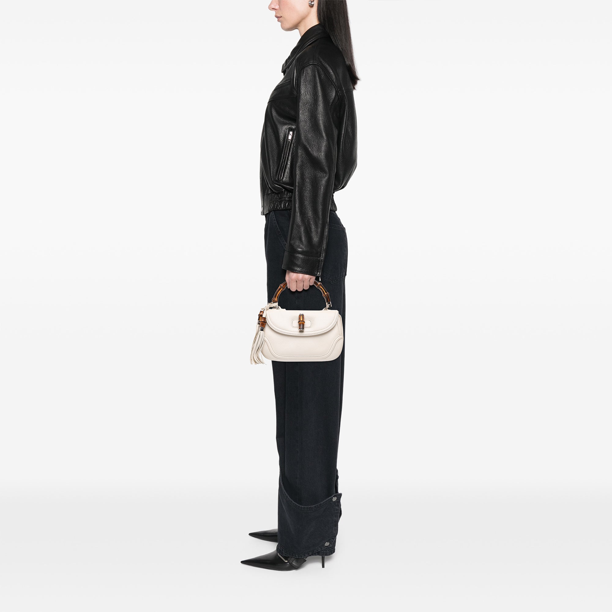 Product Details: White Gucci Medium Calfskin New Bamboo Top Handle Bag Satchel. The New Bamboo satchel features a leather body, a bamboo top handle, leather tassel details, a front flap with a bamboo twist lock closure, and interior zip and slip pockets. 6.5" L x 10.2" W x 3.3" D, 3.5" drop. Serial number 240242 001998.