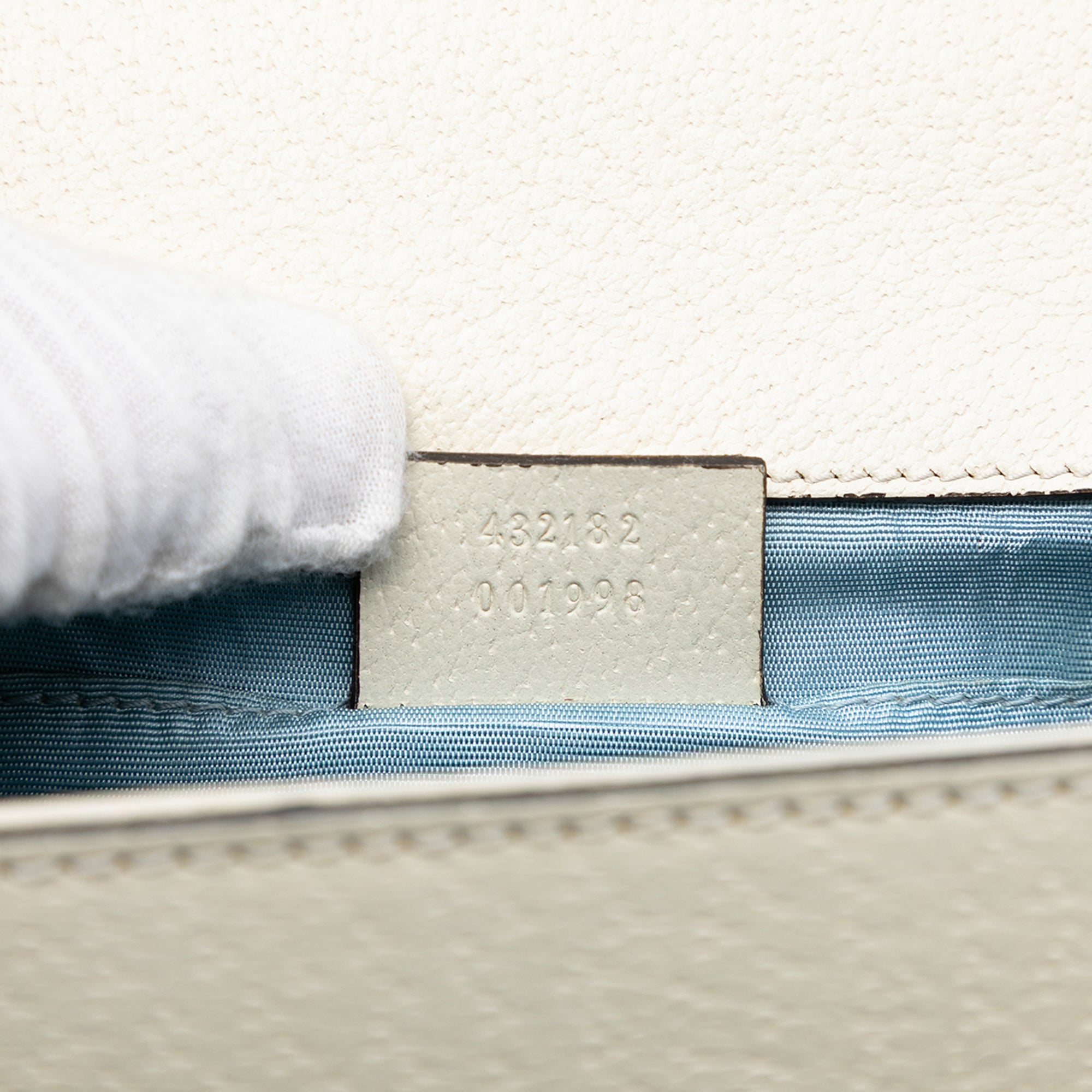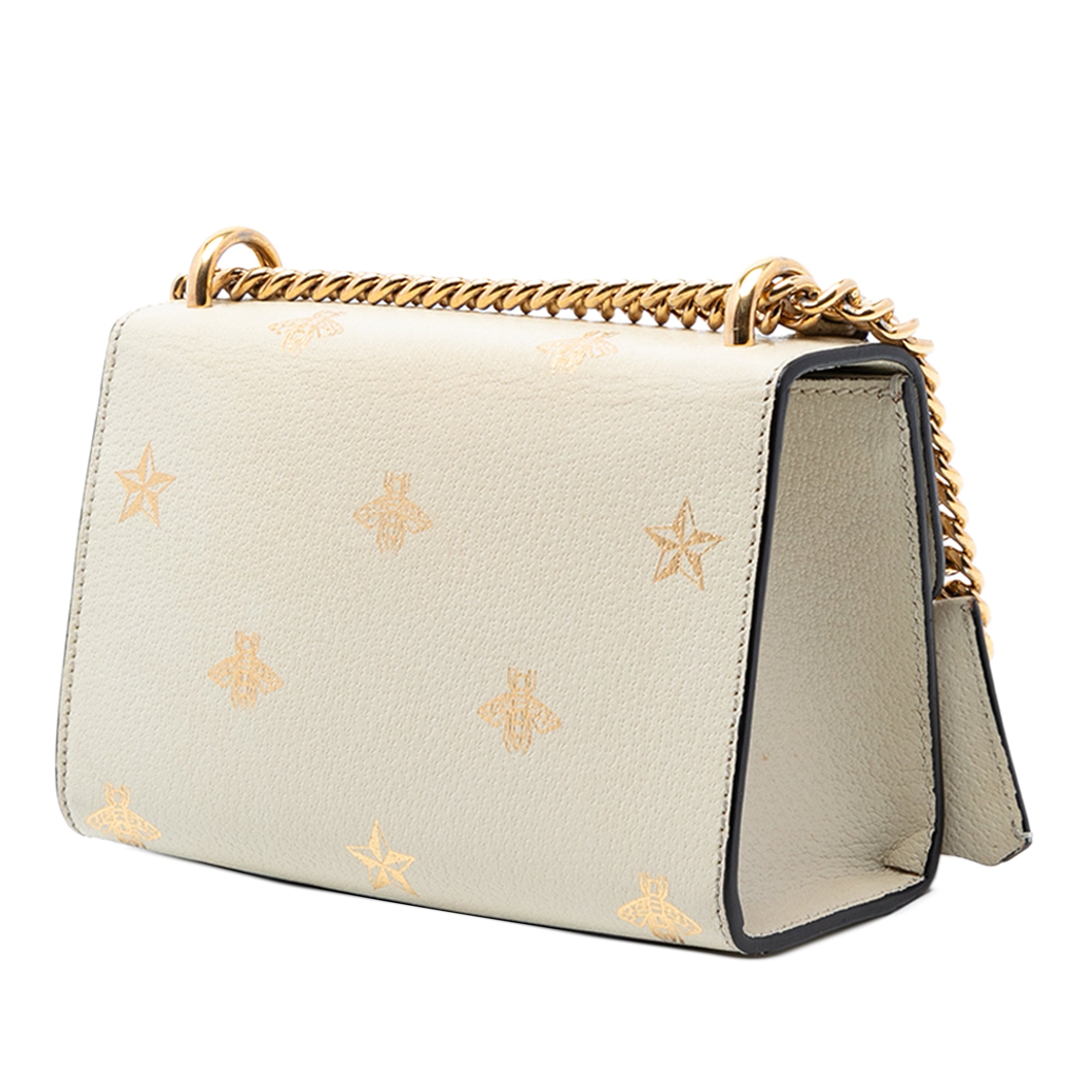 Product Details: White Gucci Small Leather Bee Star Padlock Crossbody. This shoulder bag features a leather body, a chain link shoulder strap, a front flap with a push lock closure, and an interior slip pocket. 4.9" L x 7.9" W x 3.1" D. Serial number 432182 001998.