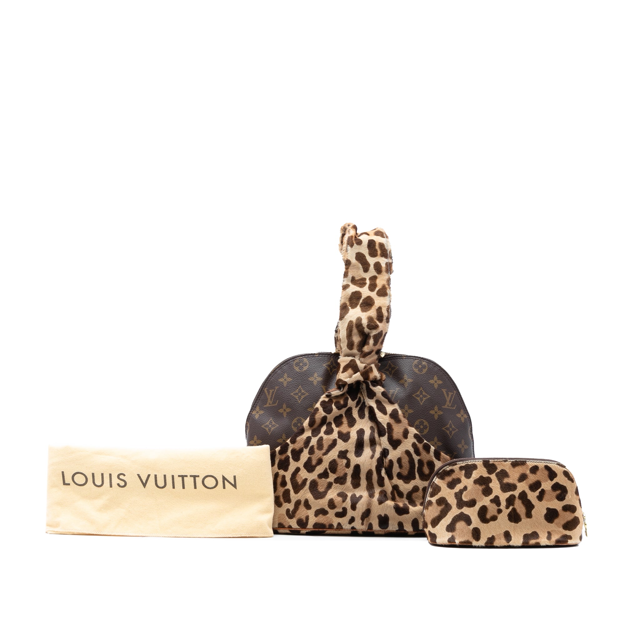 Product Details: Brown Louis Vuitton Azzedine Alaia Monogram Leopard Alma Handbag. The Azzedine Alaia features a monogram canvas and pony hair body, a pony hair top handle, a zip-around closure, interior zip and slip pockets, and a pouch inclusion. 9.1" L x 11.2" W x 5.9" D, 6.5" drop. Serial number BA0956.
