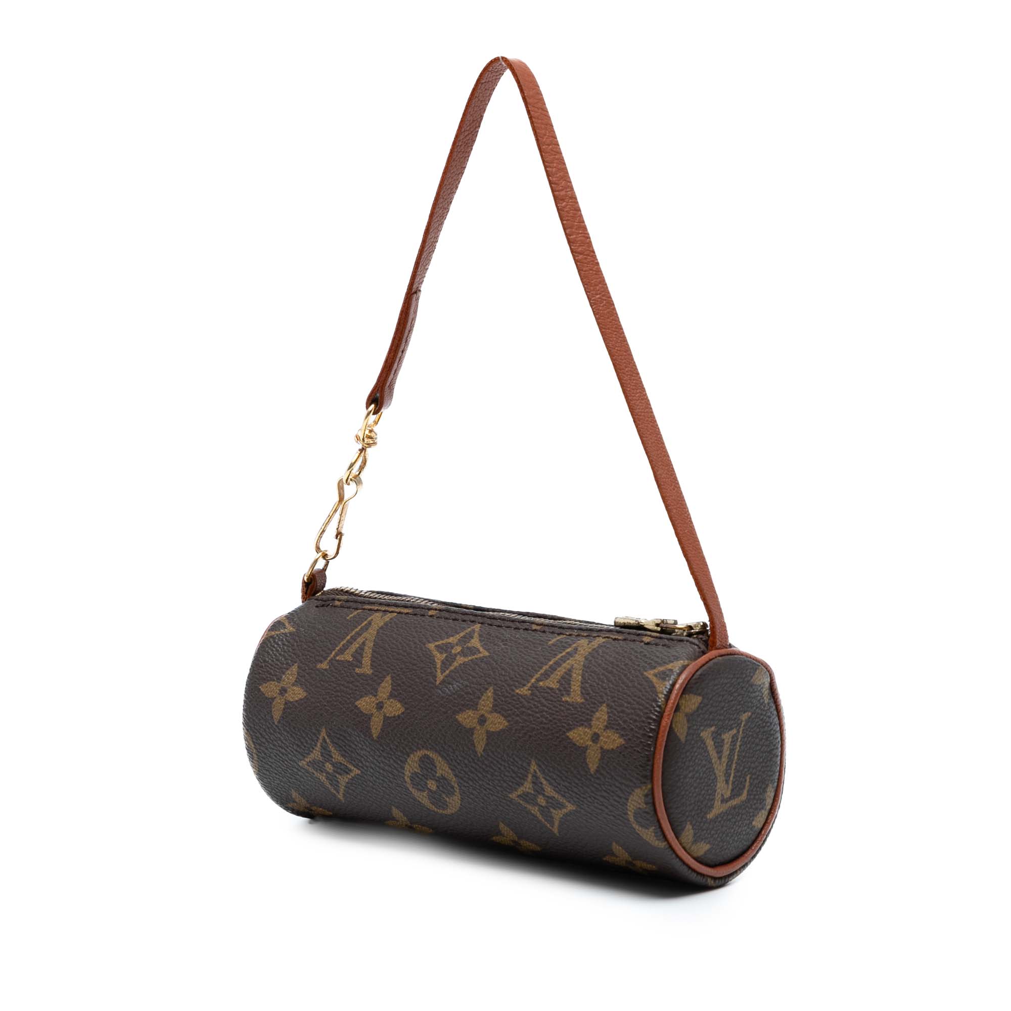 Product Details: Brown Louis Vuitton Monogram Papillon Pochette Handbag. The Pochette Papillon features a monogram canvas body, a detachable leather strap, and a top zip closure. 2.4" L x 6.1" W x 2.4" D, 5.9" drop.