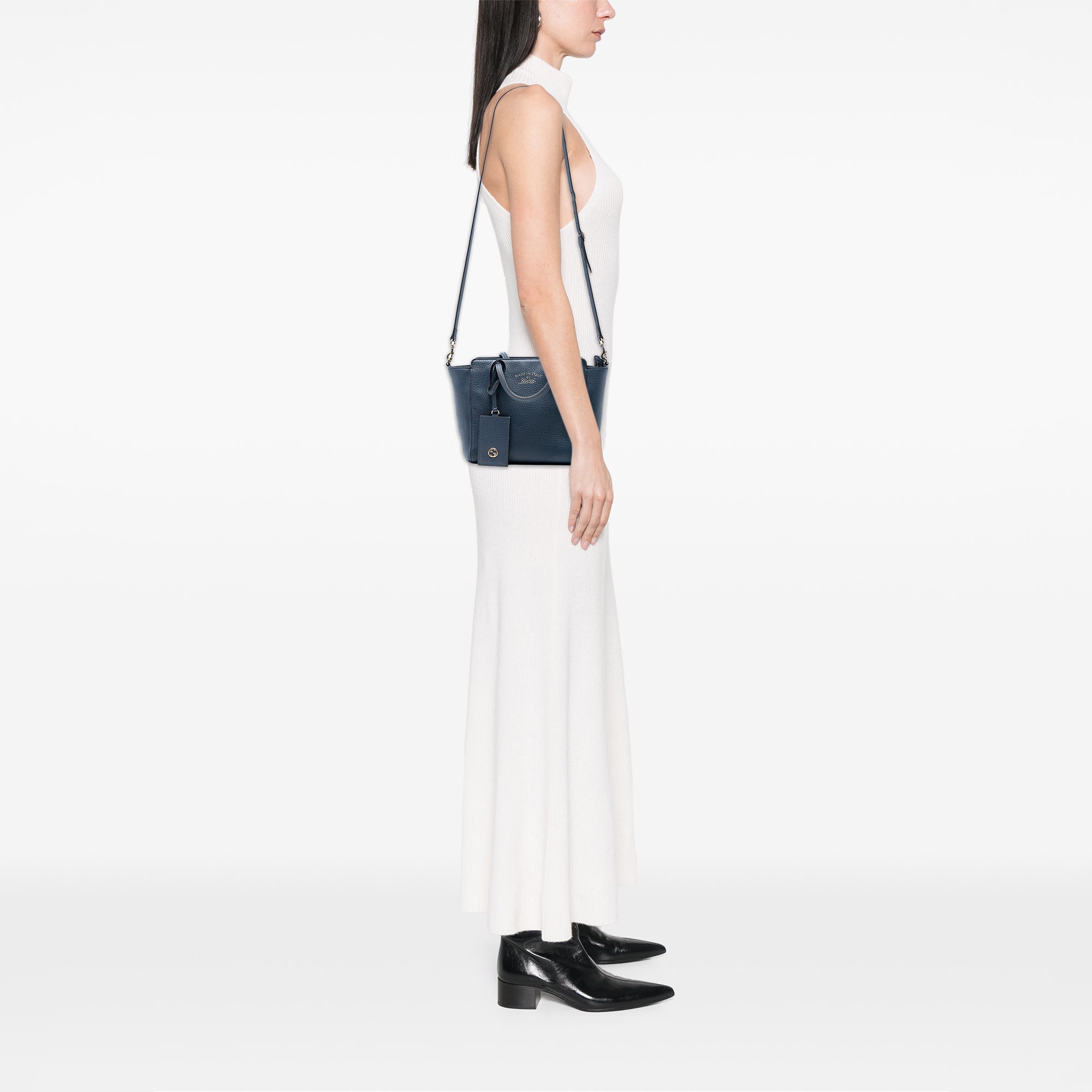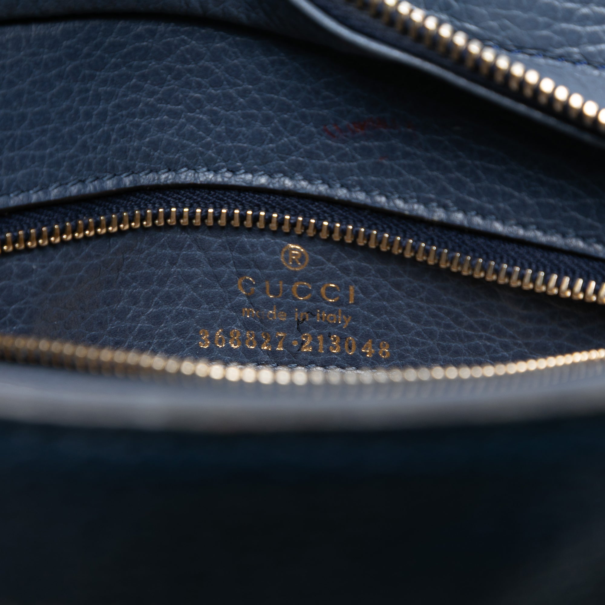Product Details: Blue Gucci Mini Leather Swing Satchel. The Mini Swing satchel features a leather body, flat leather top handles, a detachable flat leather strap, a top zip closure, and interior zip and slip pockets. 7.5" L x 8.3" W x 4.1" D, 3.3" drop. Serial number 368827·213048.
