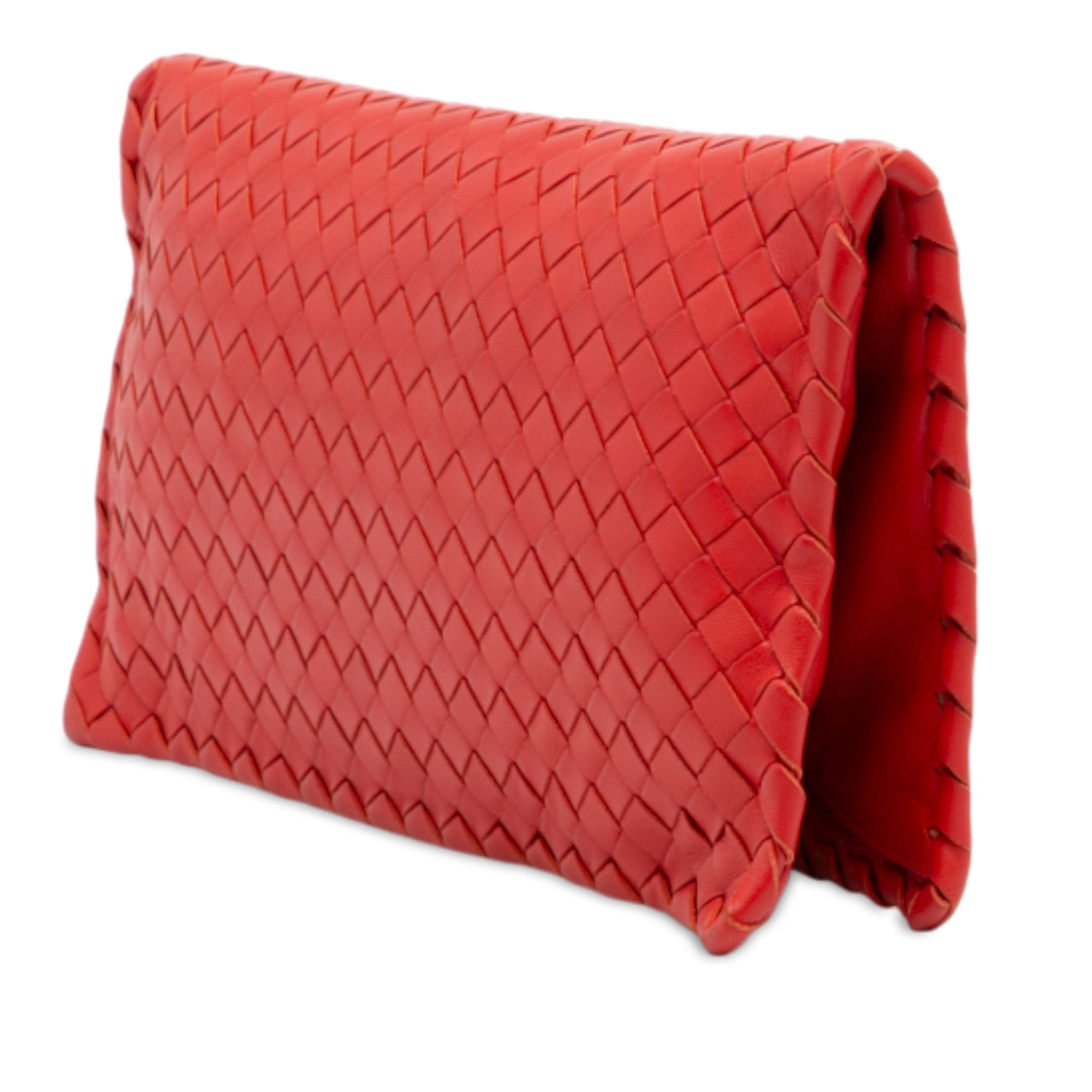 Product Details: Red Bottega Veneta Nappa Intrecciato Turn Lock Clutch. This clutch features a woven nappa leather body, a front flap with a turn lock closure, and an interior zip pocket. 6.1" L x 11.2" W x 0.8" D. Serial number B05895210C.