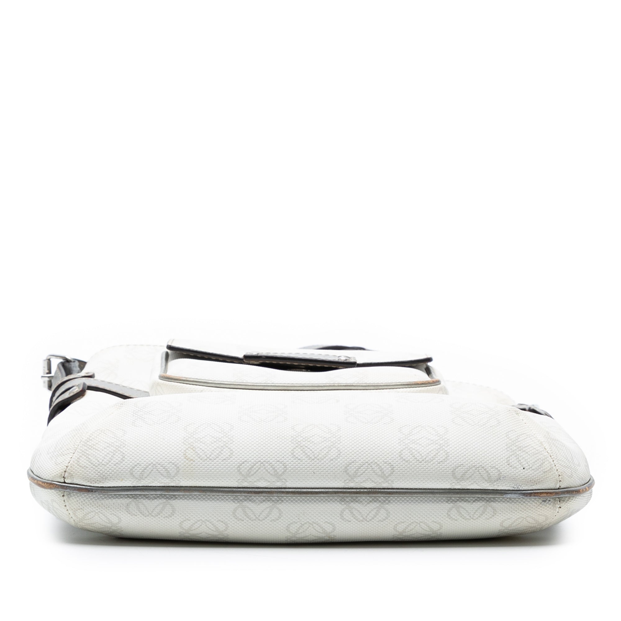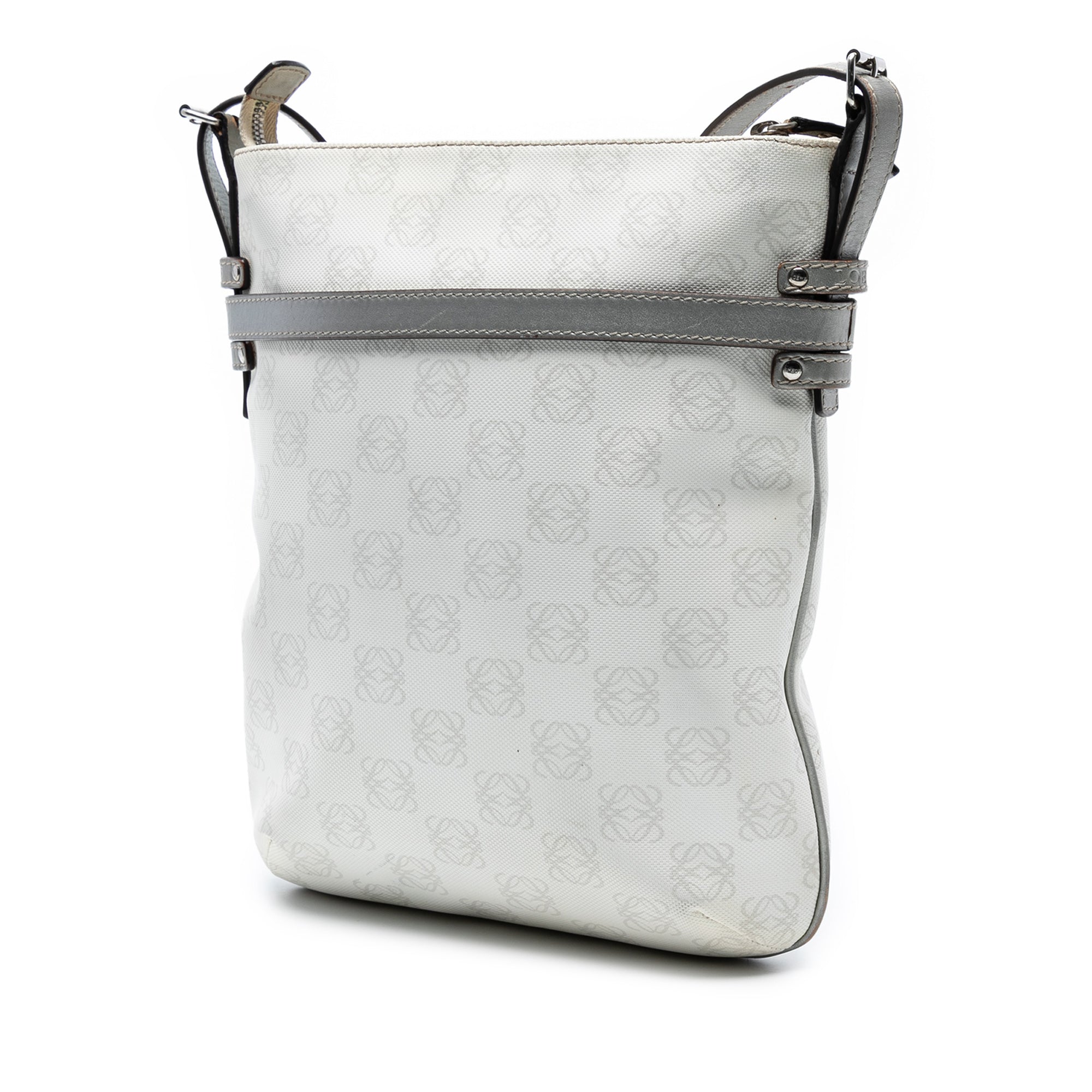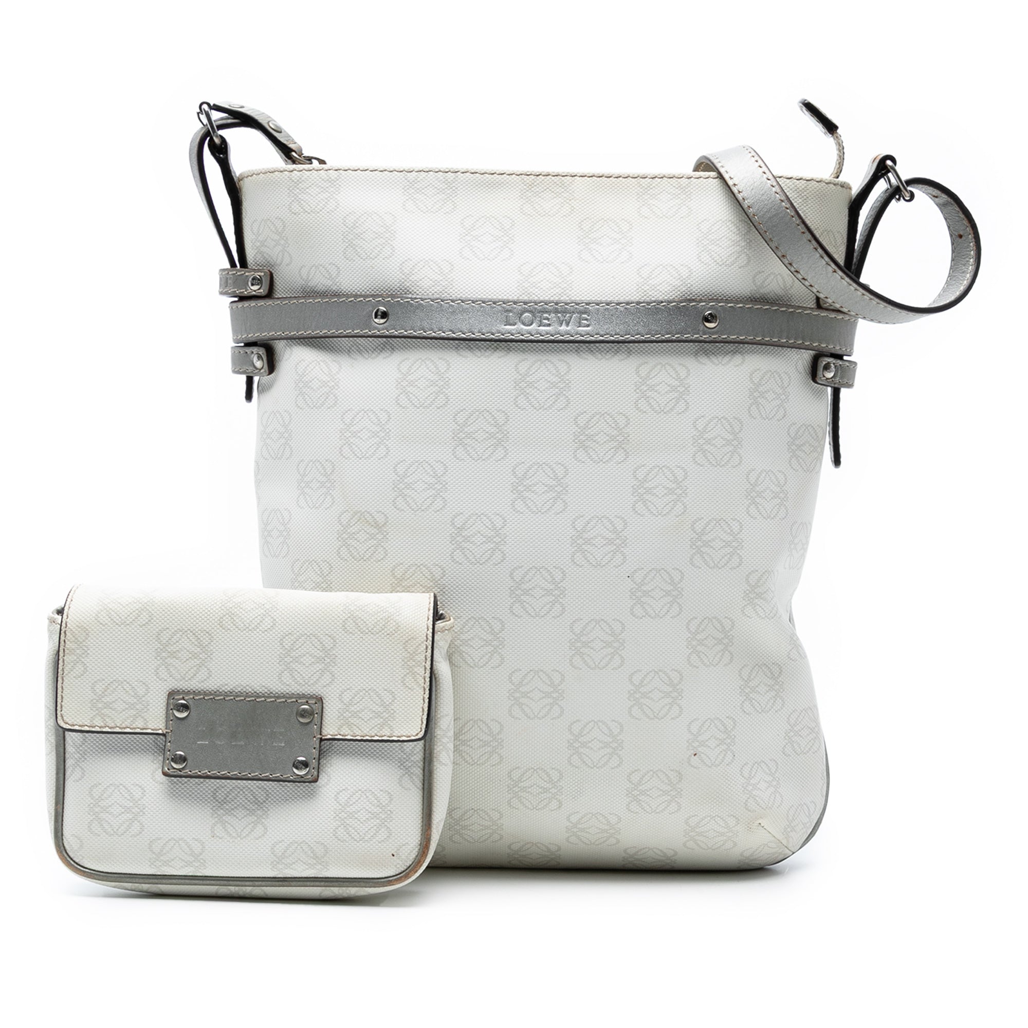 Product Details: White LOEWE Anagram Coated Canvas Crossbody. This crossbody features a coated canvas body with leather trim, a flat leather shoulder strap, a top zip closure, a detachable exterior flap pouch, and an interior zip pocket. Corners has been repainted. 10.6" L x 9.6" W x 2" D. Serial number 290711.