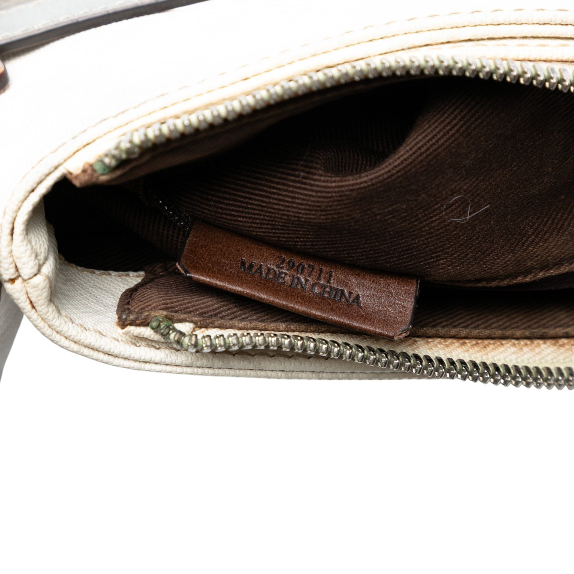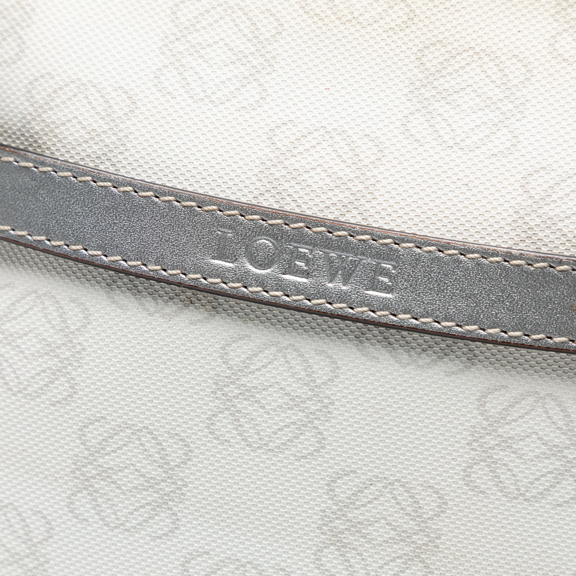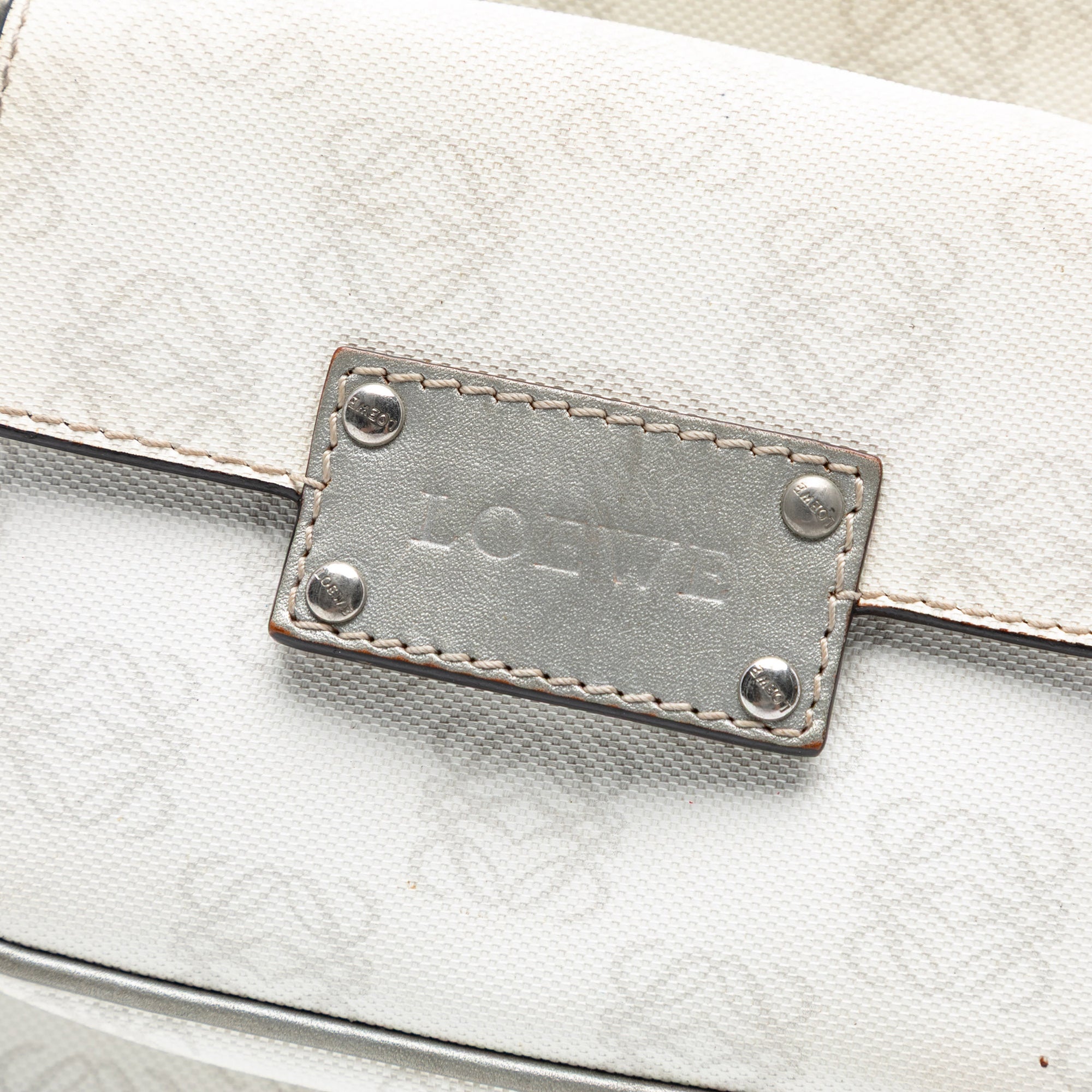 Product Details: White LOEWE Anagram Coated Canvas Crossbody. This crossbody features a coated canvas body with leather trim, a flat leather shoulder strap, a top zip closure, a detachable exterior flap pouch, and an interior zip pocket. Corners has been repainted. 10.6" L x 9.6" W x 2" D. Serial number 290711.