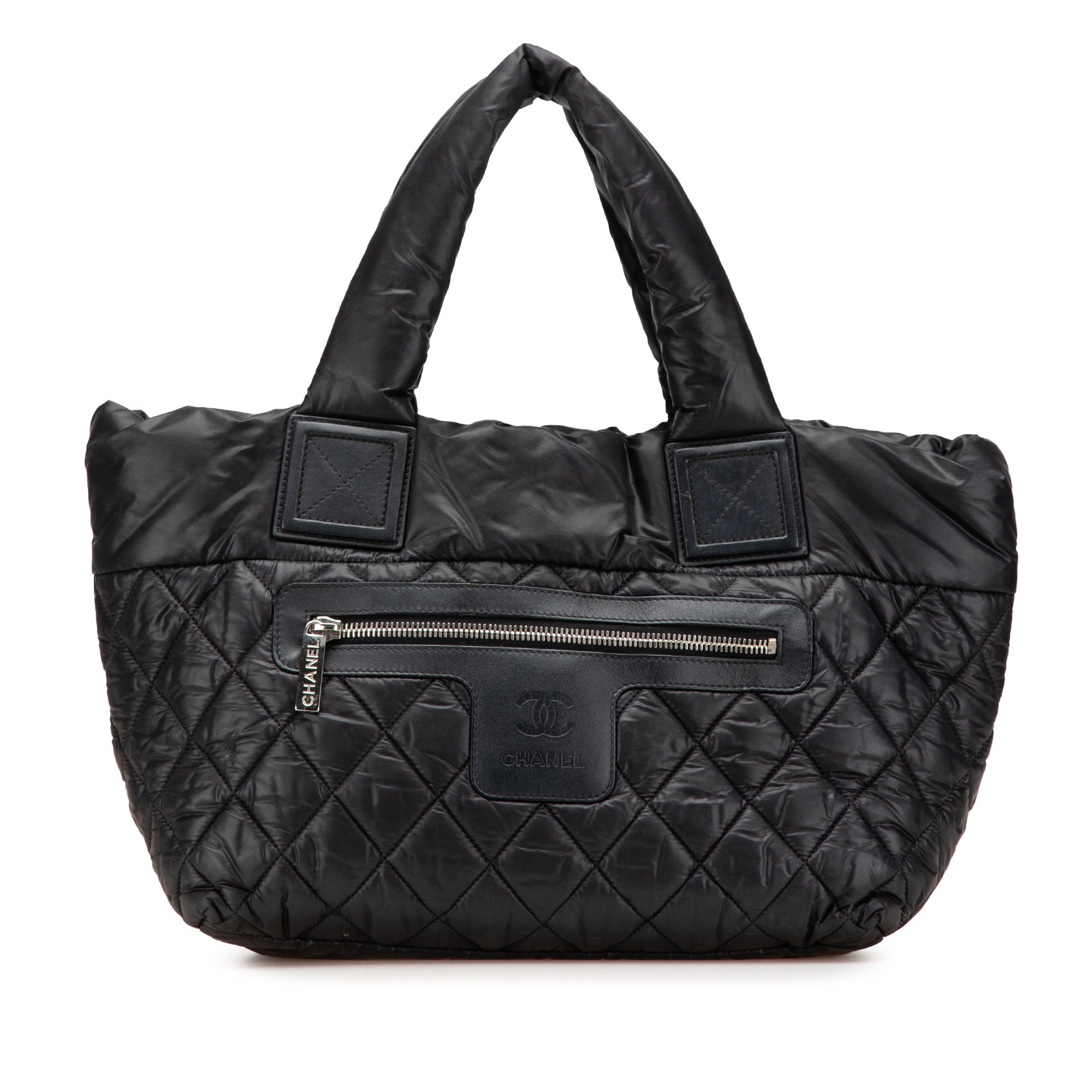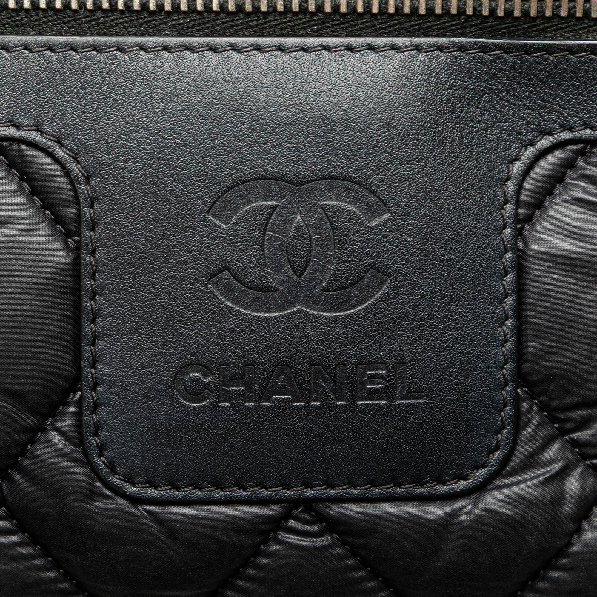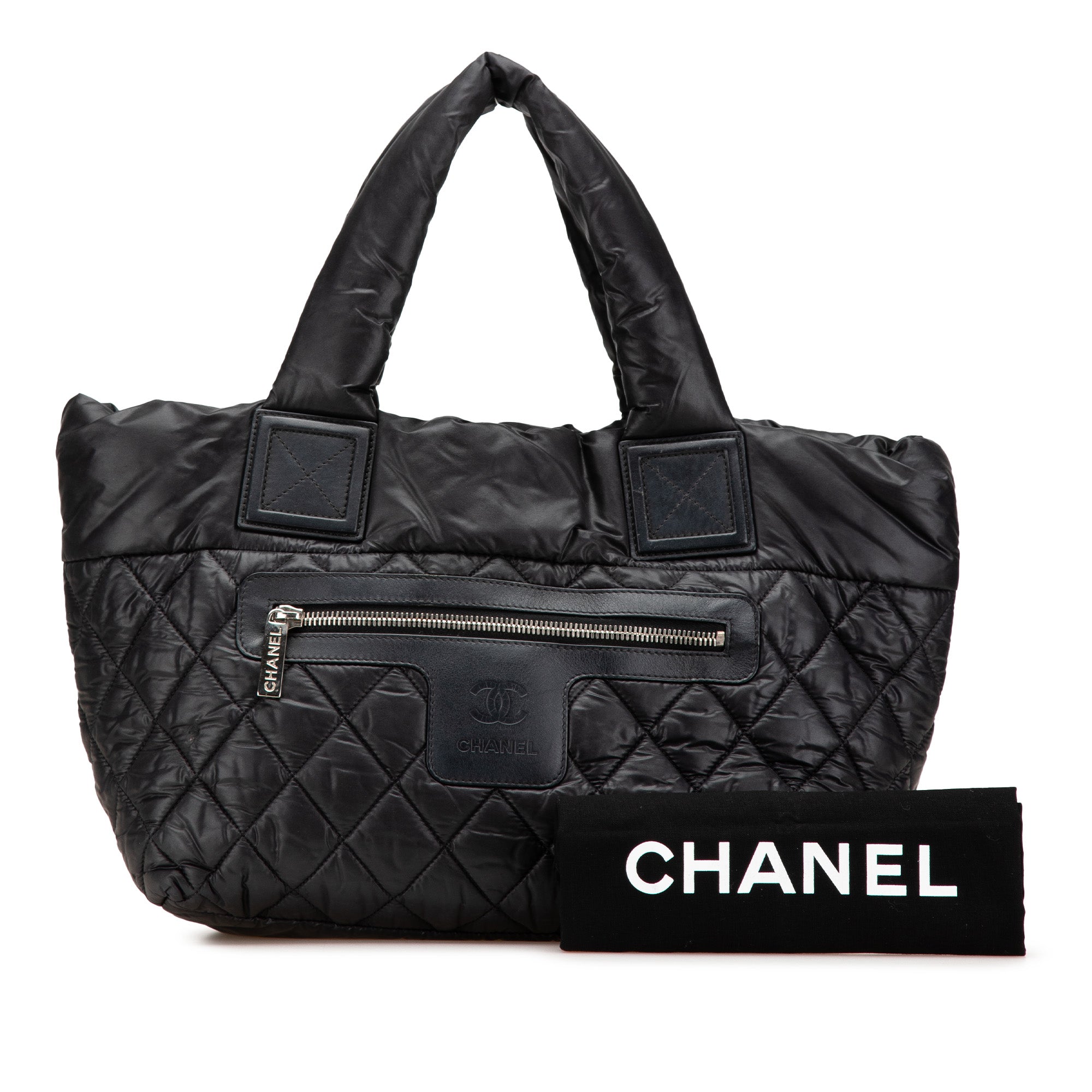 Product Details: Black Chanel Small Quilted Nylon Coco Cocoon Tote. This tote bag features a quilted nylon body, rolled handles, an open top, an exterior front zip pocket, and an interior zip pocket. 8.3" L x 11" W x 5.9" D, 5.9" drop. Serial number 18182560.
