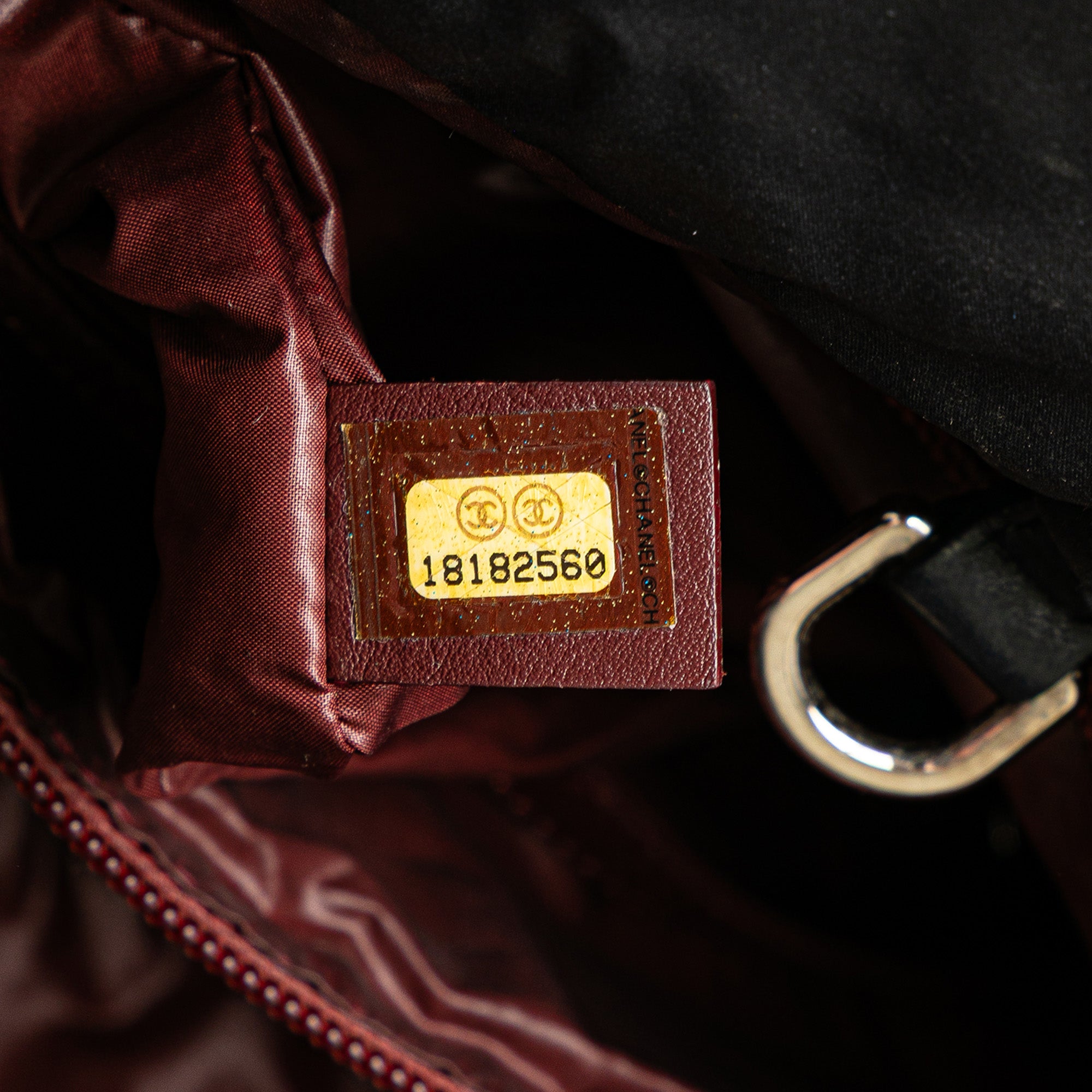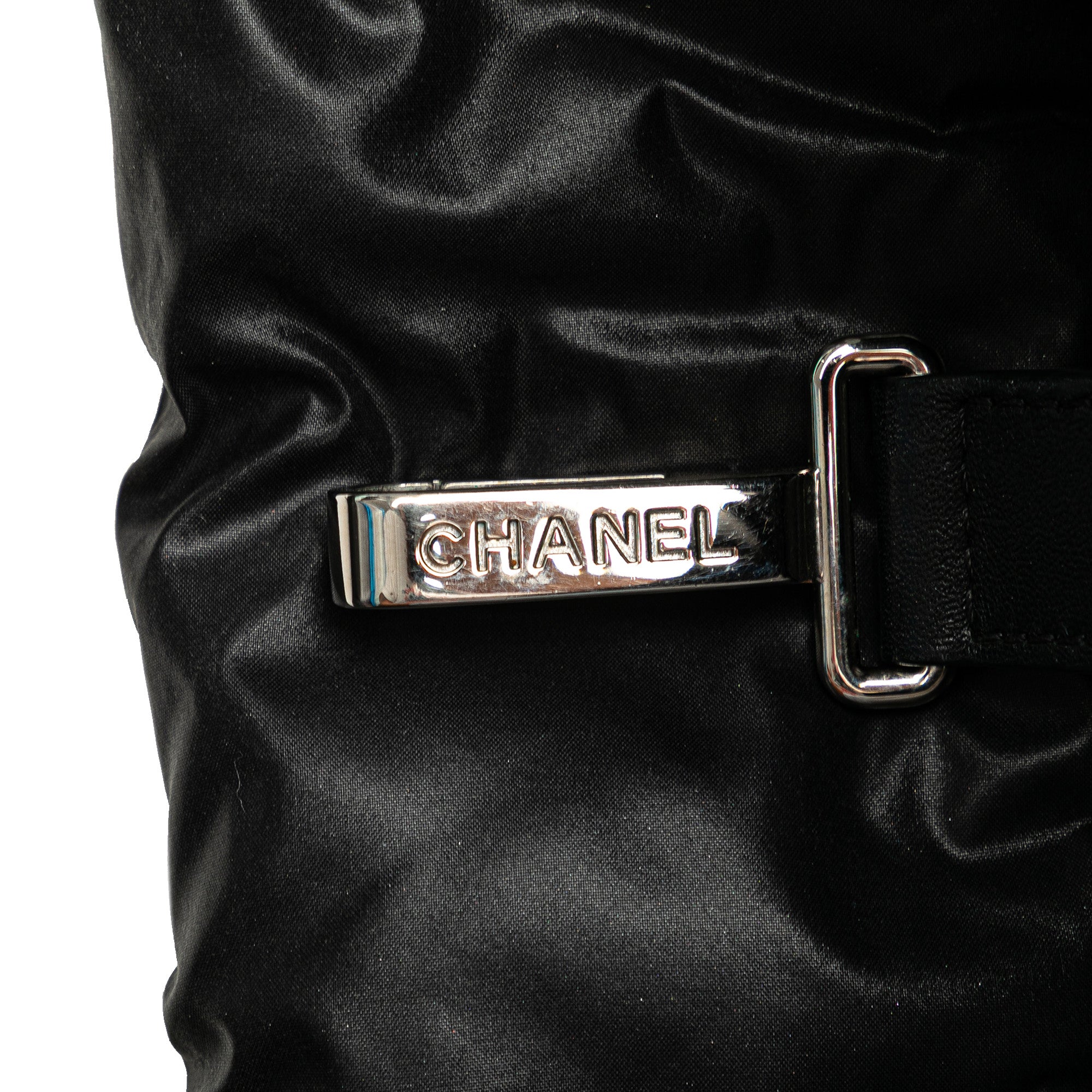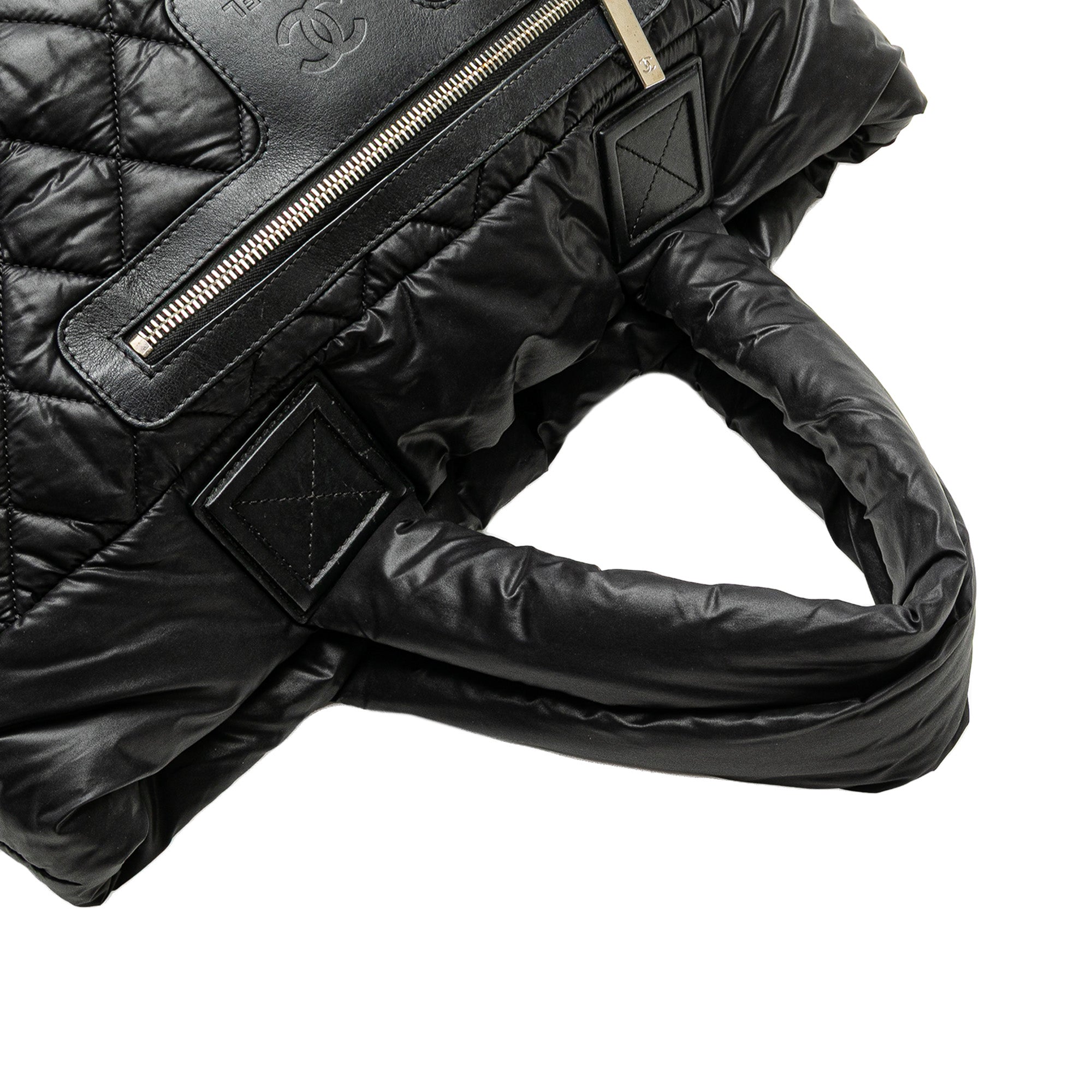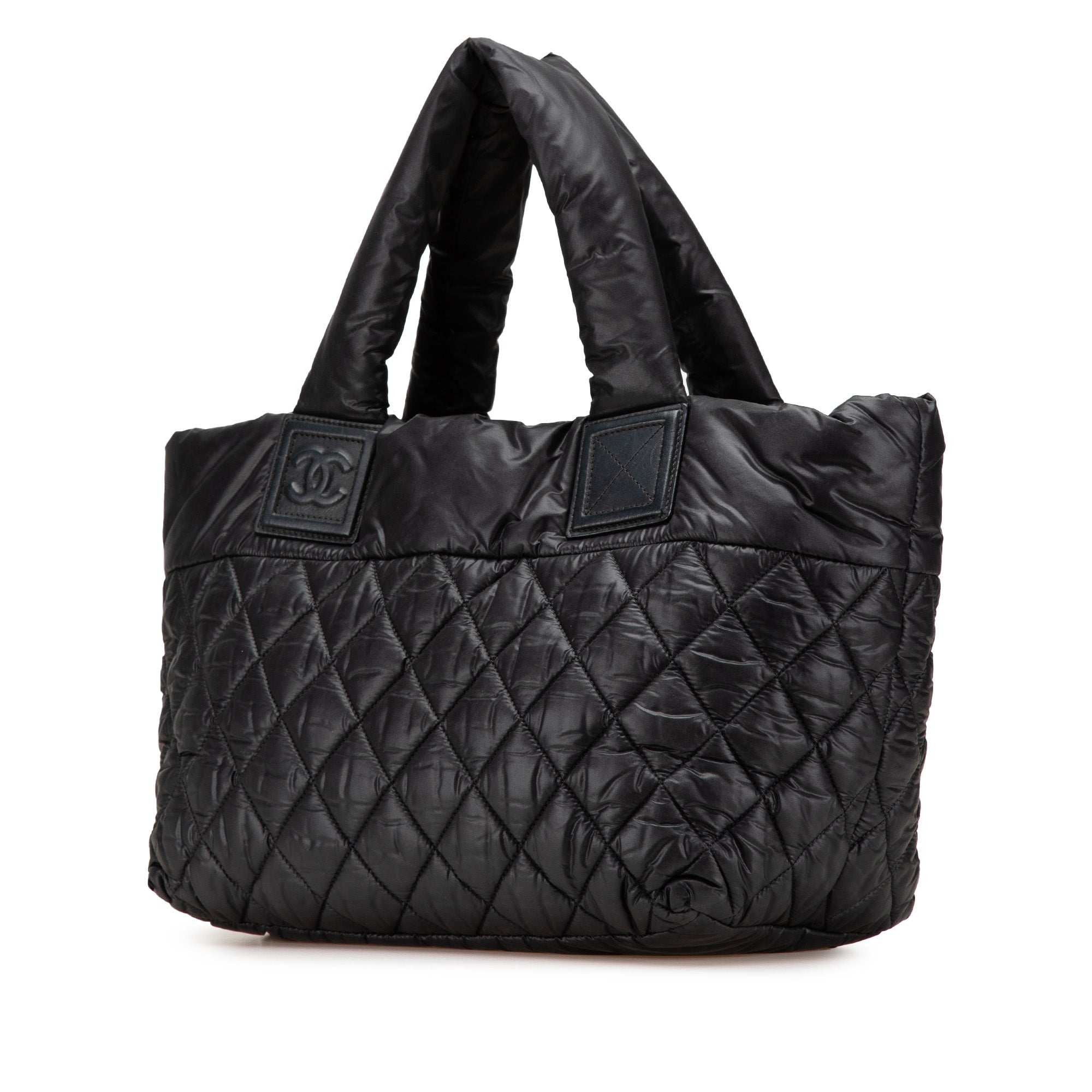 Product Details: Black Chanel Small Quilted Nylon Coco Cocoon Tote. This tote bag features a quilted nylon body, rolled handles, an open top, an exterior front zip pocket, and an interior zip pocket. 8.3" L x 11" W x 5.9" D, 5.9" drop. Serial number 18182560.