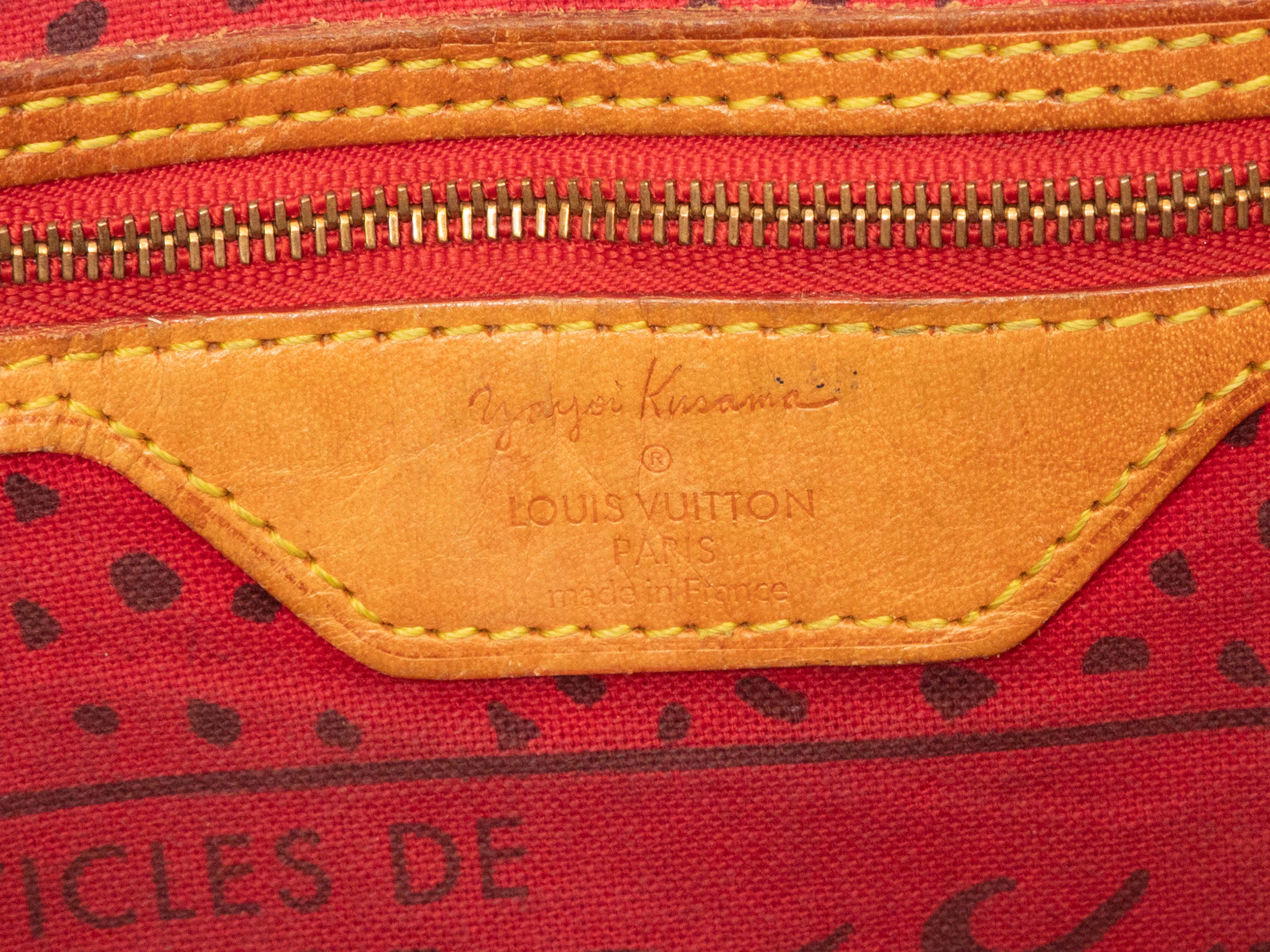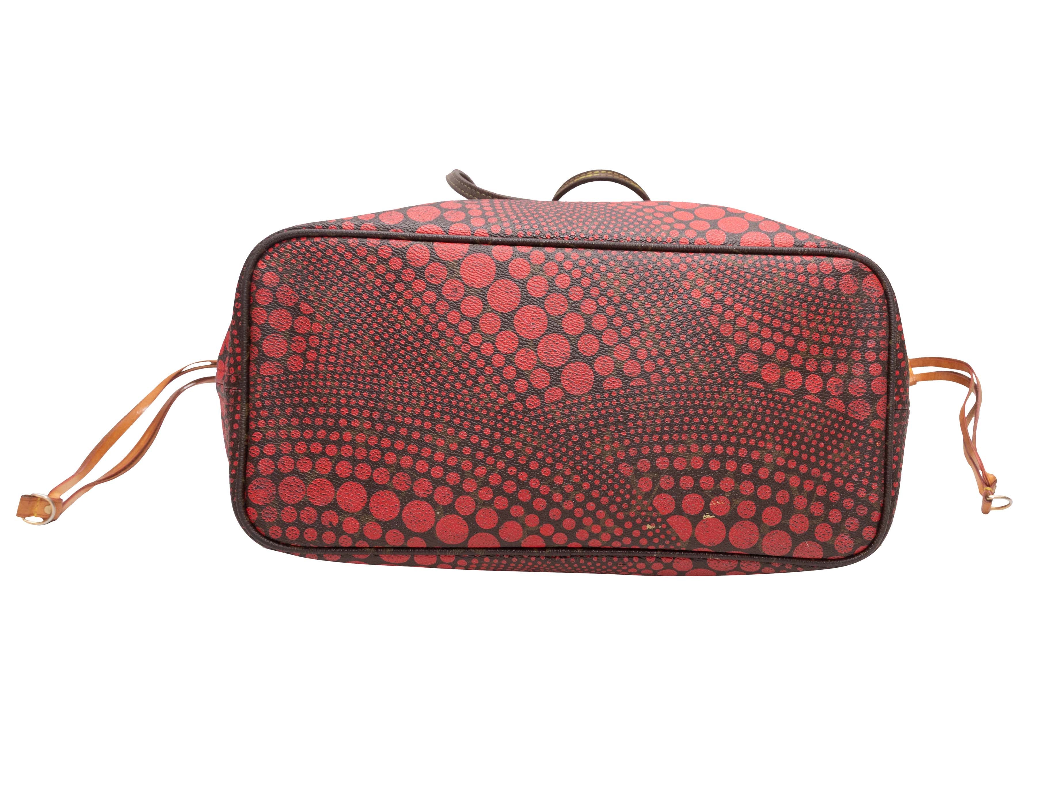 Product Details: Red & Brown Louis Vuitton Yayoi Kusama Waves Neverfull Bag. The Yayoi Kusama Waves Neverfull Bag features a printed coated canvas body, leather trim throughout, and dual flat shoulder straps. 18" L x 10.5" H x 4" D, 9.5" shoulder strap drop.