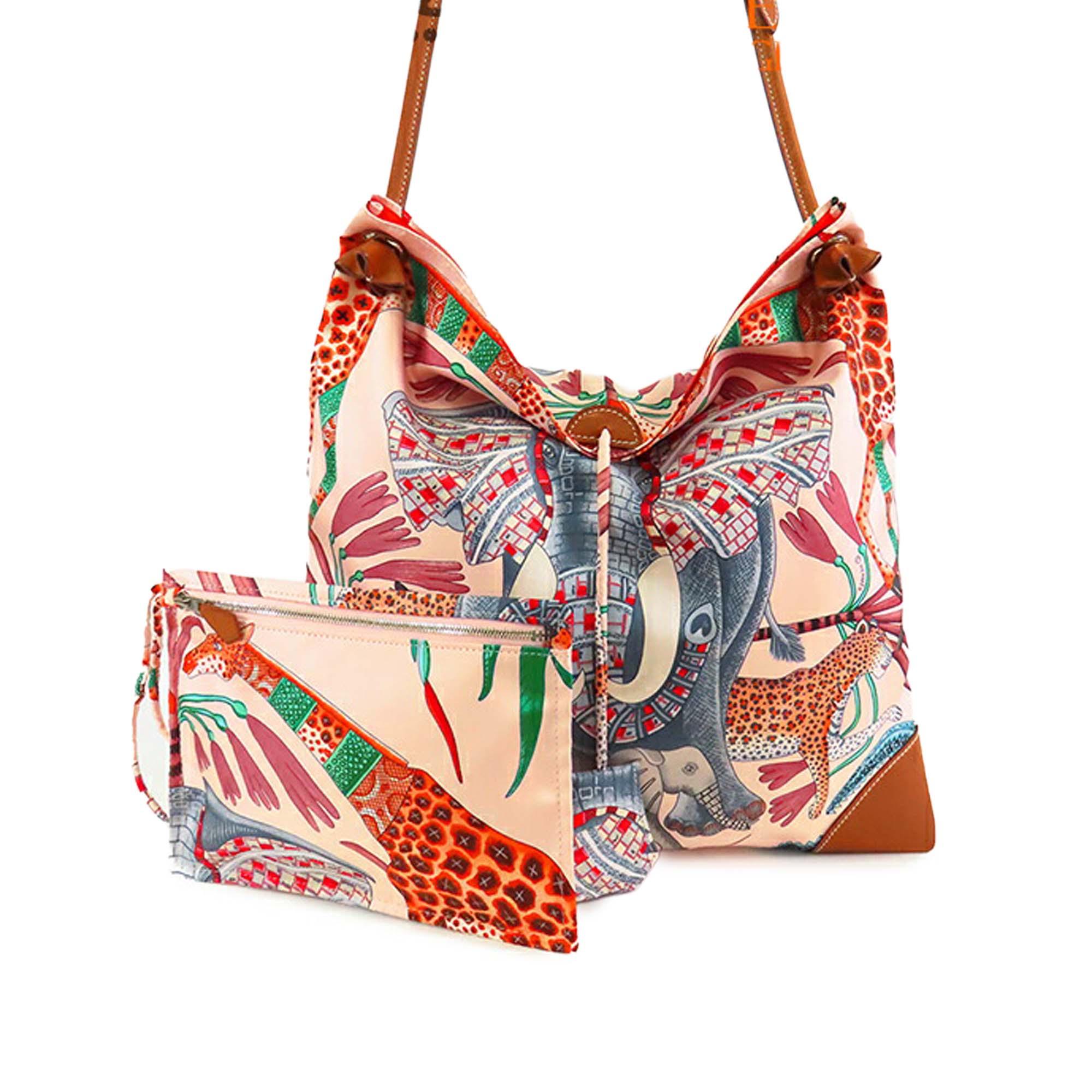 Product Details: Pink Hermès Silk La Marche Du Zambeze Silky City 33 Crossbody Bag. The Silky City features a printed silk body with leather trim, an adjustable flat leather strap, an open top, and pouch inclusion. 13" L x 13" W x 0.5" D. Serial number X.