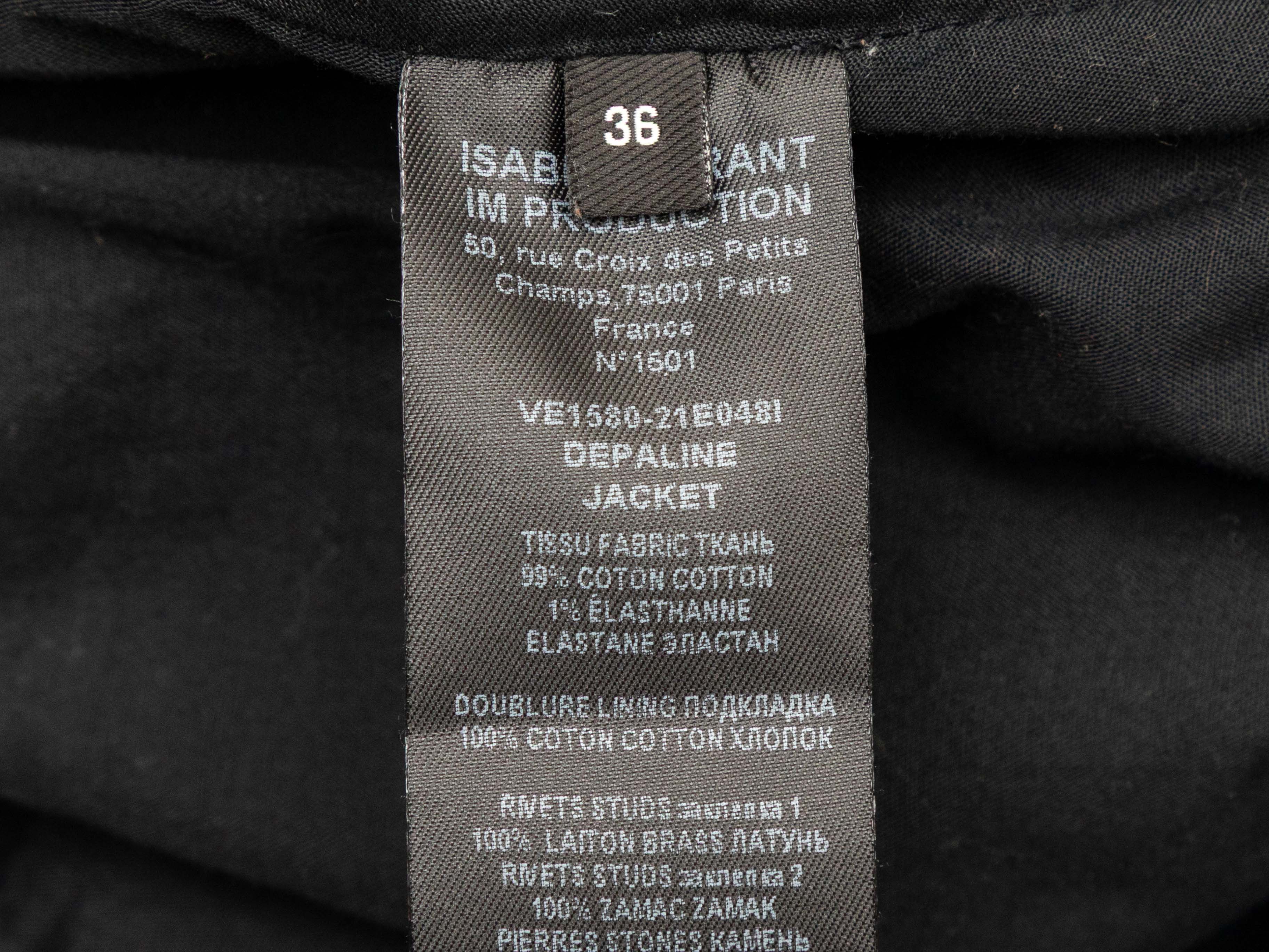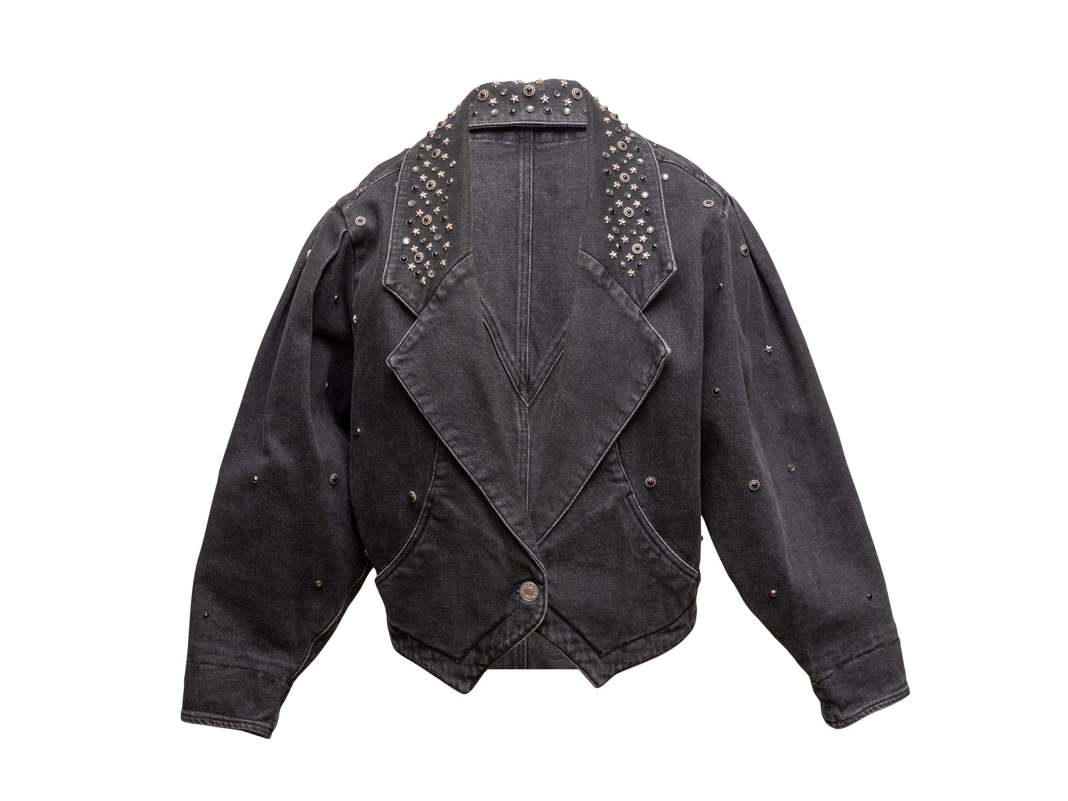 Product Details: Black single button denim jacket by Isabel Marant. Notched lapel. Stud embellishments throughout. Dual hip pockets. Front button closure. 32" bust, 18" shoulder width, 22" sleeve length, 25" length.