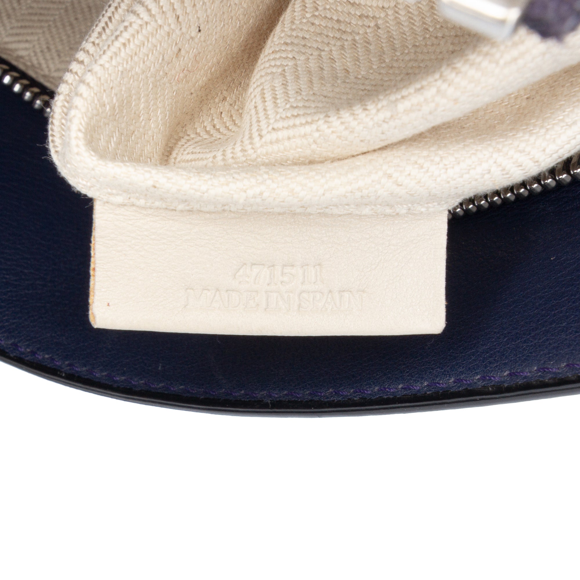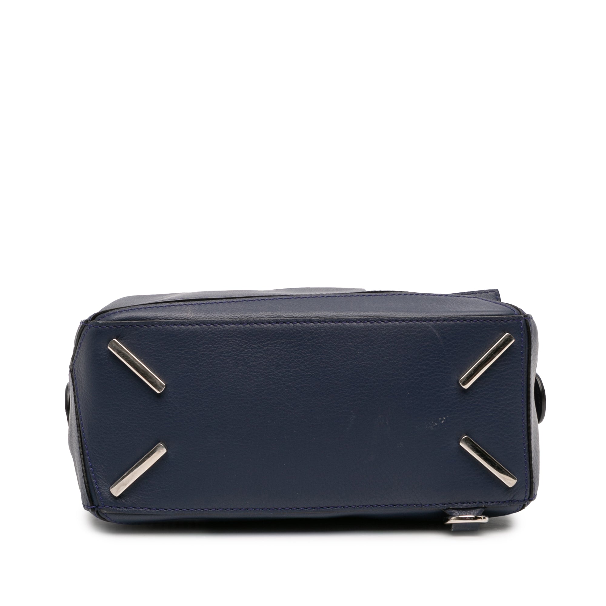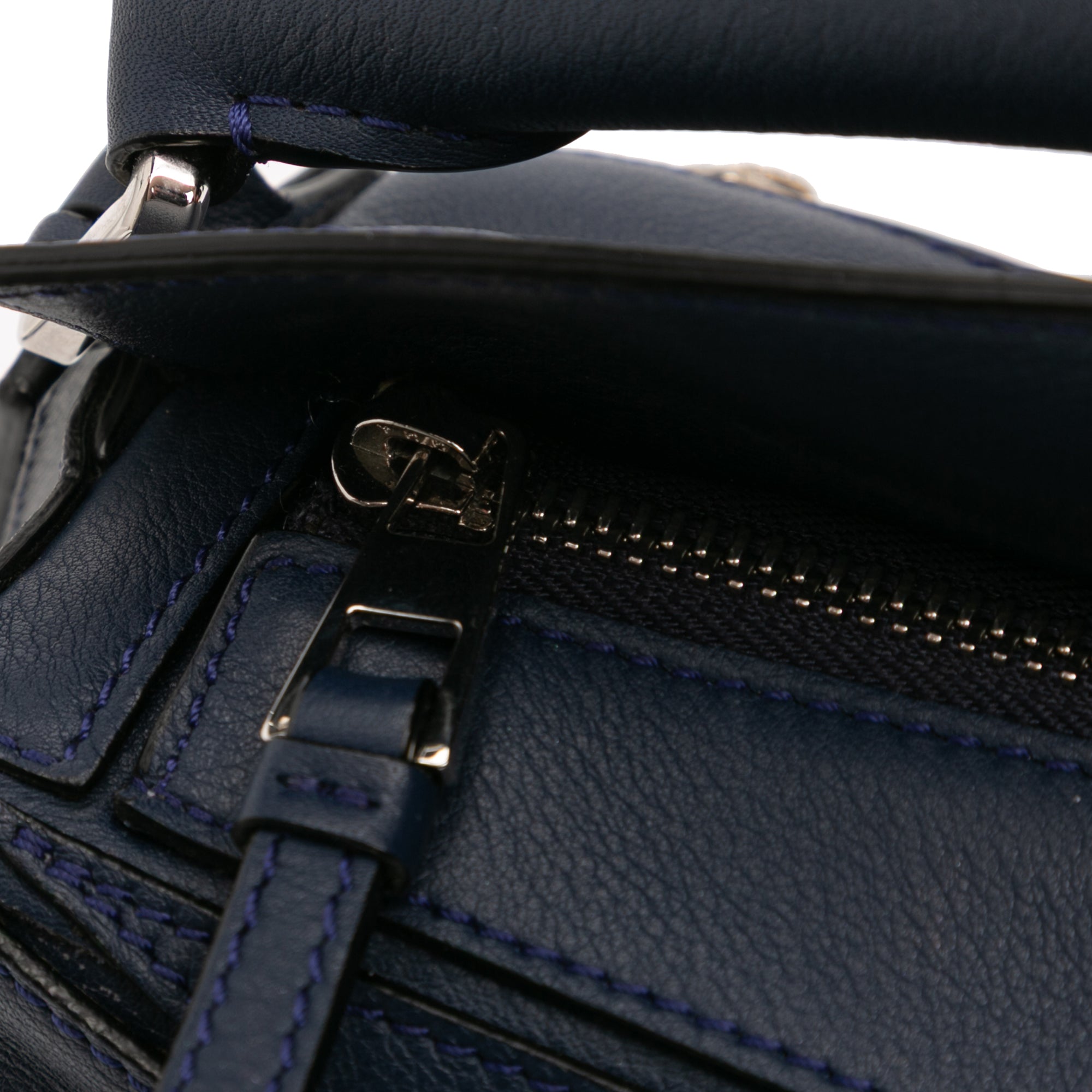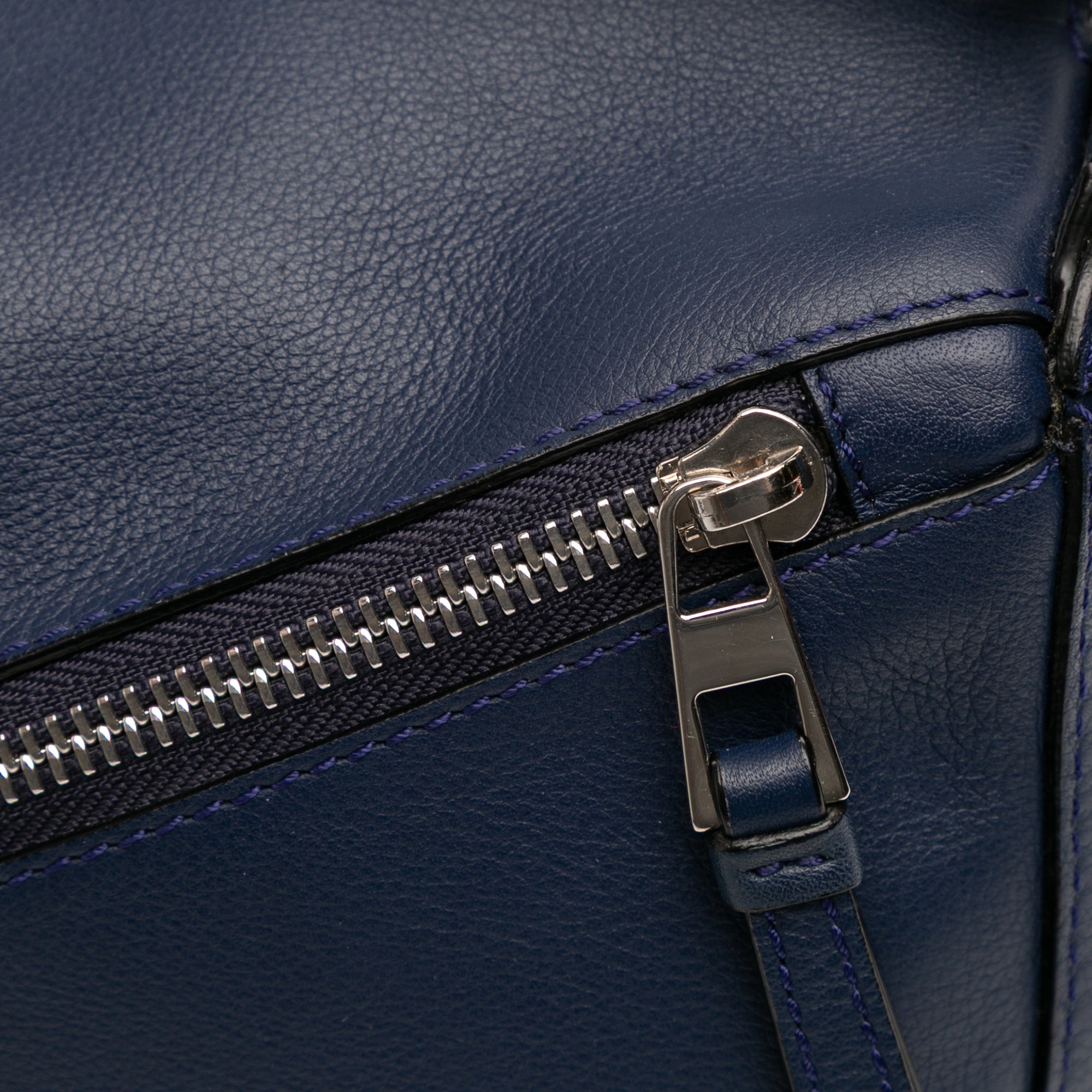 Product Details: Blue LOEWE Small Calfskin Puzzle Satchel. The Puzzle bag features a leather body, a rolled leather top handle, a flap and top zip closure, an exterior back zip pocket, and interior slip pockets. 6.3" L x 9.4" W x 3.9" D, 2.4" drop. Serial number 471511.
