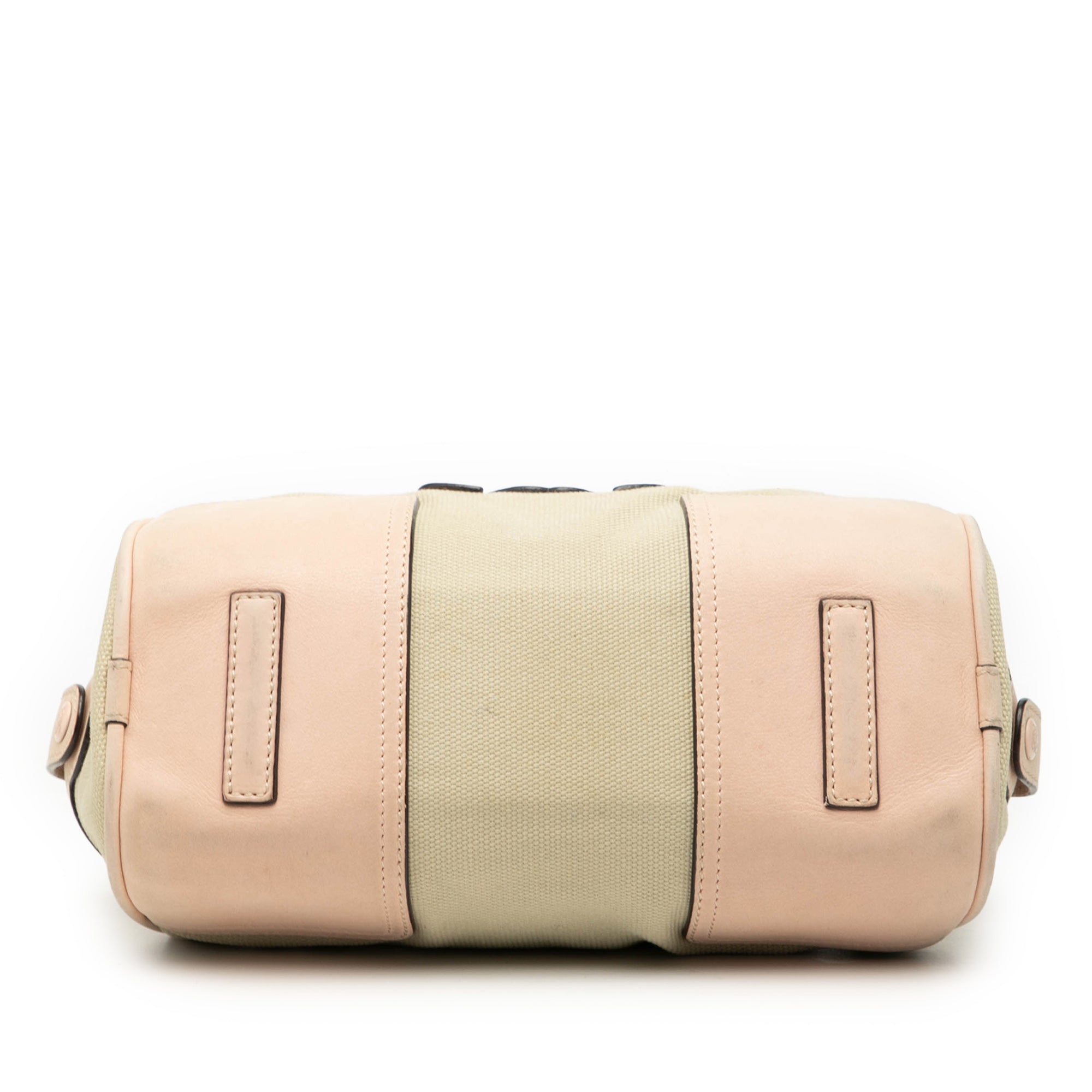 Product Details: Tan LOEWE Mini Anagram Canvas Barrel Bag Satchel. This handbag features a canvas body with leather trim, flat canvas and leather handles, a dual top zip closure, and an interior zip pocket. 5.5" L x 9.8" W x 5.5" D, 7.9" drop. Serial number 350701.