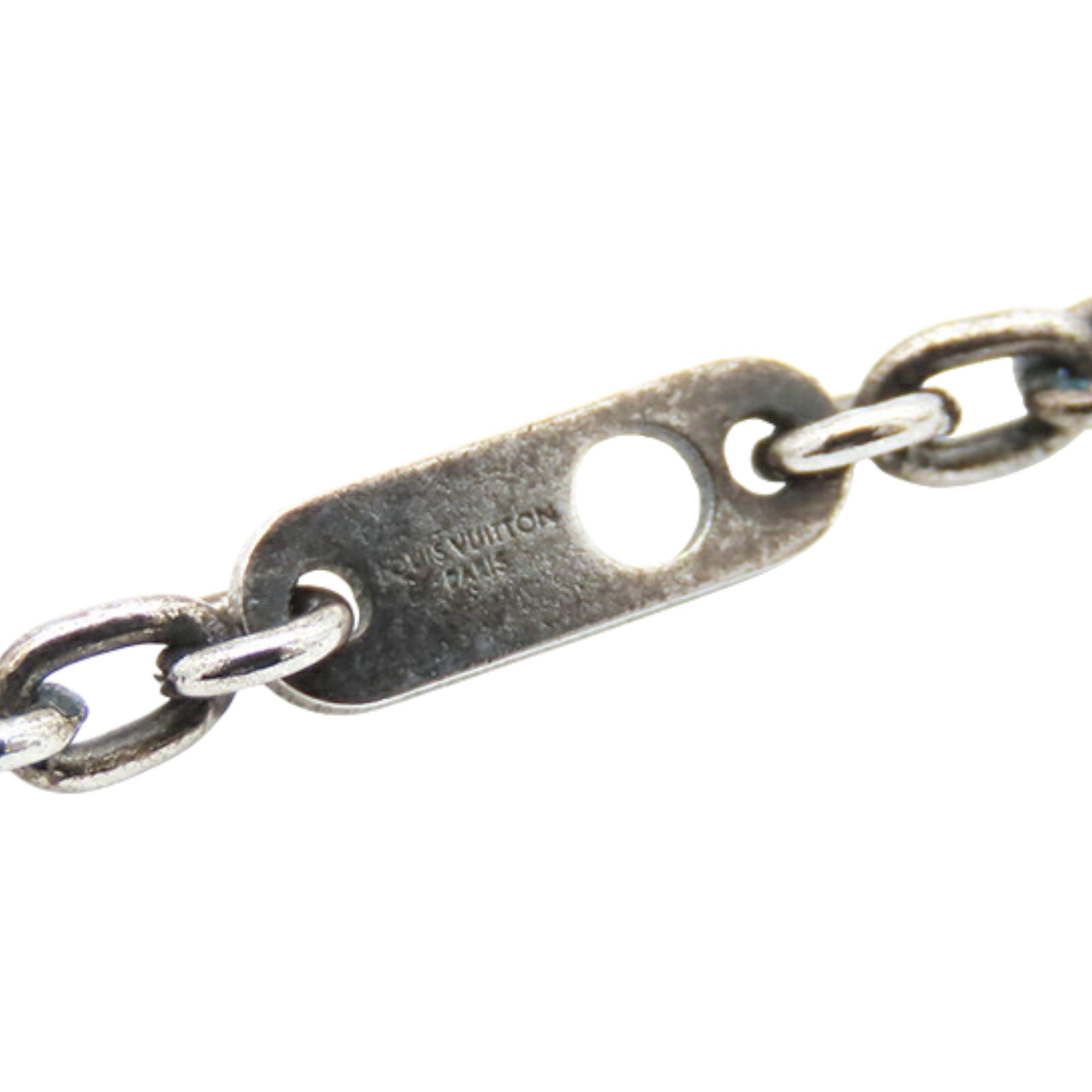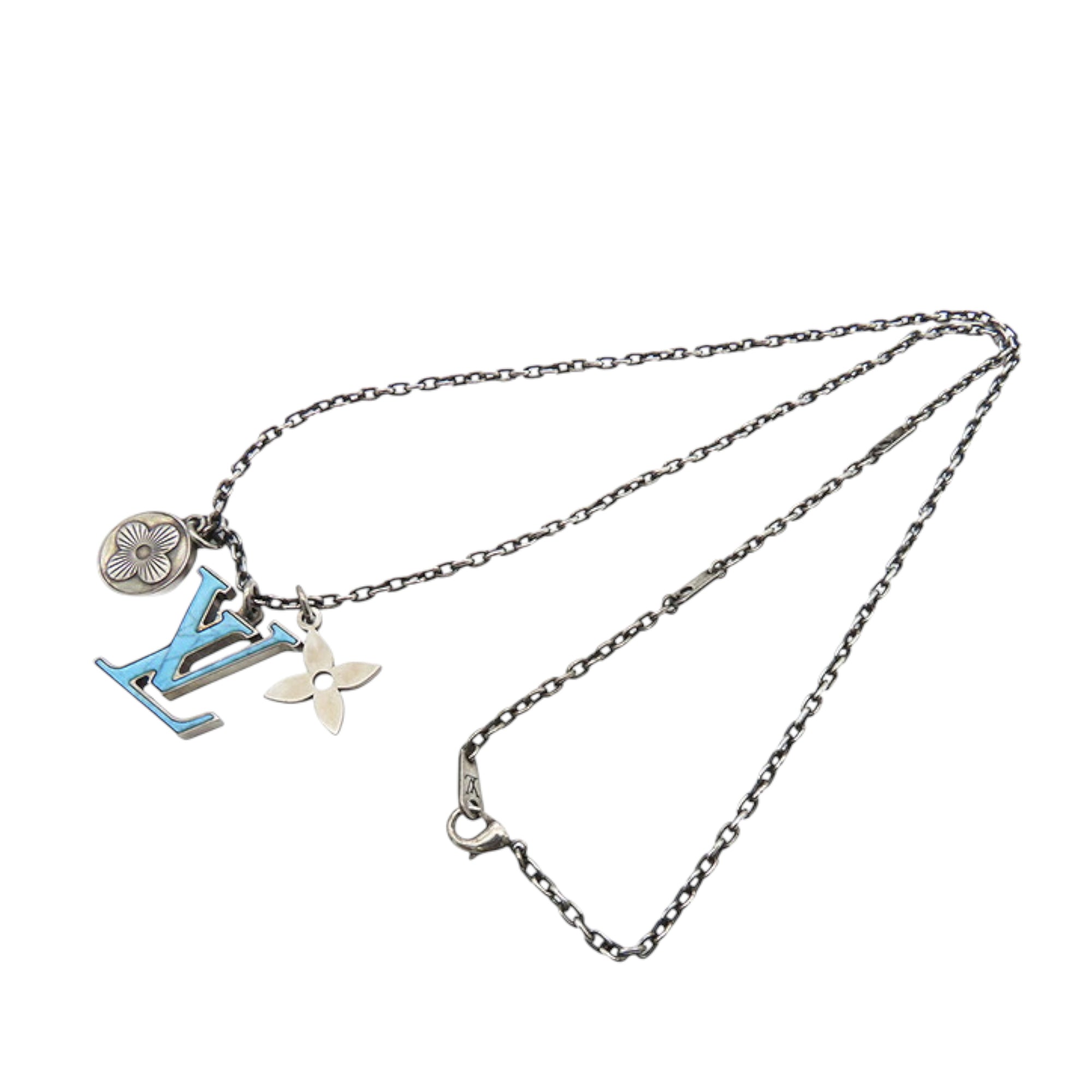 Product Details: Silver Louis Vuitton Silver Plated and Resin LV Initiales Pendant Necklace. This necklace features a silver plated chain and charms, a logo pendant with resin detail, and a lobster clasp closure. 25.6" L x 0.8" W x 0" D.