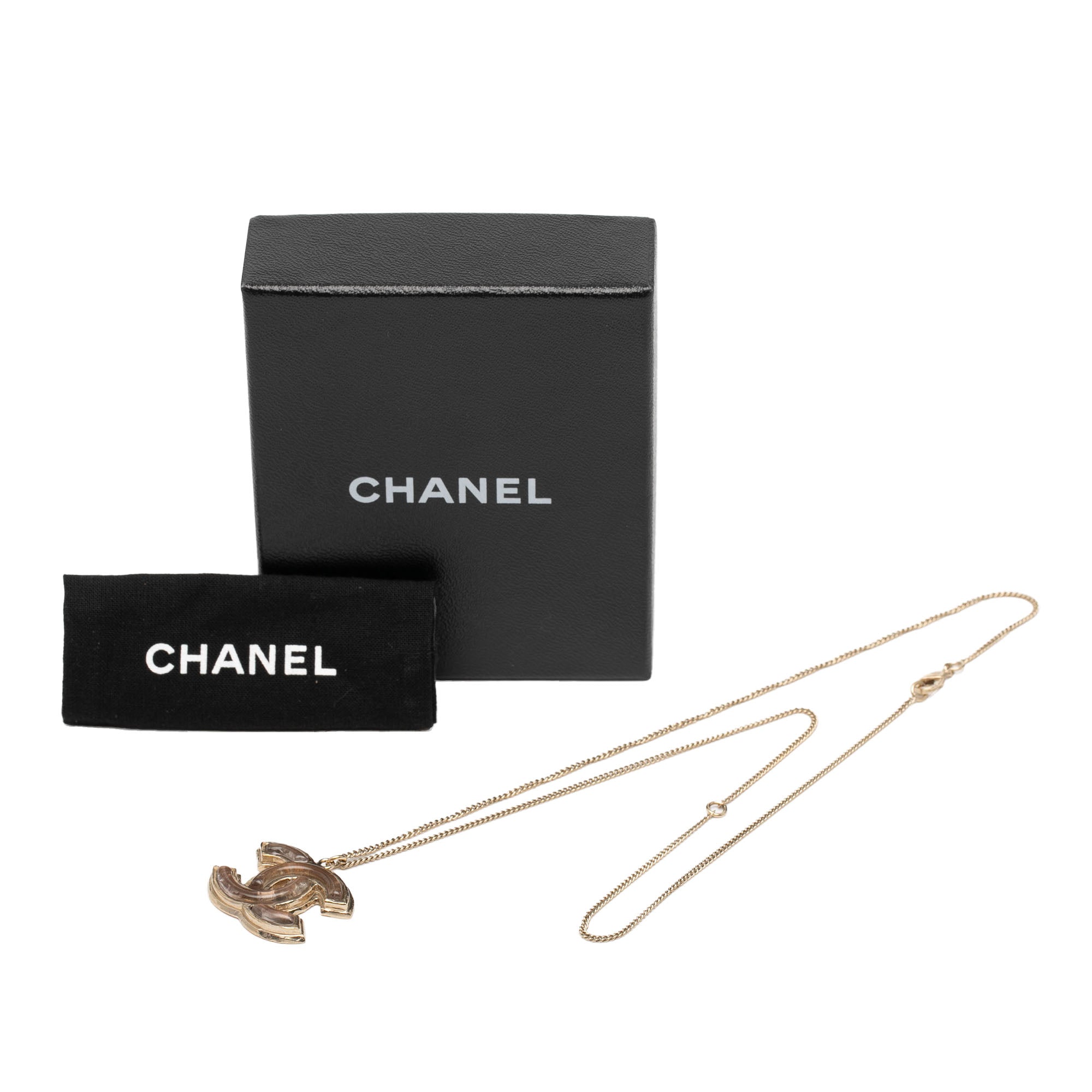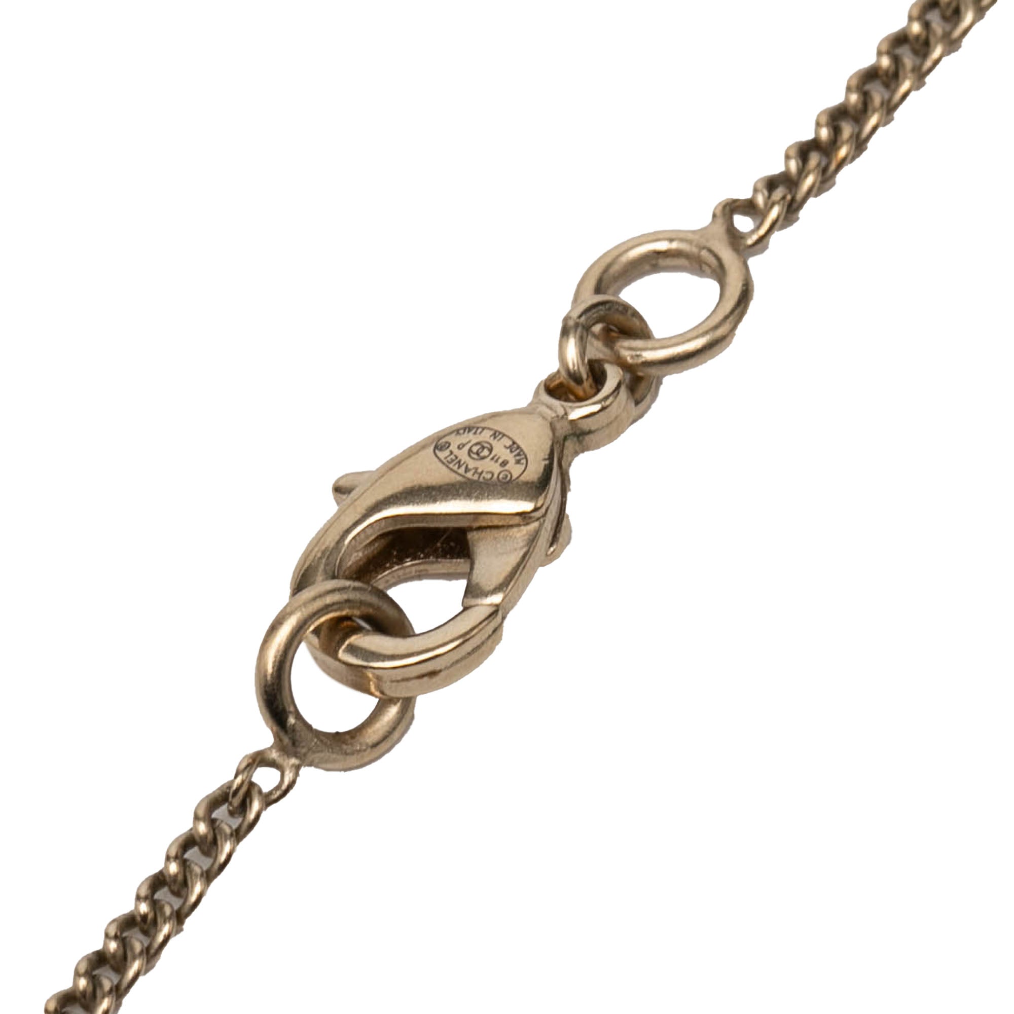 Product Details: Gold Chanel Gold Plated Gripoix CC Pendant Necklace. This necklace features a gold tone metal body, a pendant with glass embellishments, and a lobster clasp closure. 23.9" L x 1.2" W x 0" D. Serial number B11P.