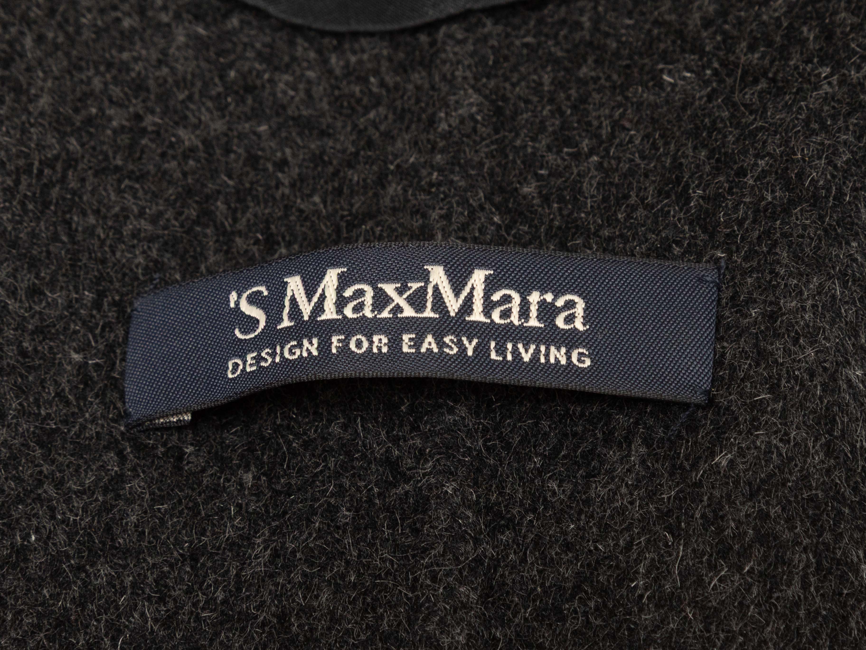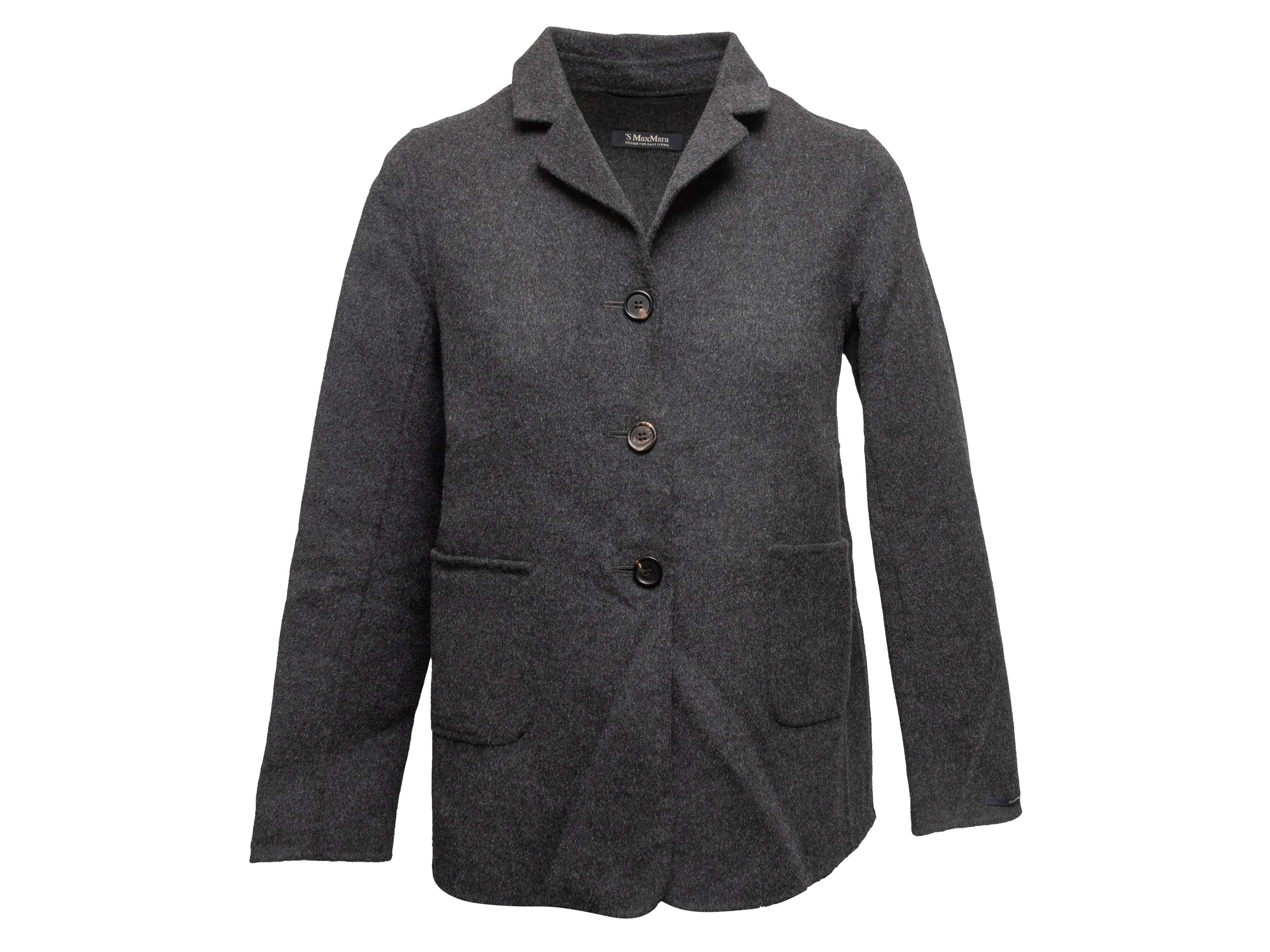 Product Details: Charcoal wool jacket by 'S Max Mara. Notched lapel. Dual hip pockets. Button closures at front. 36" bust, 18" shoulder width, 25" length.