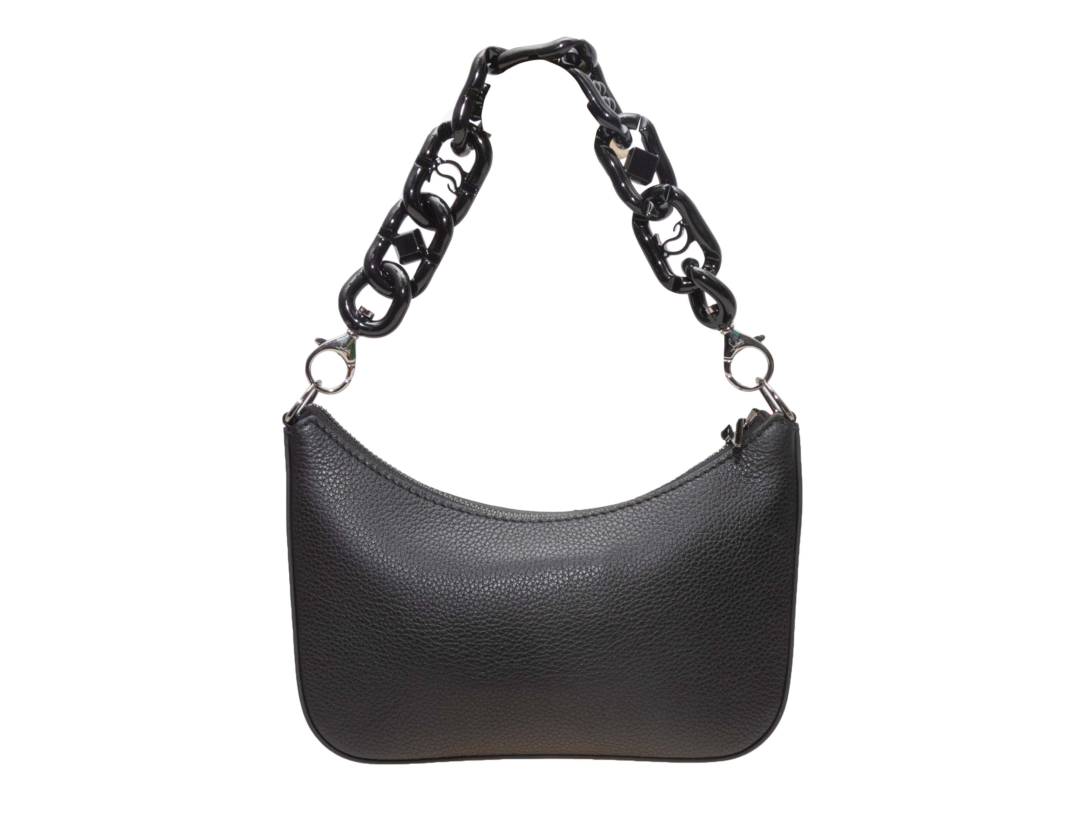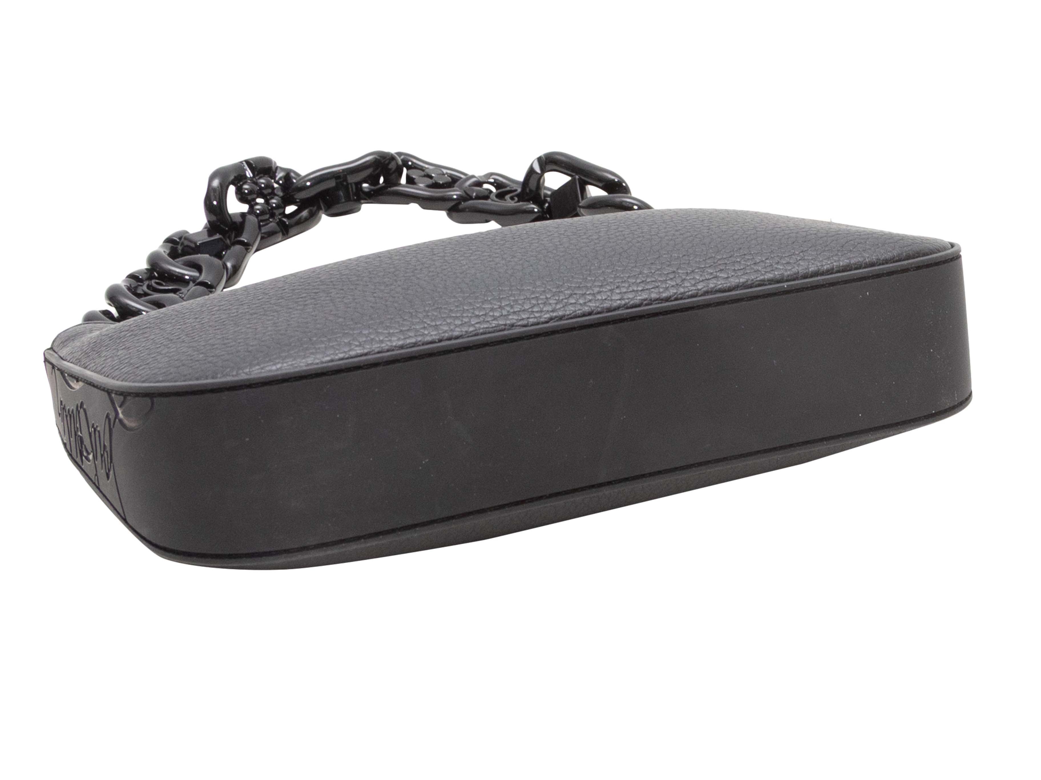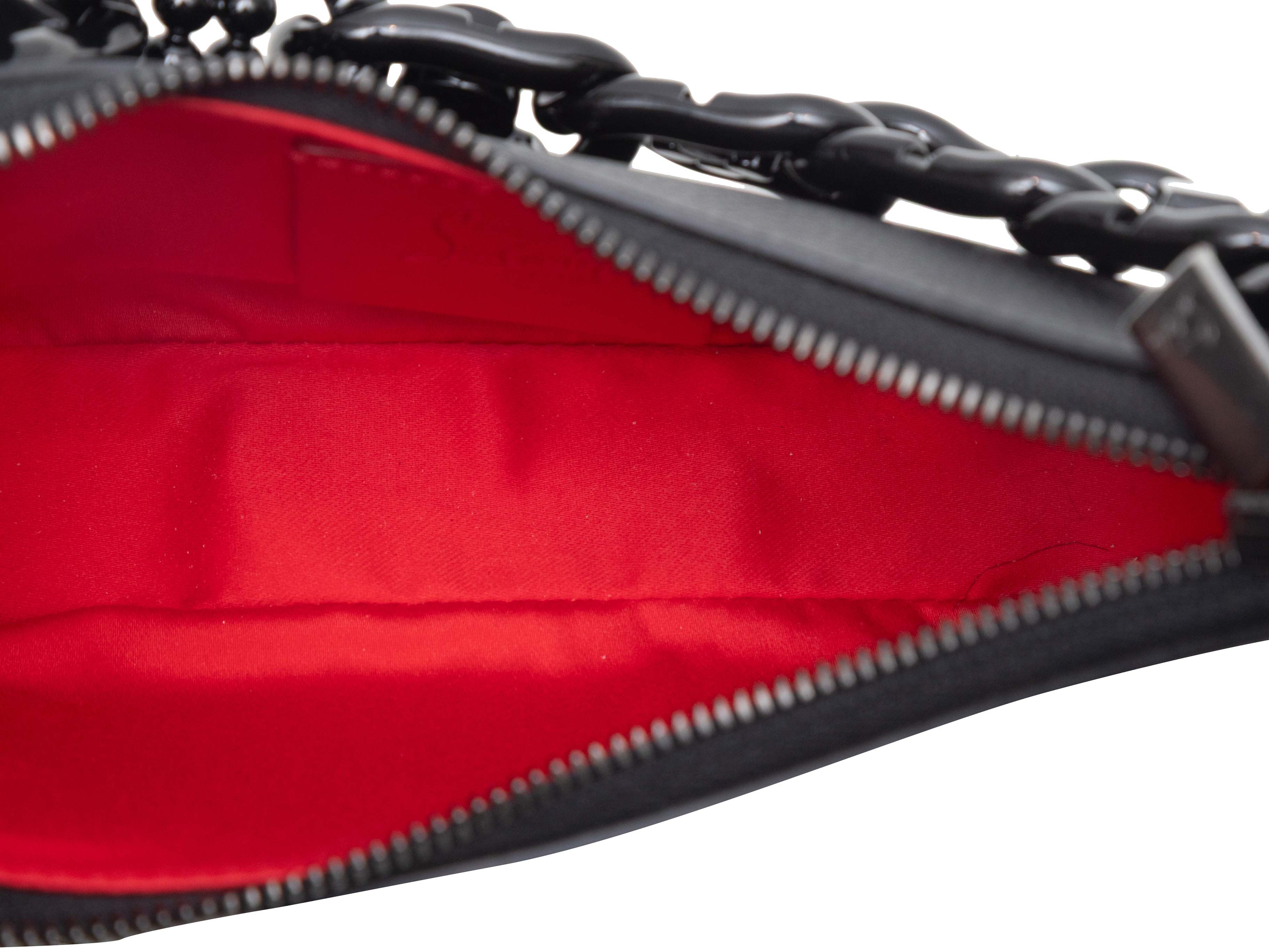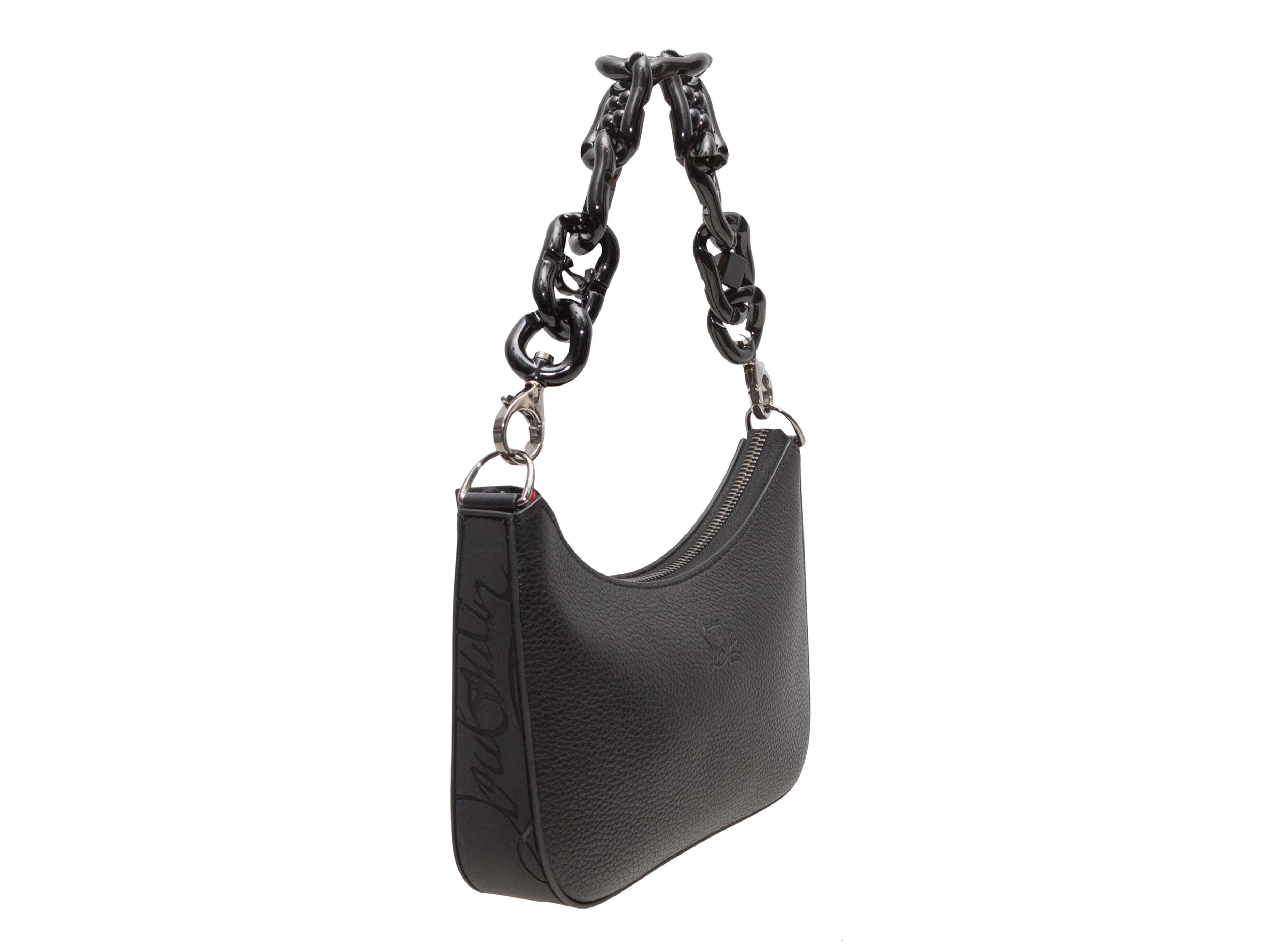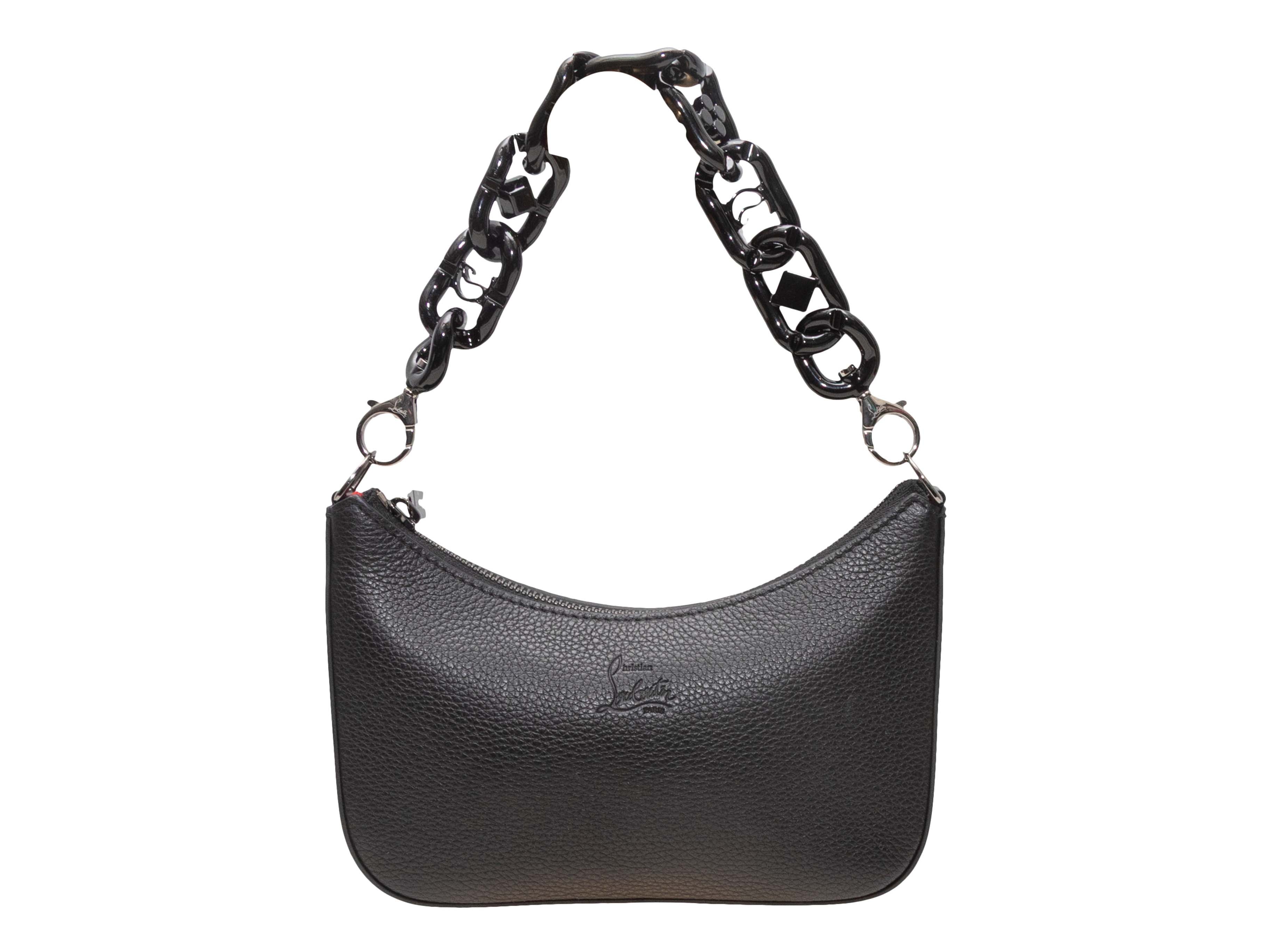 Product Details: Black Christian Louboutin Mini Shoulder Bag. This shoulder bag features a leather body, silver-tone hardware, a gunmetal chain-link shoulder strap, and top zip closure. 8" L x 5" H x 1.5" D, 7" shoulder strap drop.