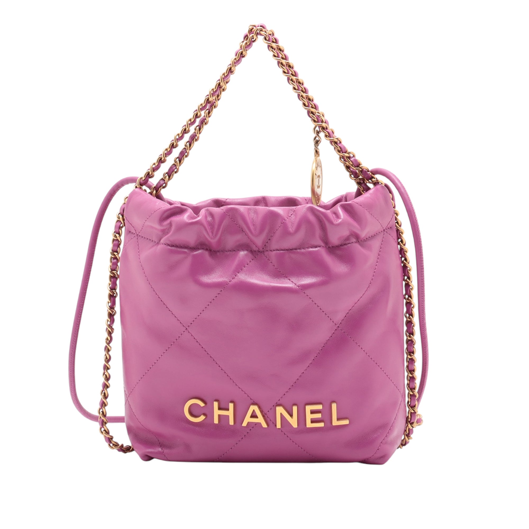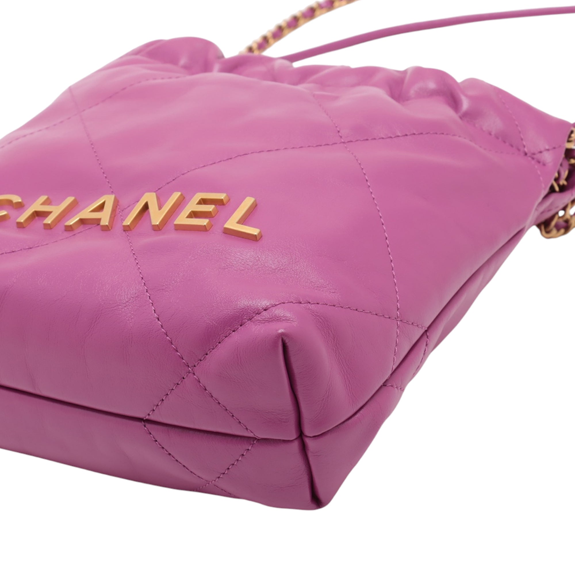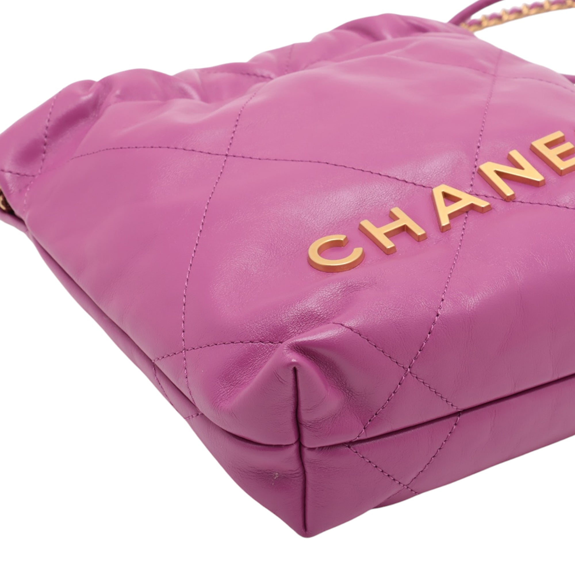 Product Details: Magenta Chanel Mini Shiny Calfskin 22 Handbag Satchel. This satchel features a quilted leather body, leather woven chain straps, a rolled leather shoulder strap, an open top with magnetic closure, and an interior slip pocket. 7.5" L x 6.5" W x 2.2" D, 4.5" drop. Serial number EAT9HUG7.